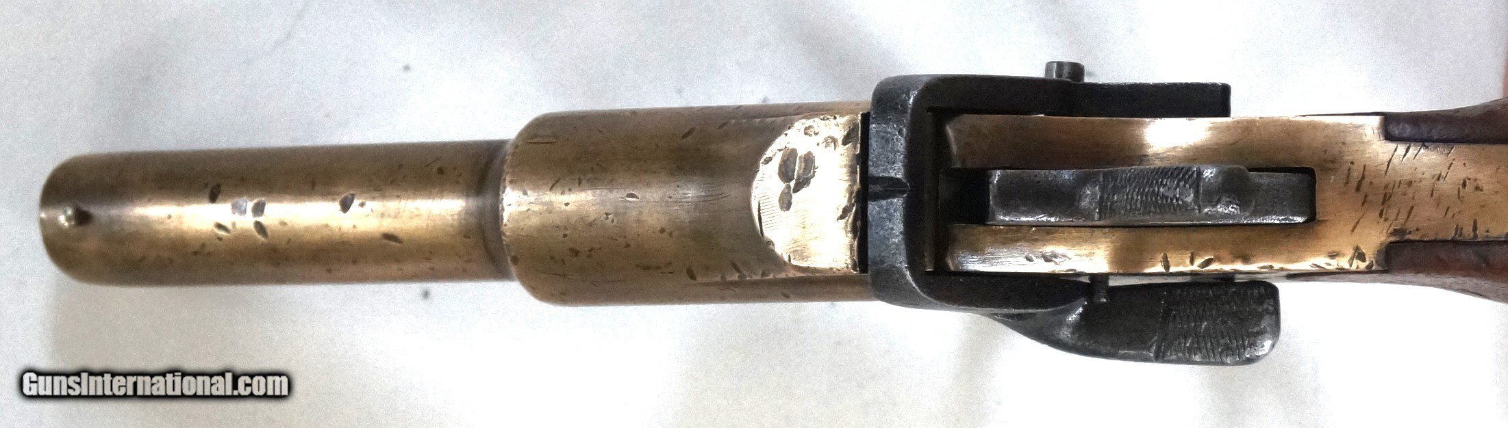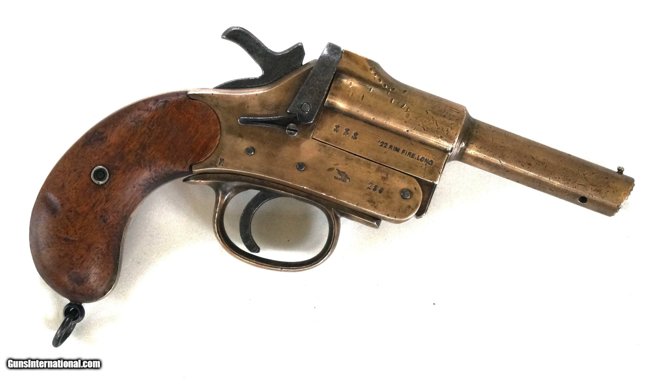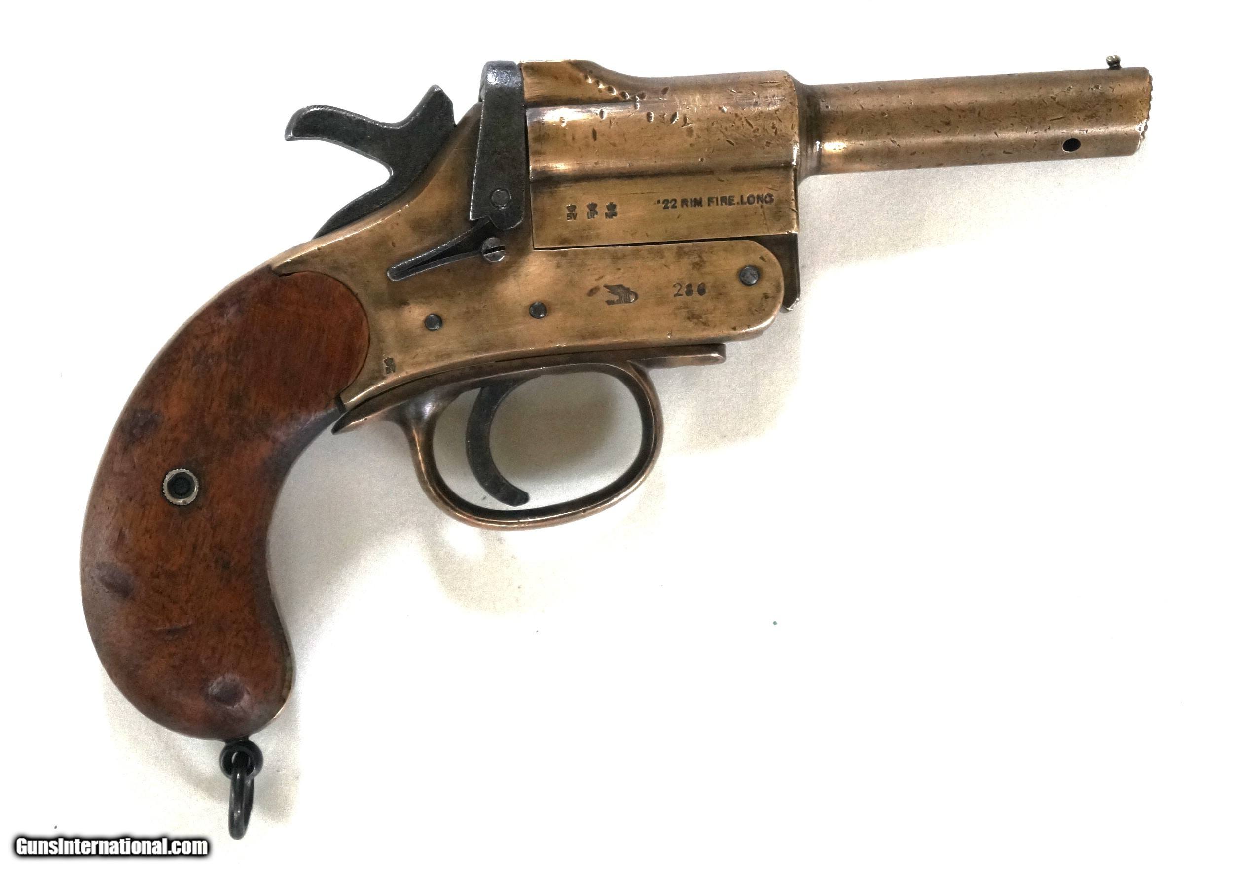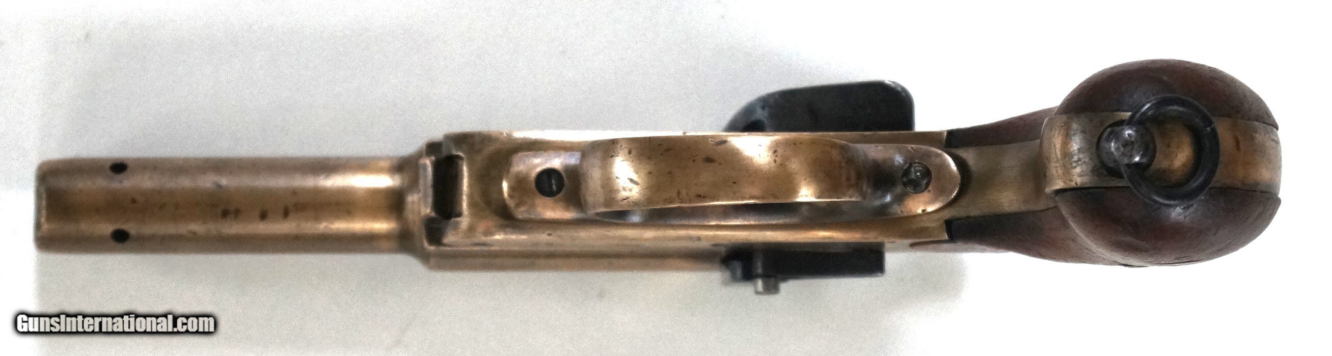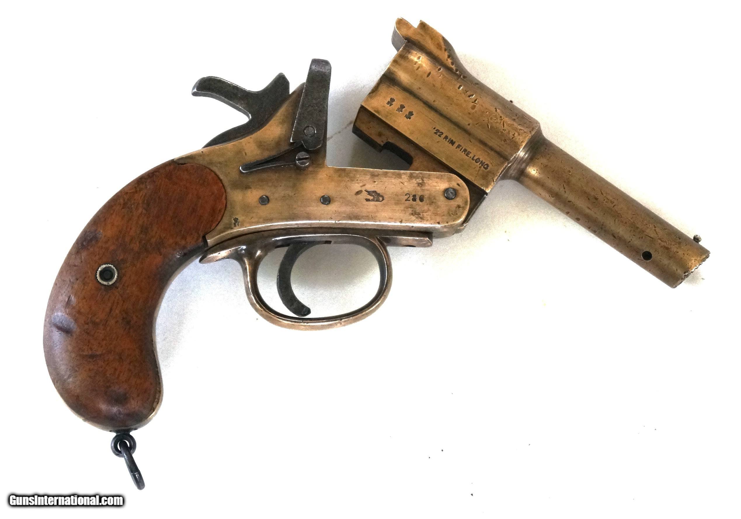 Description: THIS IS A WEBLEY & SCOTT " THE SPEAREY HUMANE KILLER FOR SMALLS" SINGLE SHOT PISTOL, SERIAL #286, .22 LR CAL., 5.25" SLEEVED SMOOTH BORE, PORTED BARREL, BRASS CONSTUCTION, SMOOTH HARDWOOD TWO PIECE GRIPS, LANYARD RING, TOP BREAL RELEASE, STEEL BEAD FRONT SITE, V GROOVE REAR NOTICE ON BARREL LATCH. A VERY RARE AND MUST PISTOL FOR THE WEBLEY COLLECTOR. SOLD Curio/Relic: Yes |