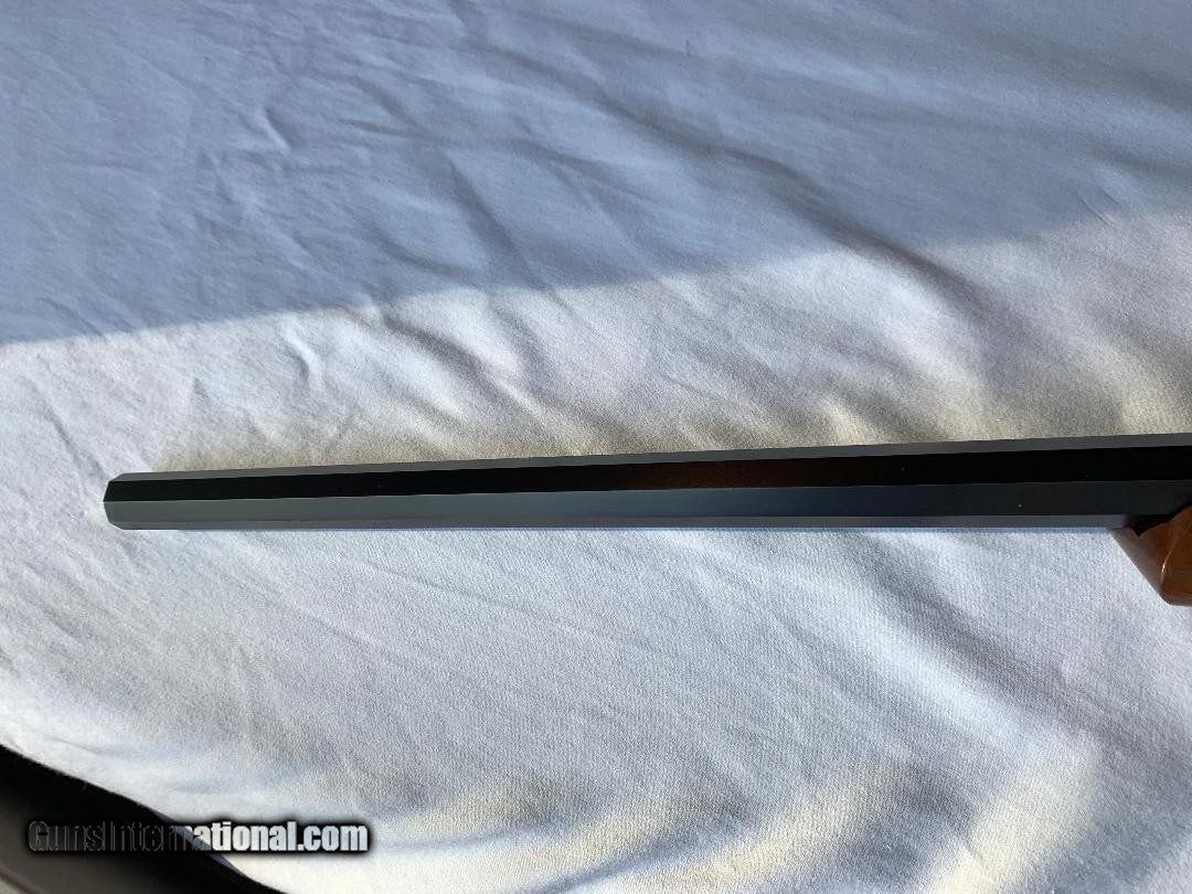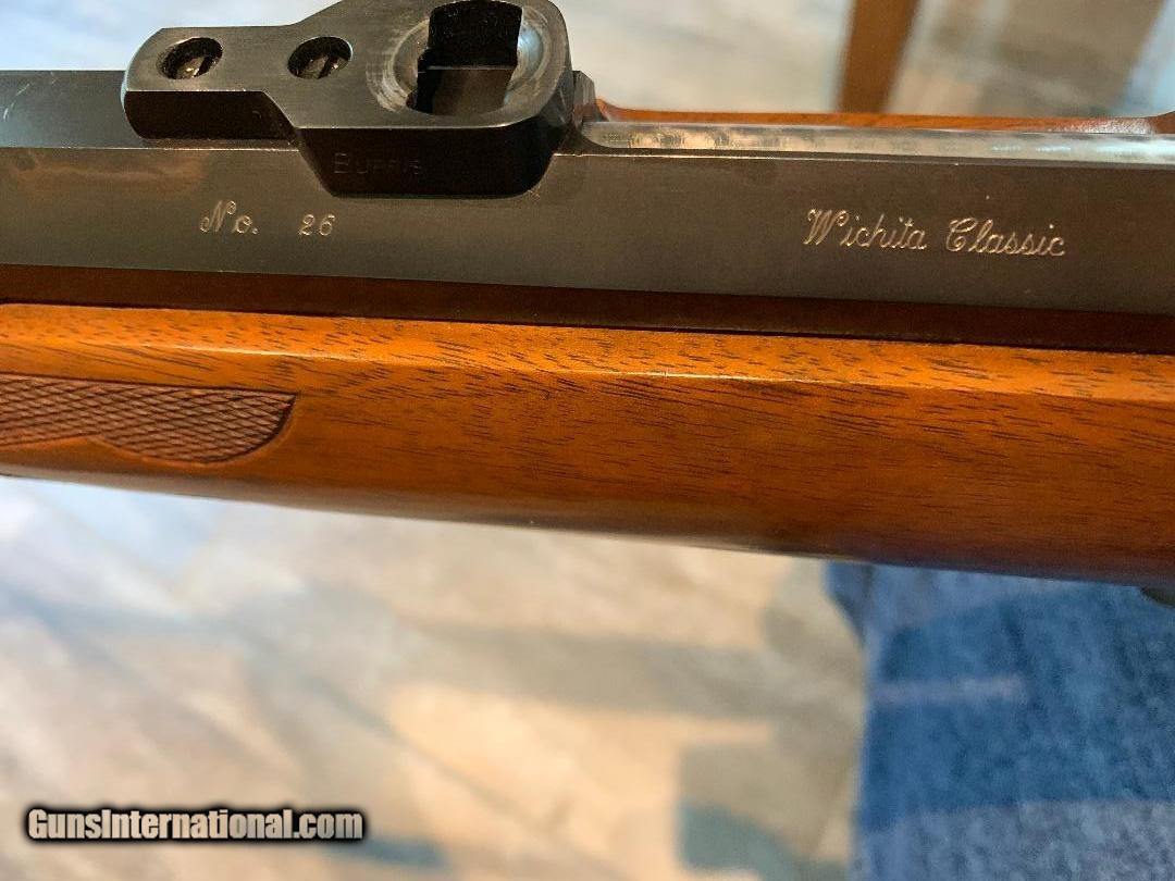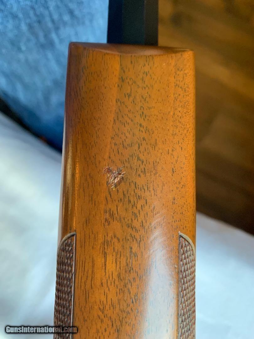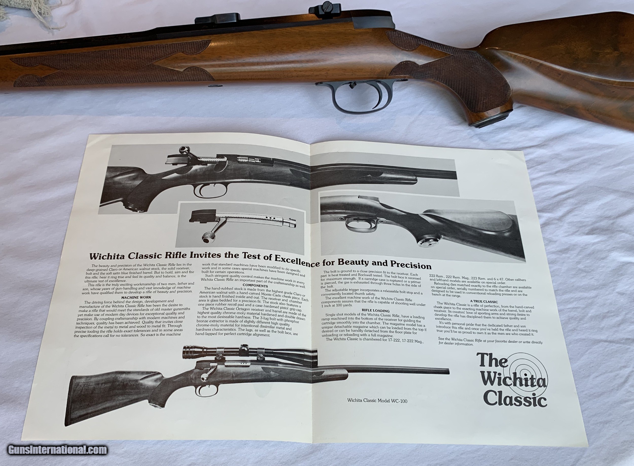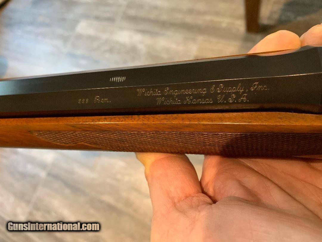 Description: Wichita Classic in 223. Octagon receiver and barrel. Loved these rifles when they first came out and still do. This one has a 20 1/4 inch barrel and Burris bases. Excellent condition, two flaws should be noted, a ding in the bottom of the forend near the tip, and the blue is marred on the top flat, looks like the objective lens of a scope was to large. See pics on both of these. SOLD Manufacturer: Wichita Engineering and Supply Model: Classic WC-100 Serial Number: 26 Caliber Info: 223 Remington Bore: Excellent Condition: Excellent Butt Pad: Old English |