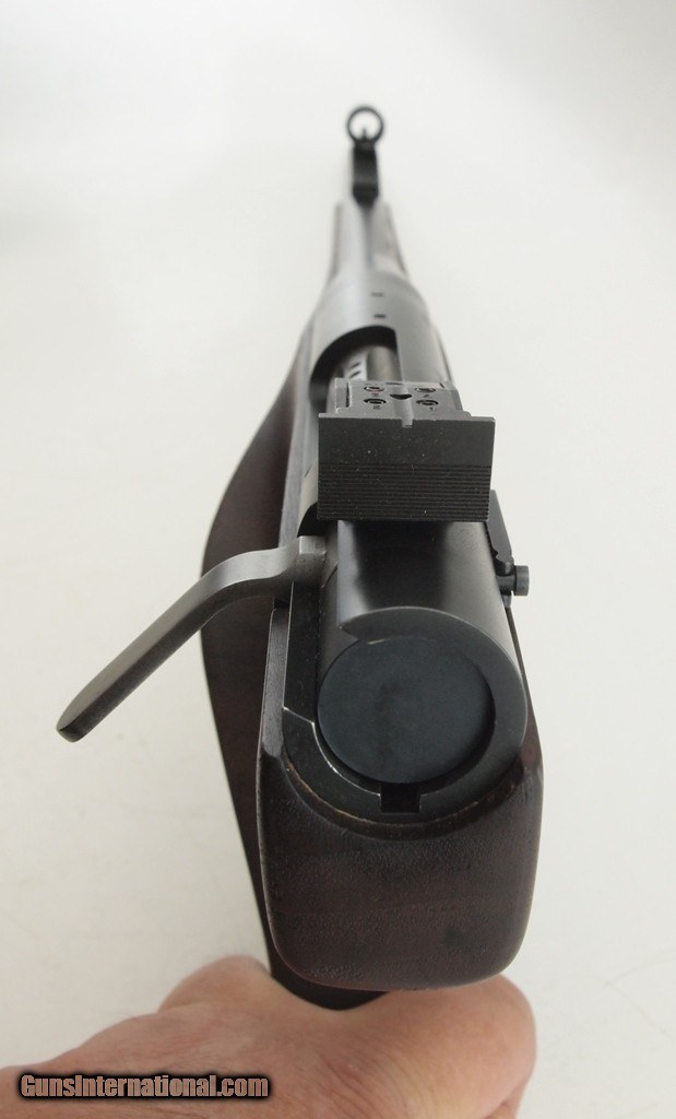 Description: Wichita Silhouette Pistol (WSP) 7MM BR REM, 14" bbl, bright shiny bore, good rifling, matte blue finish, Wichita adjustable notch rear sight - hooded front sight with additional sight blades, fluted bolt, one piece walnut pistol grip with square tip - right handed thumb rest - trigger guard, very light handling marks, and 50 primed brass cases. Excellent pistol for your collection. Add 3% for Credit Card Shipping $35.00 SOLD |