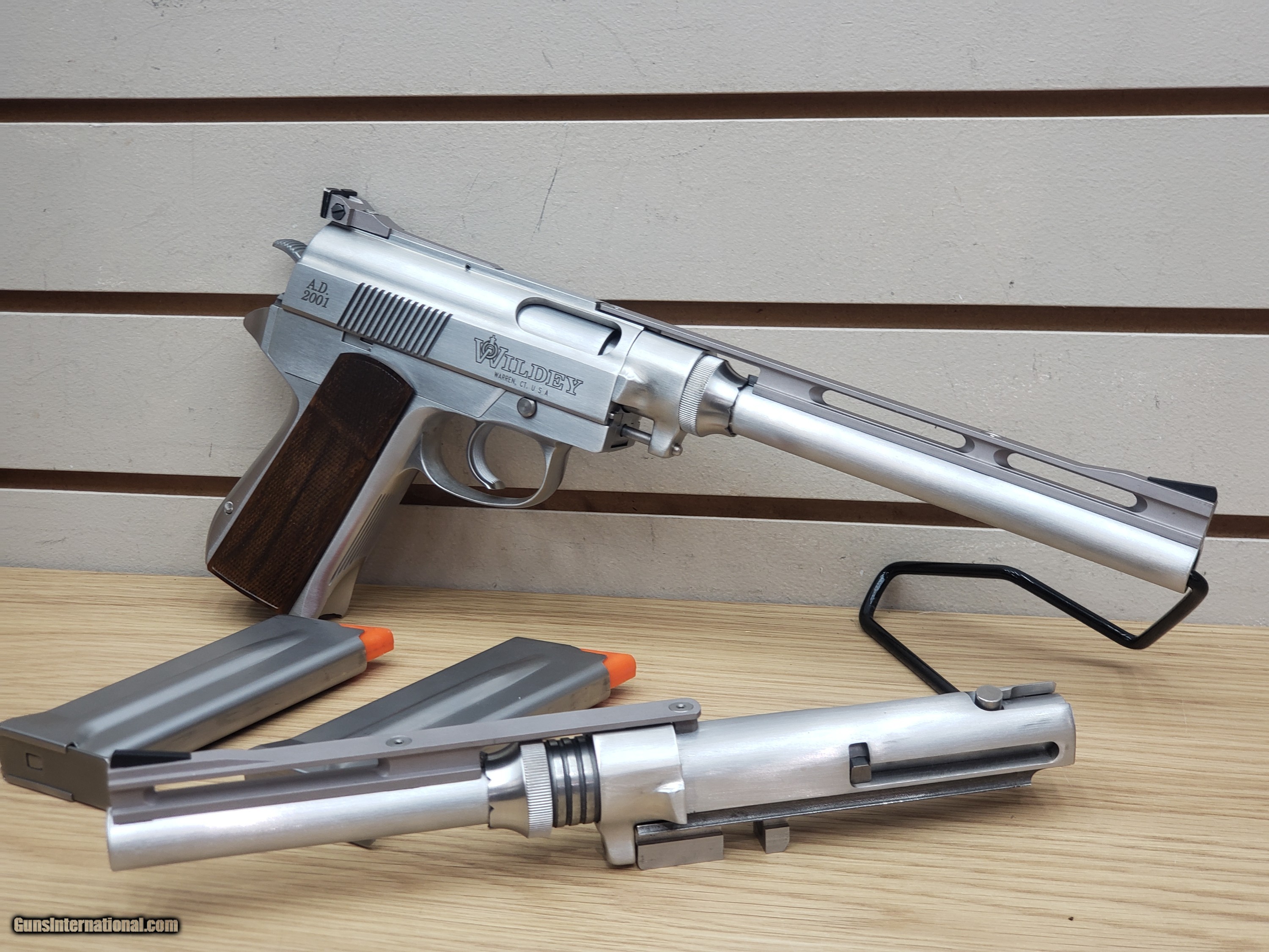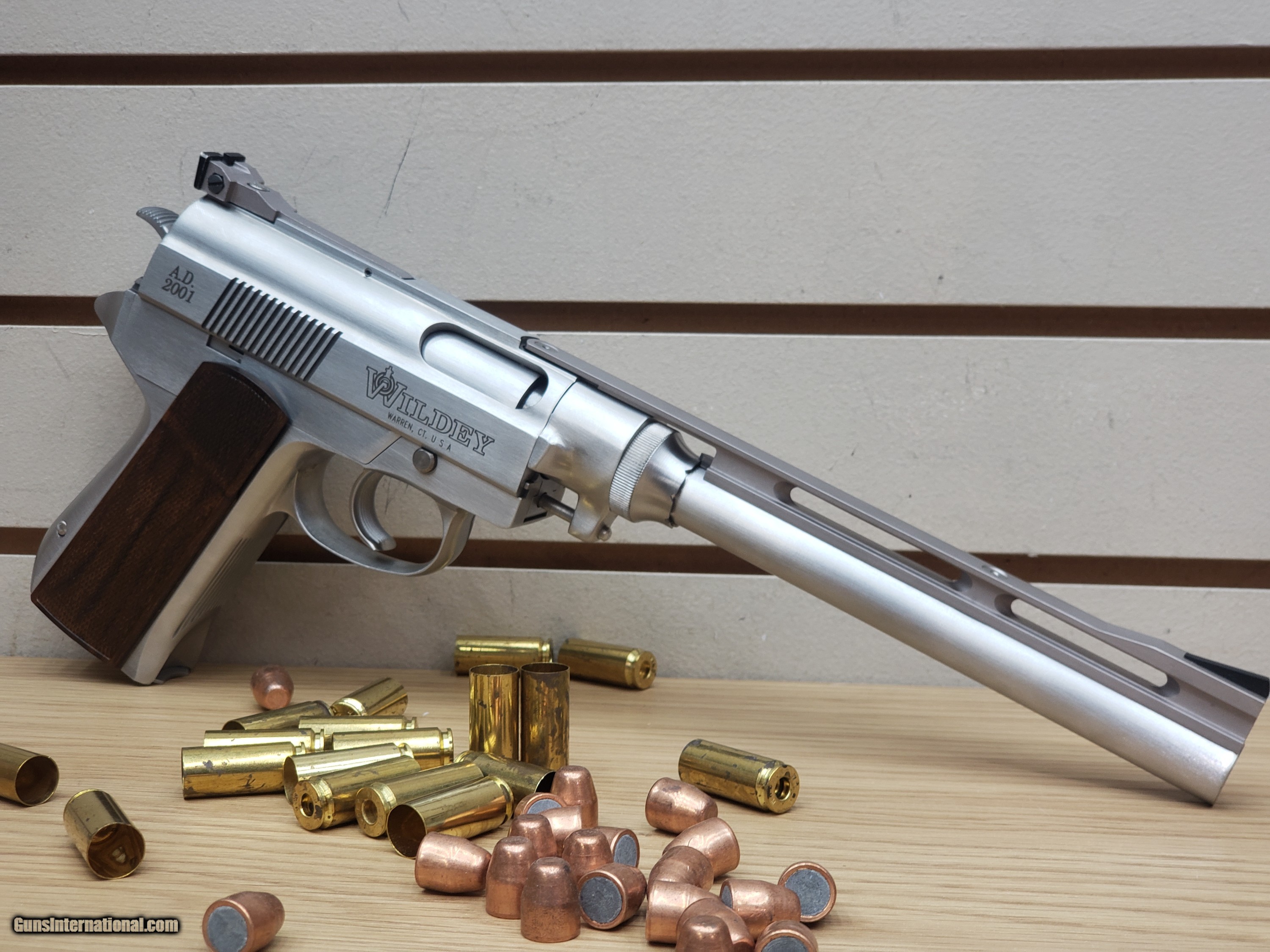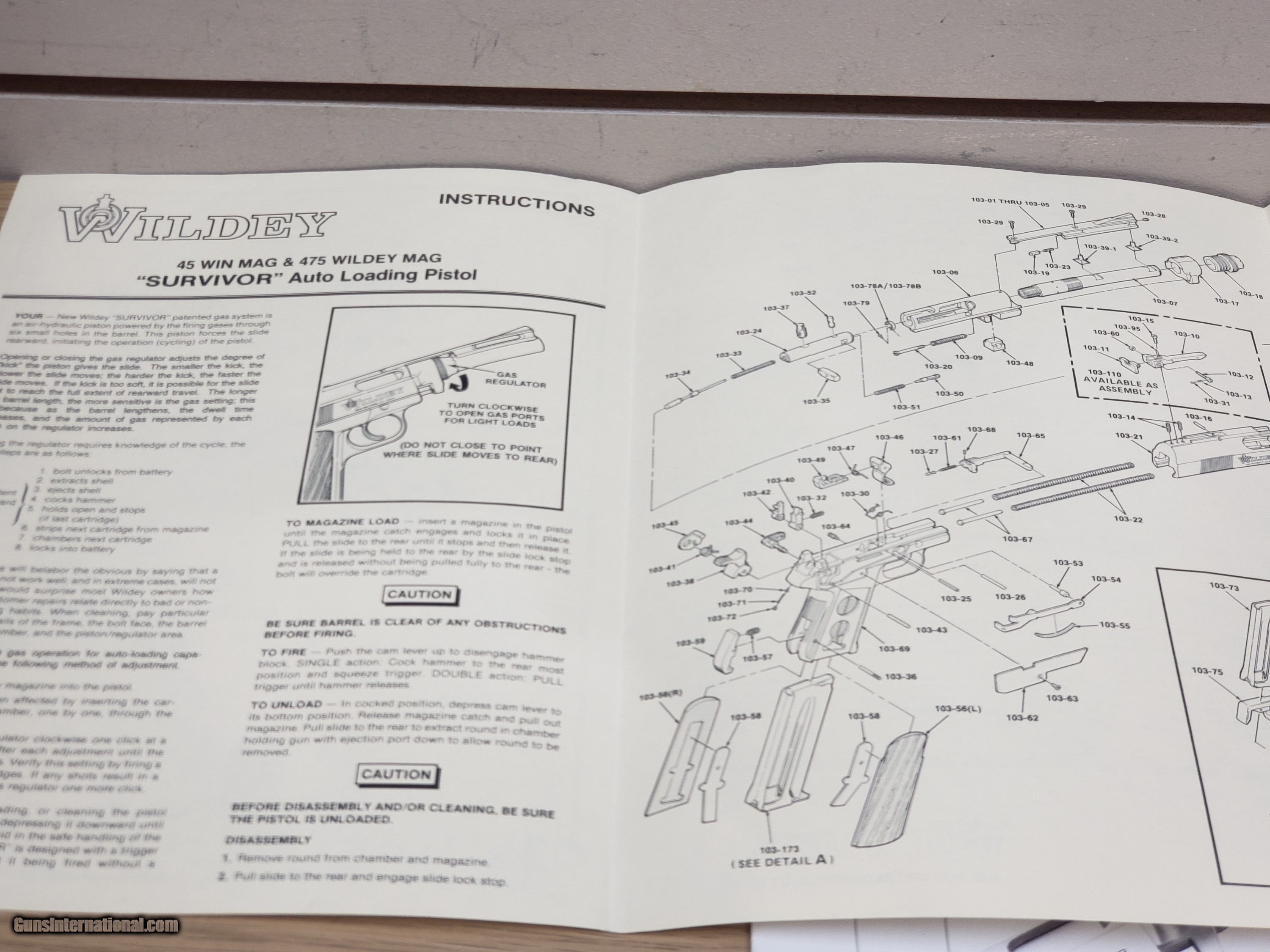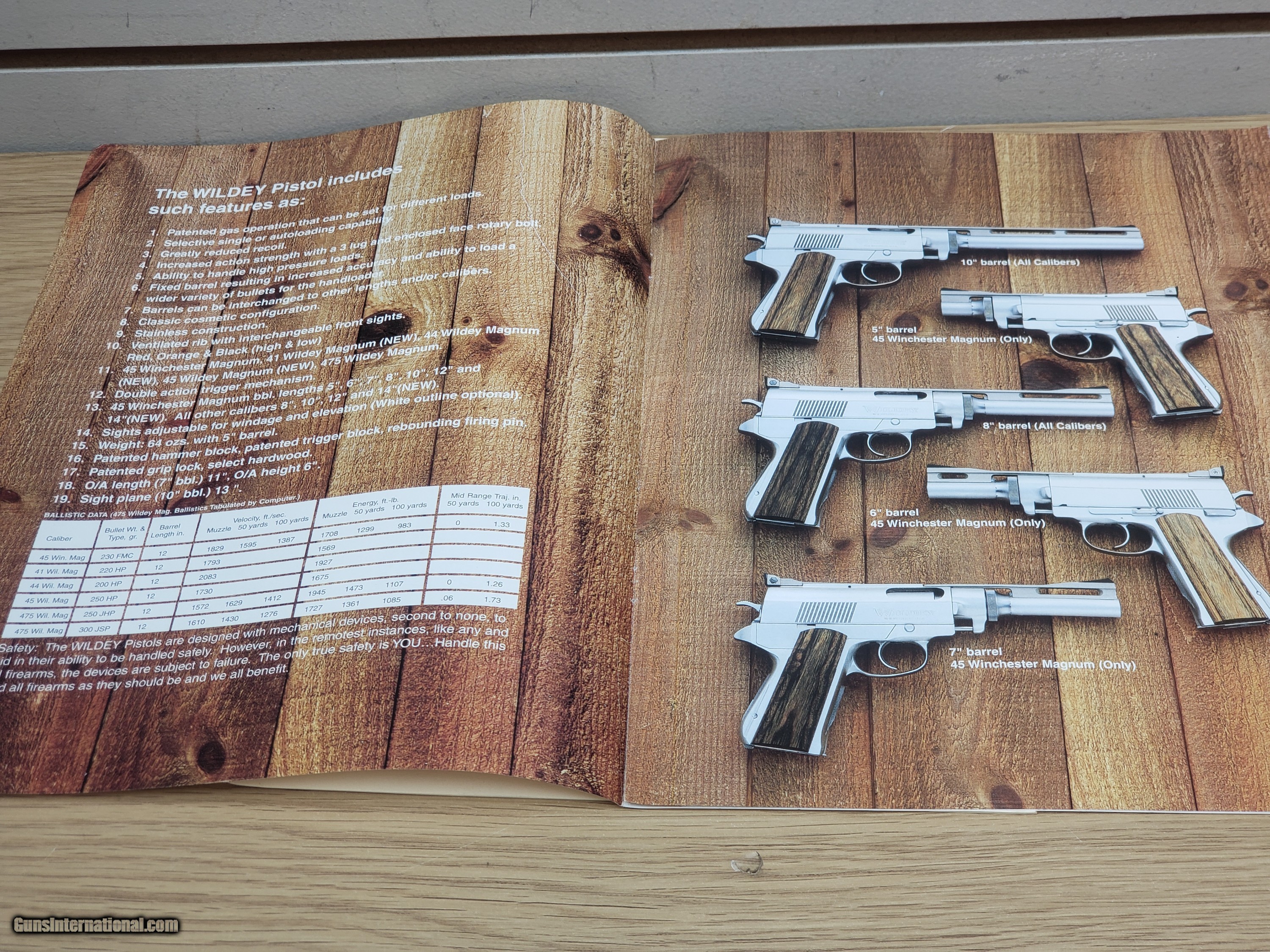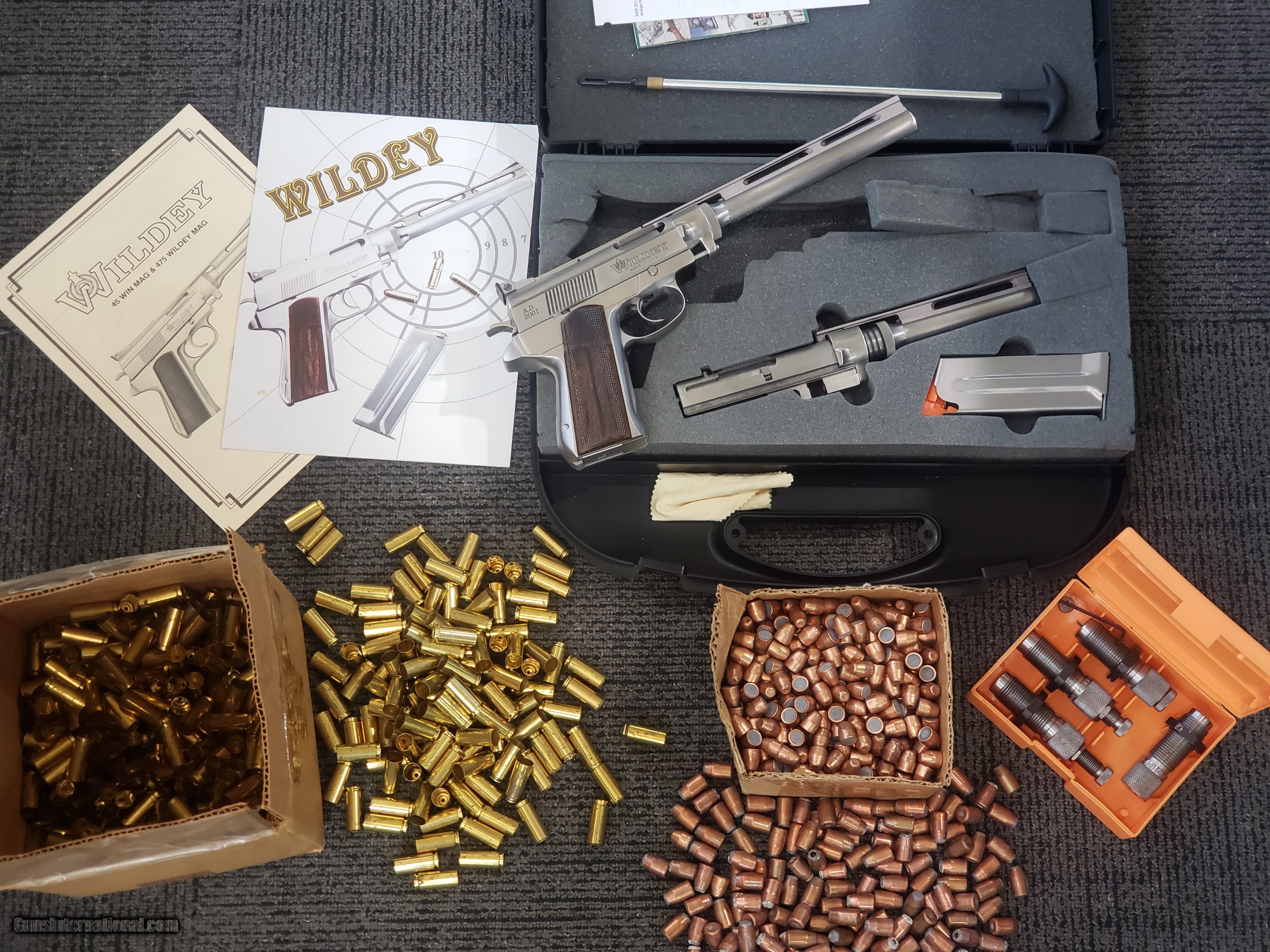 Description: Holy Grail .475 Wildey Magnum The Wildey was purpose-designed to be a hunting firearm. The pistol is built to withstand breech pressures of over 48,000 PSI associated with Moores lines of proprietary cartridges. The Wildey was the first gas-powered double action semi automatic pistol. I have never seen one offered this complete this example includes; -2 magazines -estimated 500 brass casings (.475 mag) (9lbs) -estimated 1000 fmj/hp (16lbs) -original brochure -6" and 8" barrels -Cleaning rod -4 dye set Look into the prices on the dyes/magazines I have never seen an example come with all of these extras as a set. Obviously shipping prices will have to be calculated after the fact, on top of the price of the gun. Thank you for your consideration dont hesitate to contact us with questions or potential offers, but I consider this price very fair. SOLD Handgun Caliber: .475 Wildey Magnum Manufacturer: Wildey Model: .475 Wildey Magnum Serial Number: 4768 Barrel Length: 8 Condition: Excellent Metal Condition: Excellent Wood Condition: Excellent Bore Condition: Excellent |