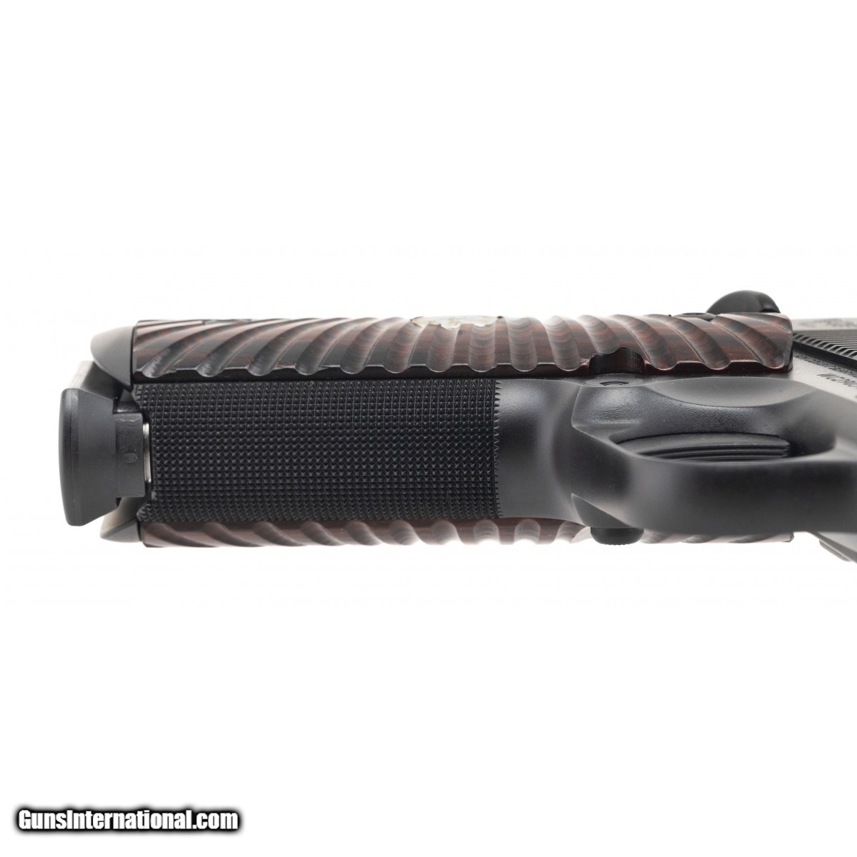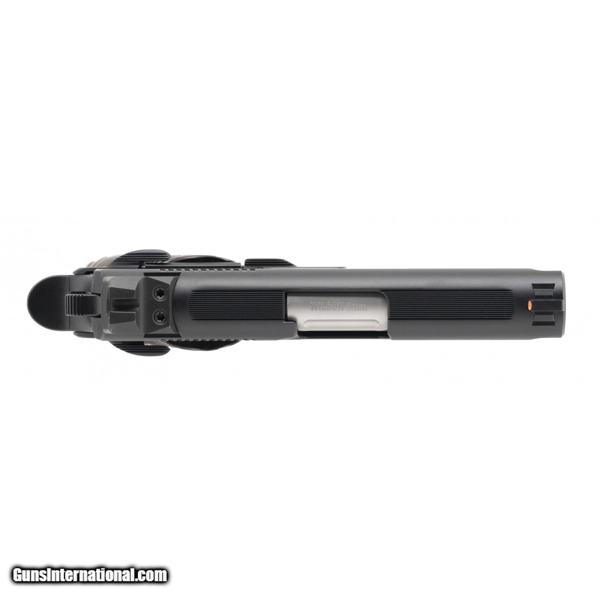 Description: " High end, light weight, single stacked 9MM pistol with night sights, ambidextrous thumb safety and wood grips. Comes with bag and one extra magazine. In excellent condition. SOLD |