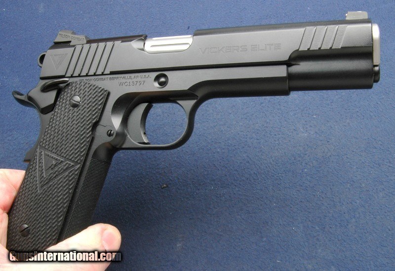 Description: A 1911 snob could make a fair and solid argument that the best thing Vickers did in his collaboration with Wilson Combat was to start with the CQB Elite as the base model for the Vickers Elite. Like the CQB Elite, the Vickers Elite is a pistol built for serious real-world use. It’s a full-sized (5-inch) 1911 with a carbon steel frame and slide and a standard, single-stack, eight-round magazine. It has no ornamentation, chrome or scrollwork—it’s all business from muzzle to mag well. Though Wilson Combat can customize Armor-Tuff finishes in five colors, Vickers’ preference is a black slide over a gray frame. It features a bobbed high-ride Bullet Proof Beavertail Grip Safety behind a 3.5- to 3.75-pound, medium-length trigger. The slide top, the high-cut checkered front and the backstraps are serrated at 30 lines per inch (lpi), with 40-lpi serrations on the rear of the slide. Both weapons also feature Wilson’s signature Bullet Proof single-piece magazine well and magazine release. Ultimately, the Vickers Elite gun’s DNA is pure Wilson Combat. There's a lot more to this gun than this bare bones description, I could write a magazine article, as many have done before. More likely, if you are here, you have a fair idea of what we have here. It is brand new, unfired, an 8 to 10 year ago purchase that was simply put into storage after purchase. $50 shipping to the lower 48, 3% surcharge for using a CC. If you pay with a personal check, you can expect us to hold the item for up to 10 days to ensure that the check clears. SOLD Handgun Caliber: 9x19mm Parabellum (9mm Luger, 9x19mm NATO) |