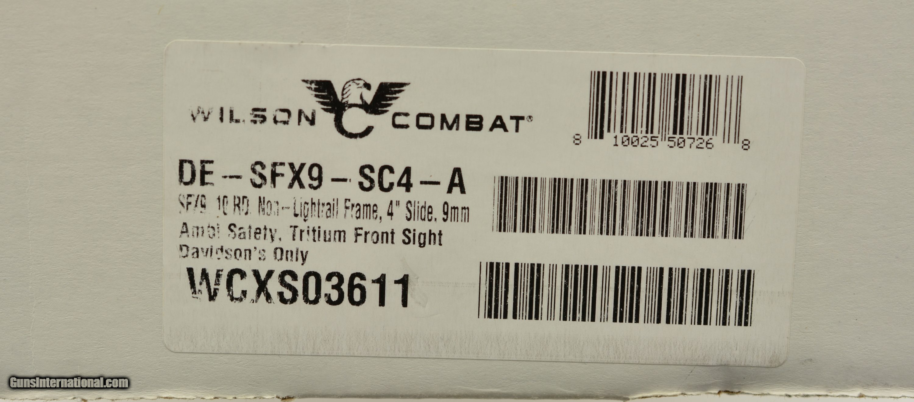 Description: Serial #WCXS03611, 9mm luger, 4 inch barrel with a bright, excellent bore. This is a Wilson Combat SFX9 pistol featuring a high capacity in a compact size with solid body aluminium X-Frame with the unique X-Tac treatment on the frontstrap and backstrap, ambidextrous safety, and tritium front sight. It comes with one OEM 15 round magazine with extended finger rest, a 10 round OEM flush mount magazine, Wilson Combat range bag all in the original cardboard box numbered to the gun with original paperwork, owners manual and lock. The pistol was purchased new and had one magazine put through it. It retains virtually all, 99% plus original finish on the metal surfaces. FFL SOLD Manufacturer: Wilson Combat Model: SFX9 Caliber Info: 9mm Gauge Info: 9mm |