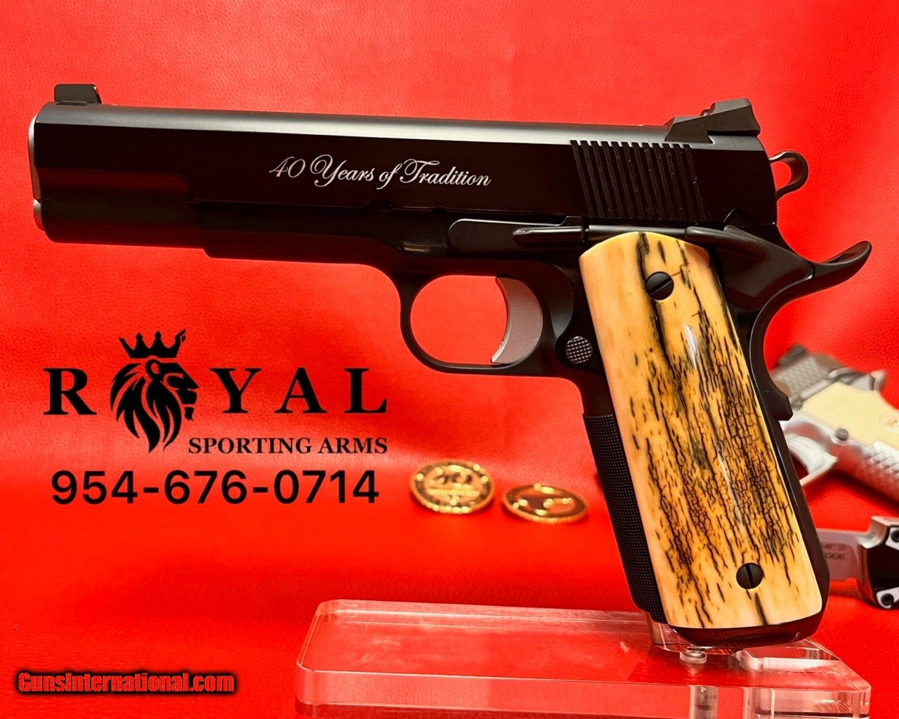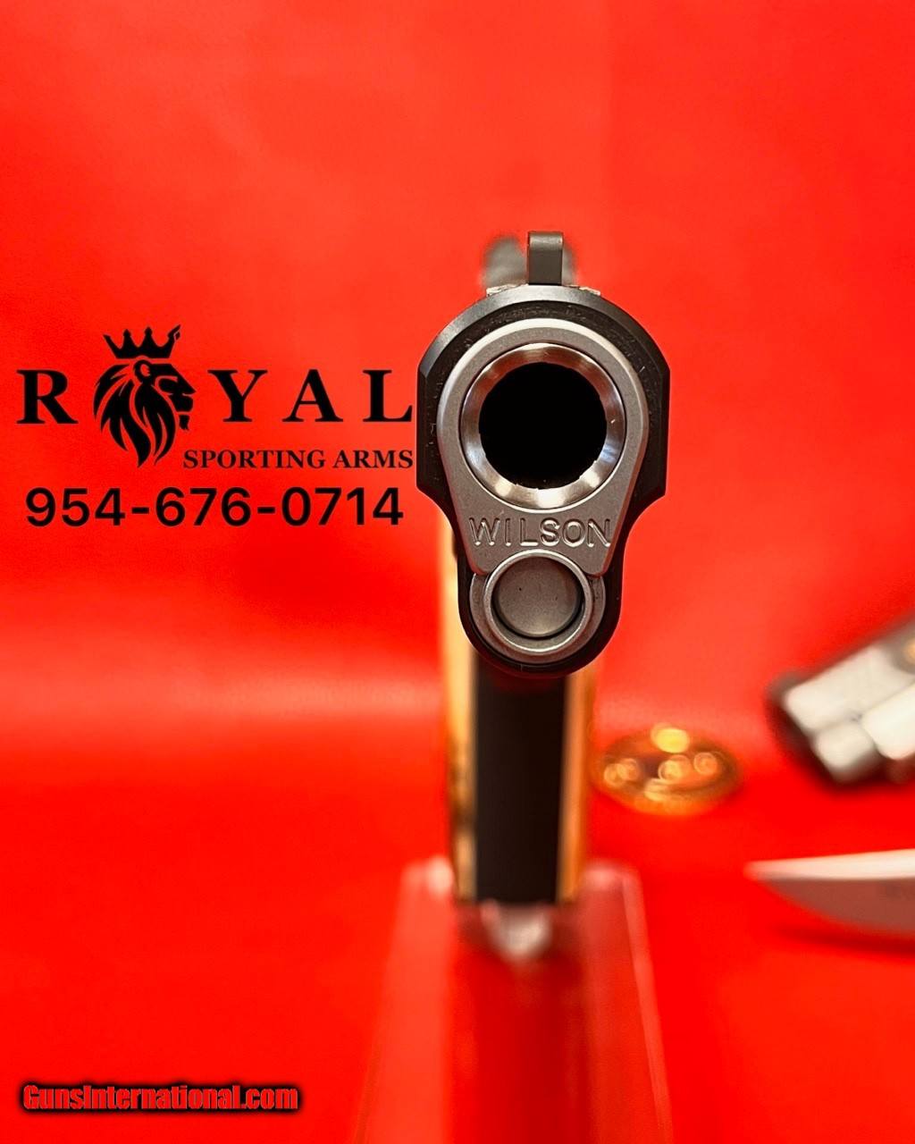 Description: JUST IN AT ROYAL SPORTING ARMS!!! Wilson combat 40th anniversary set supergrade 45 full size and edcx9 matching serial numbers only 40 ever made To purchase call 954-676-0714 In celebration of forty years of building the world’s finest custom handguns, we have developed the 40th anniversary set which includes our commemorative Supergrade, EDC X9, Out the Front Knife, and custom challenge coins. There will only be forty one box sets available for purchase, exclusively through our select dealers. These pieces are bestowed with other cosmetic and performance options, and this heirloom quality set will be at home in the finest firearm collections for generations. Appointed with never before available features, the Fortieth Anniversary Supergrade 1911 in .45 ACP is the centerpiece of the collection. Praised for their exceptional quality and sought for their scarcity, the Supergrade represents our finest work and commitment to our rich history in the refinement of the 1911. This very special Supergrade is adorned with Mammoth Ivory Grips by Dan Chinnock, a silver bead front sight and has been given a high polished Baron blue finish with silver inlays. The word “Supergrade” is inlaid on the right side of the slide, the Wilson Combat logo inlaid behind the right rear cocking serrations, with “40 Years of Tradition” inlaid on the left side. The fortieth anniversary EDC X9 is representative of the innovative spirit of Wilson Combat. Our latest and most ambitious project to date, the EDC X9 meets the needs of modern shooting applications while maintaining the history and refinement of the classic 1911. This exclusive EDC X9 is the paragon of innovation with its polished stainless slide, gold bead front sight, and gold inlaid markings on the slide. The words “EDC X9” are inlaid by Baron on the right side of the slide, the Wilson Combat logo inlaid on the top, and “40 Years of Innovation” inlaid on the left. Included in the set is our Out the Front knife by Hogue, representing our commitment to being on the cutting edge of weapon technology. This special knife has polished flats for a unique two tone look, X-TAC grip pattern as found on our EDC X9, and “Forty Years of Cutting Edge” laser engraved on the blade. Rounding out the collection is our two piece challenge coin set and our presentation quality, custom fit shadow box. 40th Anniversary 1911 The Supergrade is a combination of breathtaking aesthetics and functionality within a single pistol.