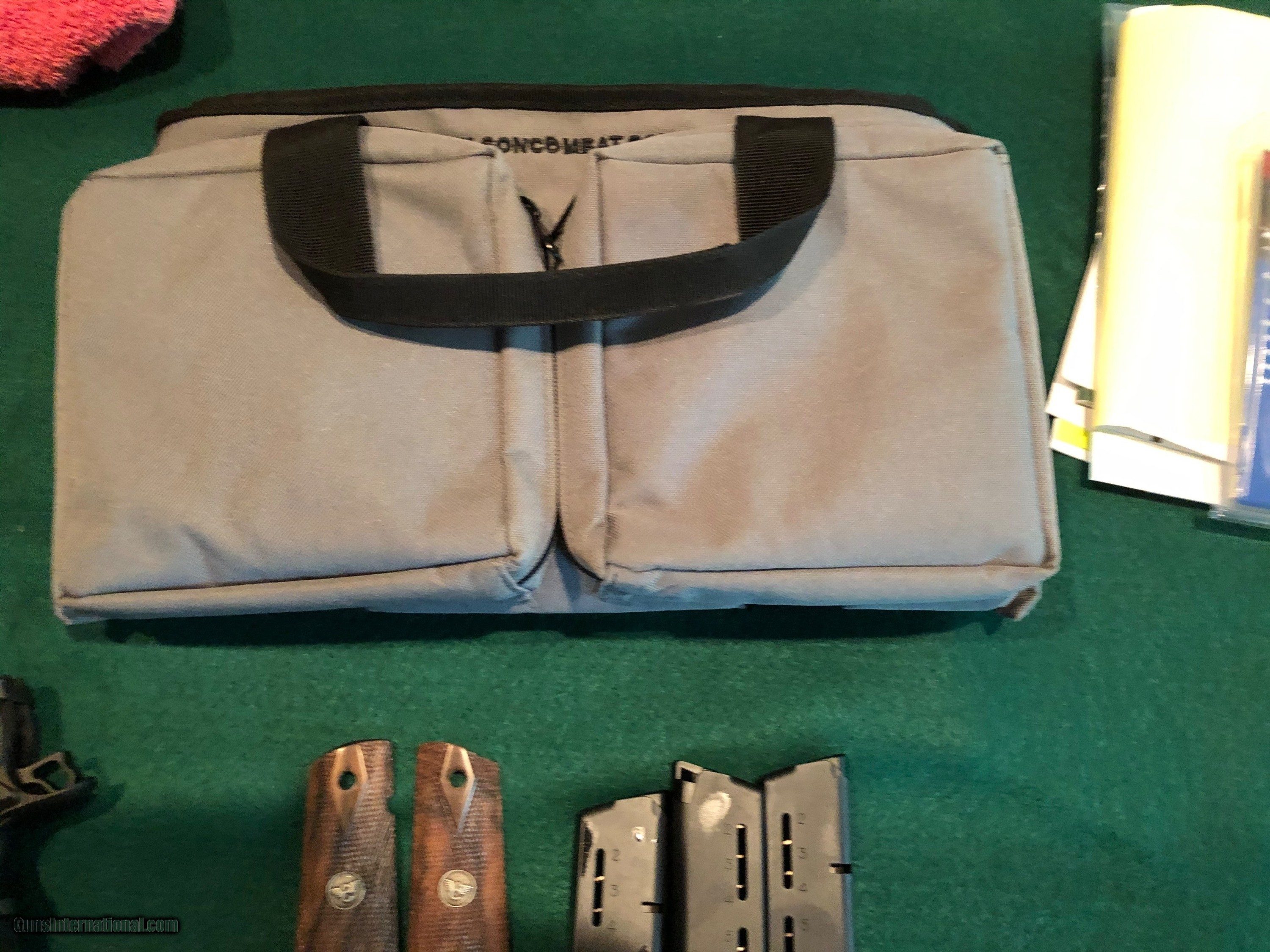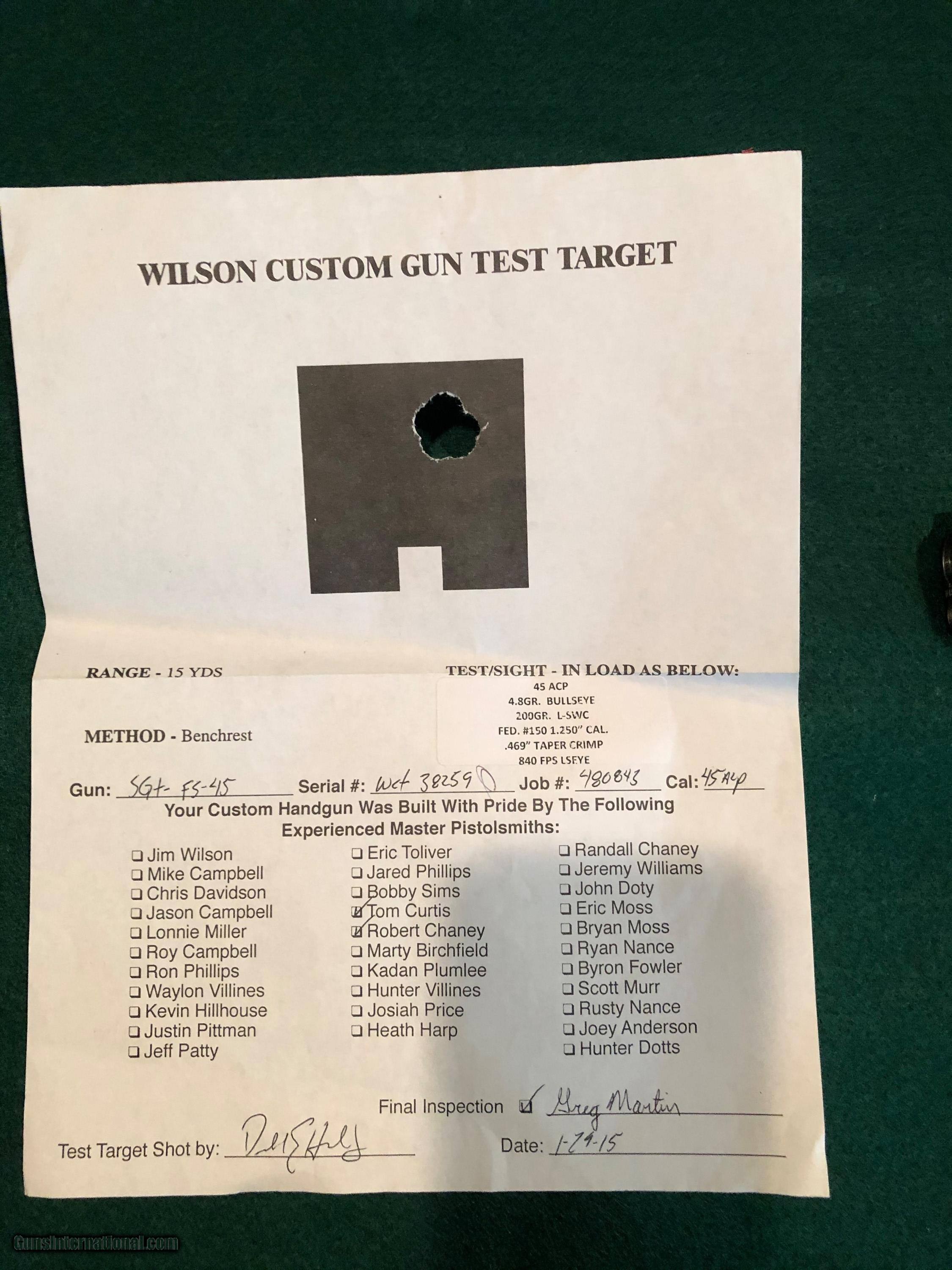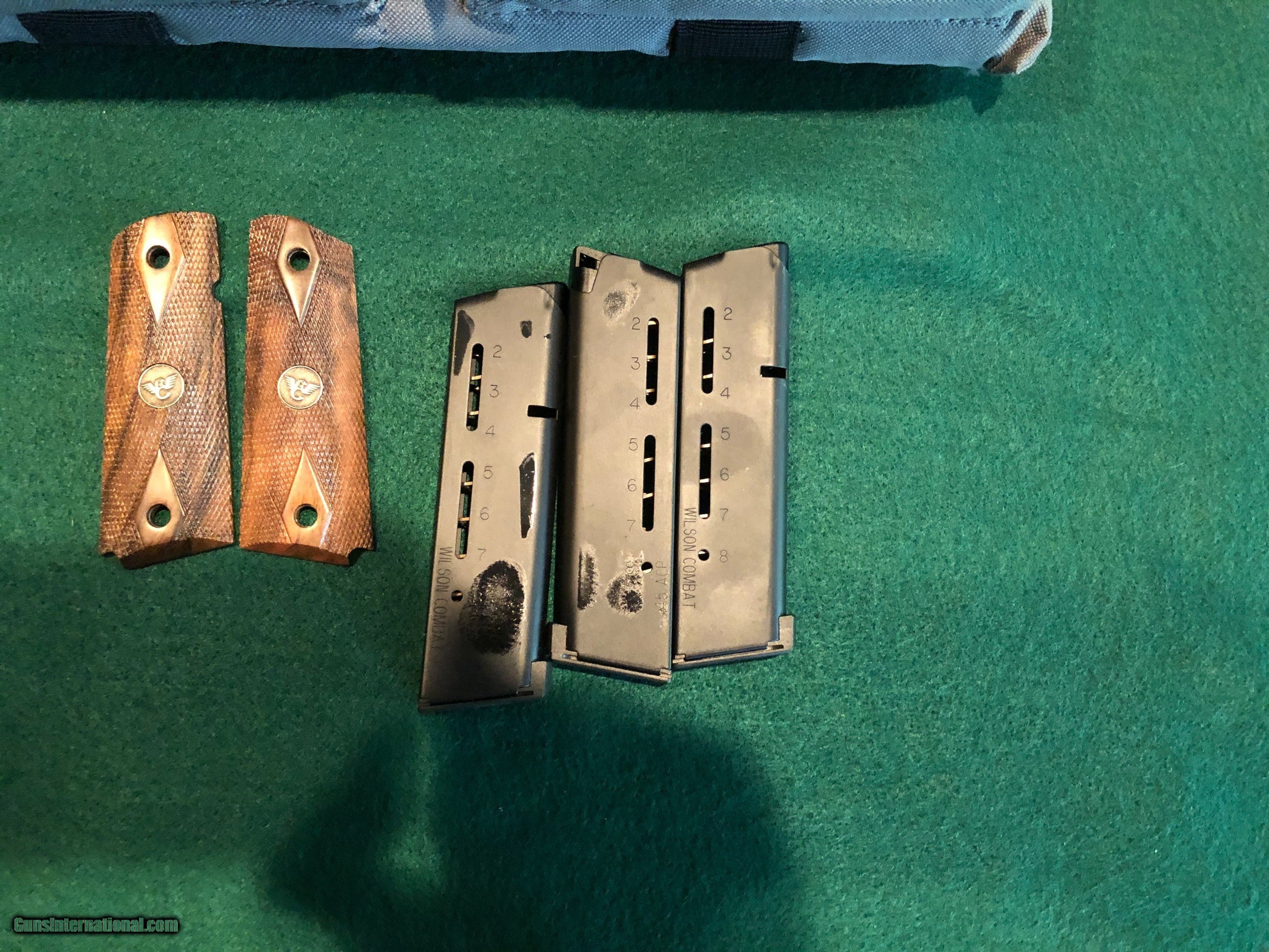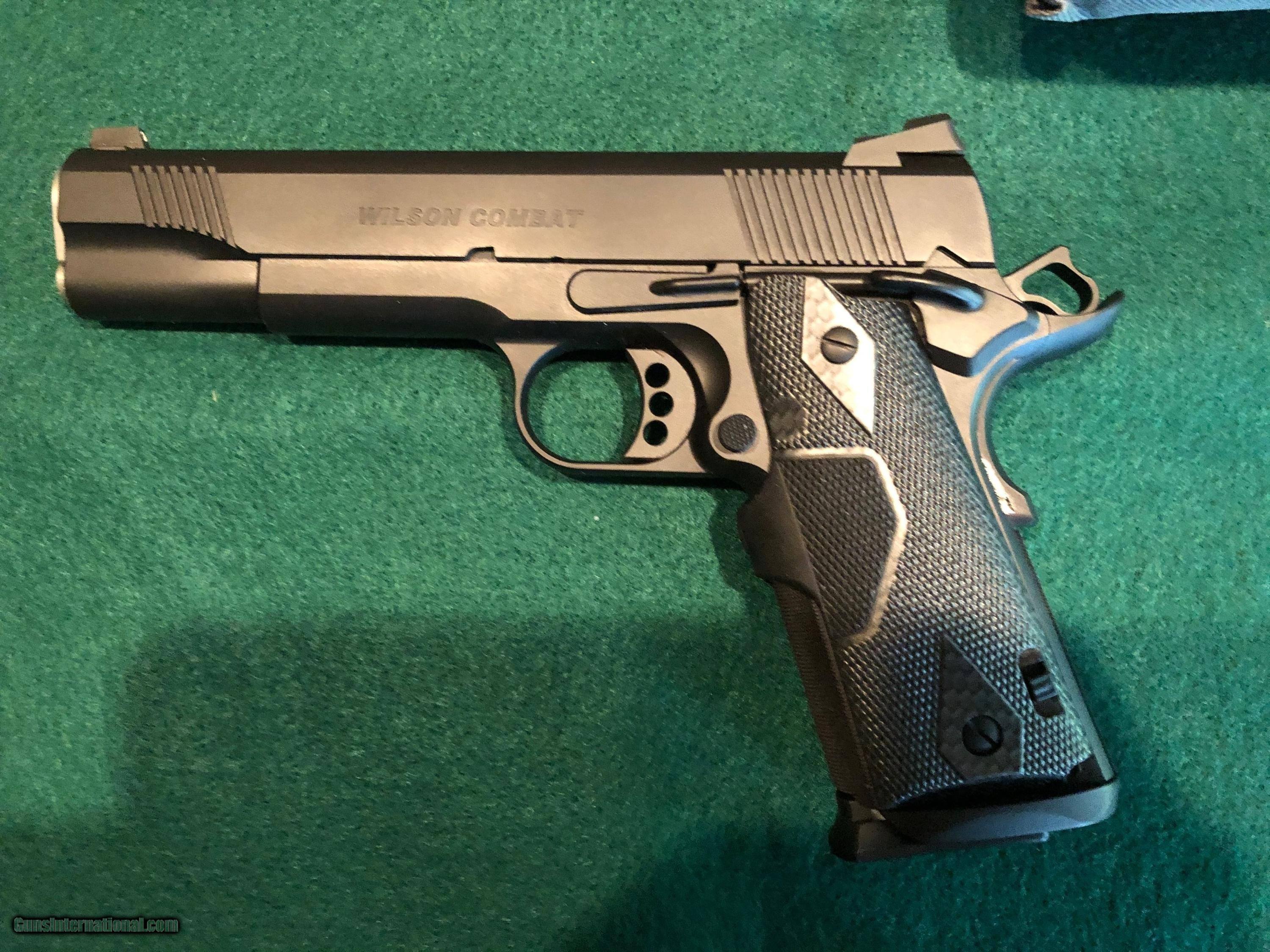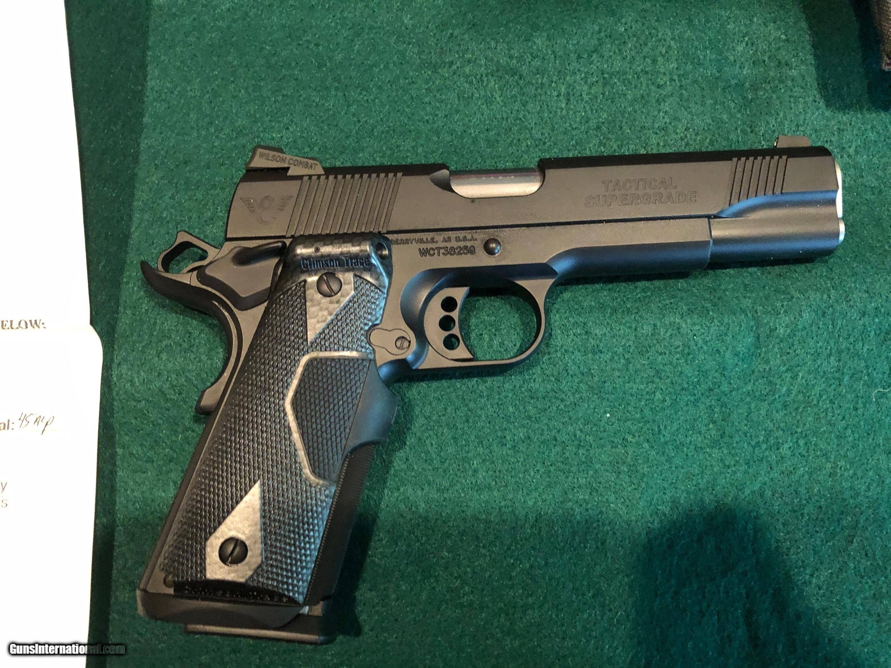 Description: Wilson Combat Tactical Supergrade. 5" full size pistol. Crimson Trace carbon fiber grips. Pistol looks unfired. No carry wear/scratches. This pistol is simply the best of all the choices. Includes four 8 round Wilson Combat magazines and factory walnut grips as well as factory carry bag. SOLD Handgun Caliber: .45 ACP (.45 Auto) |