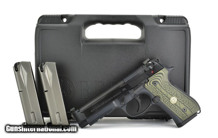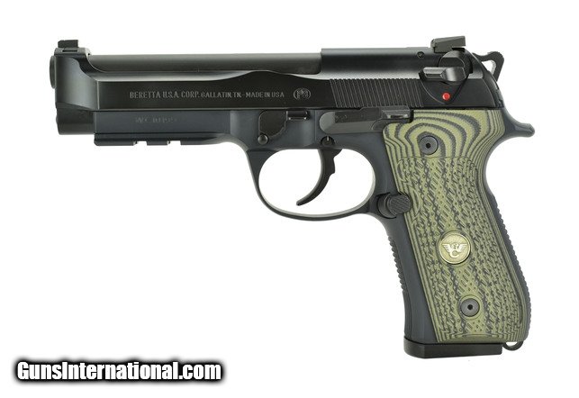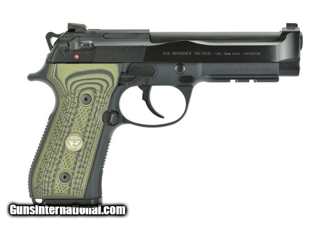 Description: Wilson Combat Beretta 92G Brigadier Tactical 9mm caliber pistol. Two tone model with gray frame and front Trijicon night sight, tuned action with green grips. New.