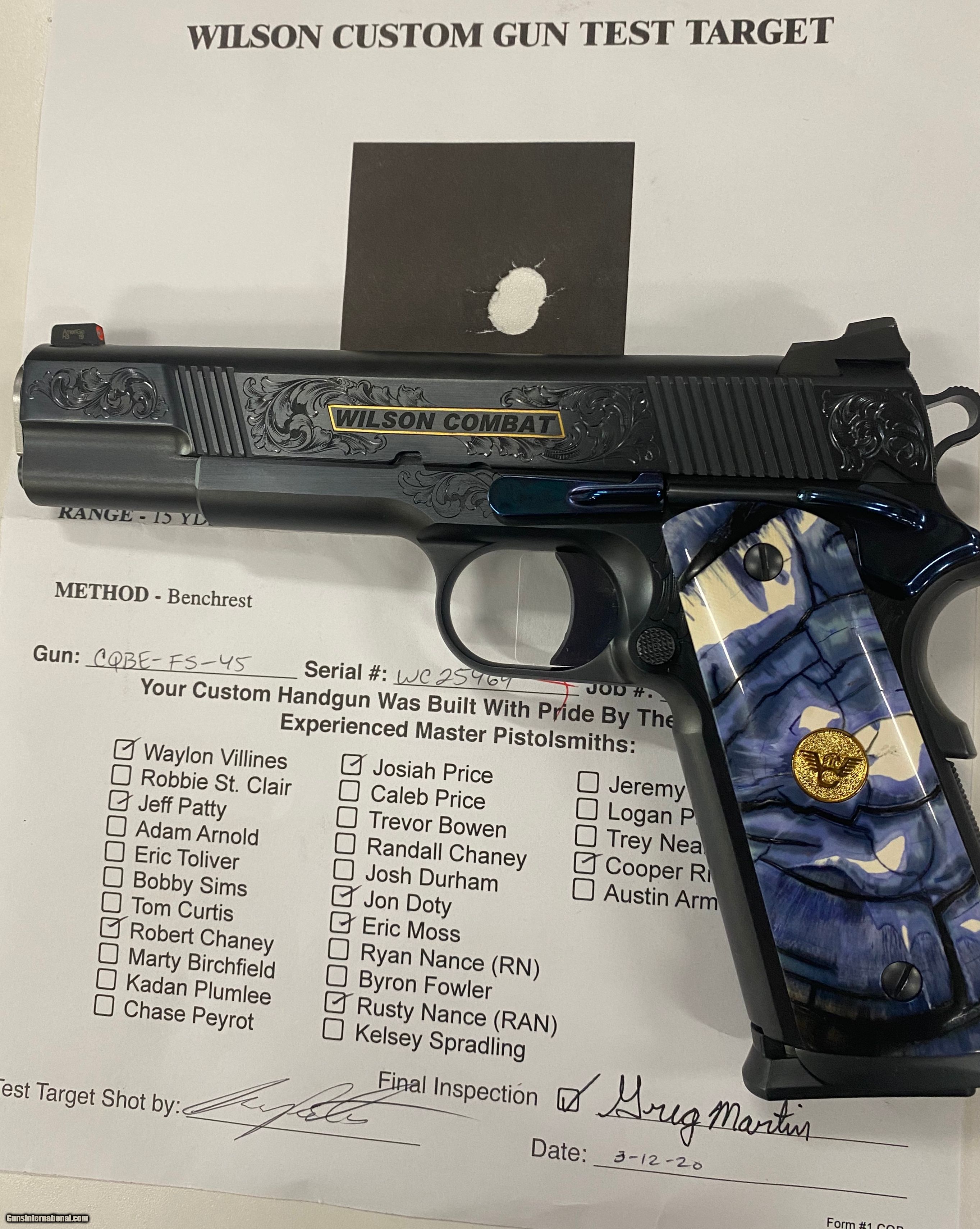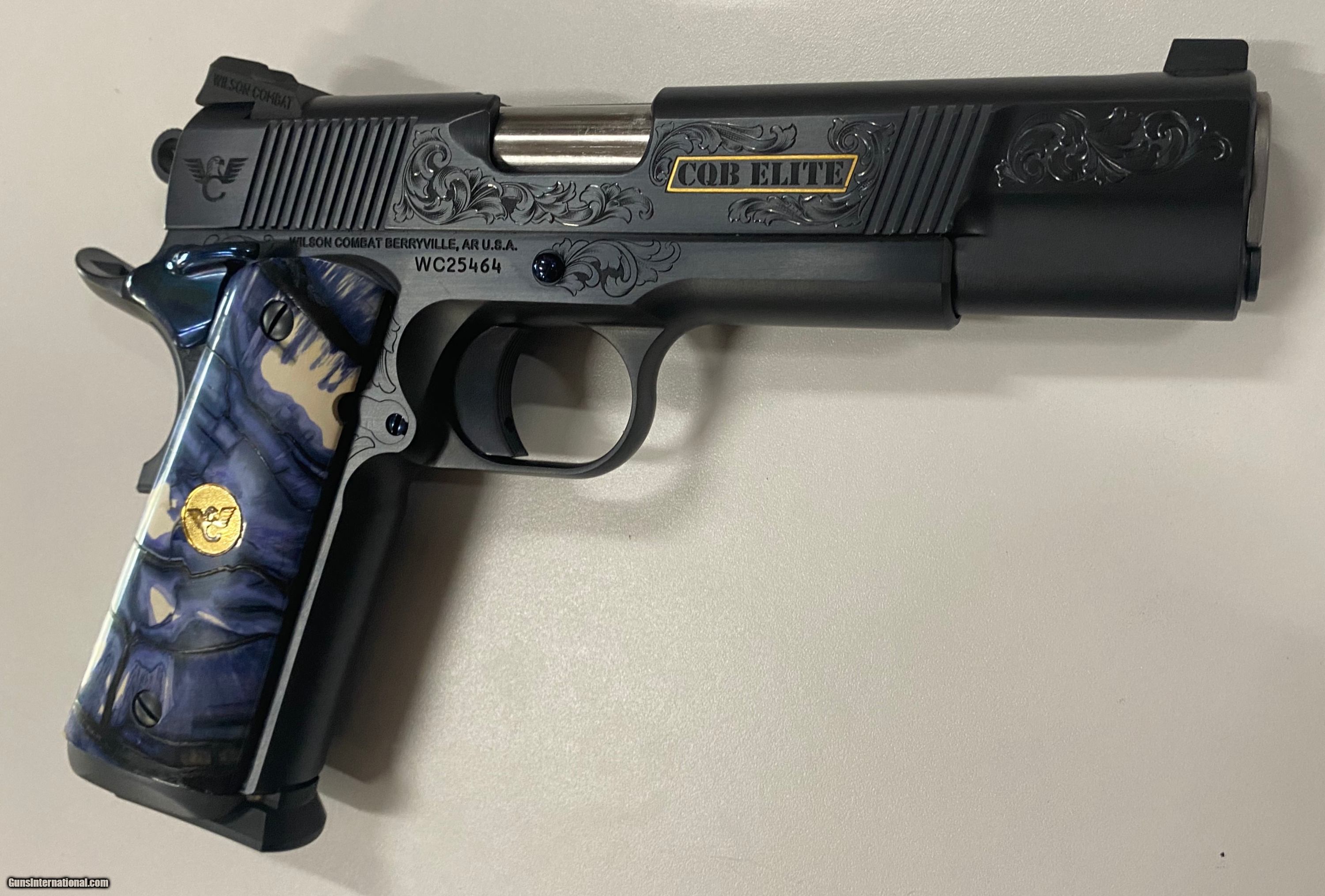 Description: Wilson Combat Custom Engraved CQB Elite 45 ACP Mamoth Grips Gold Trim - Factory New SOLD |