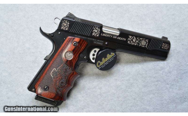 Description: This 1911 manufactured by Wilson Combat is in excellent condition with Liberty or Death on one side of the slide and Wilson Combat on the other. This 1911 has other engravings on the slide as well. SOLD Caliber Info: 45 ACP. Chambers: Semiauto. Metal Condition: Excellent Wood Condition: Excellent Bore Condition: Excellent Barrels: 5 inch with sights. Triggers: Single. Stock: Wood grips with Wilson Combat medallion inserted in the middle. Sights: 3 dot night sights. Item Location: Hazelwood, MO |