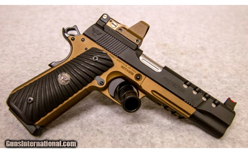 Description: Wilson Combat Protector, chambered in 9 mm. Features include: integral light rail steel frame, 5 in. stainless match grade fluted barrel, 5 in. carbon steel slide, 10 shot mag., Battlesight with fiber optic front sight, G10 starburst grips with black medallions, Bullet Proof round-butt magwell, high ride beavertail grip safety, and tactical thumb safety, high cut checkered front strap, top, rear, and cocking serrations, 41.6 oz. Two-tone bronze finish 9mm Luger SOLD Chambers: 9 mm Metal Condition: Excellent Bore Condition: Excellent Barrels: 5' Sights: "Battleship Sight, Red Fiber Optic Front, Leupold DP-PRO Item Location: Fort Mill, SC |
