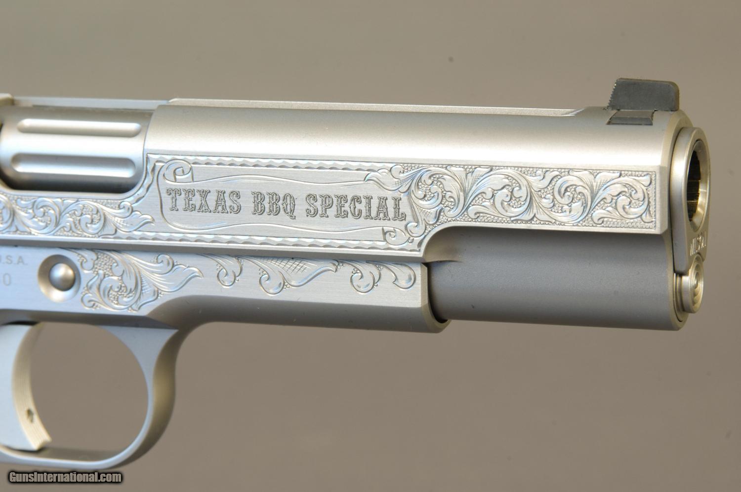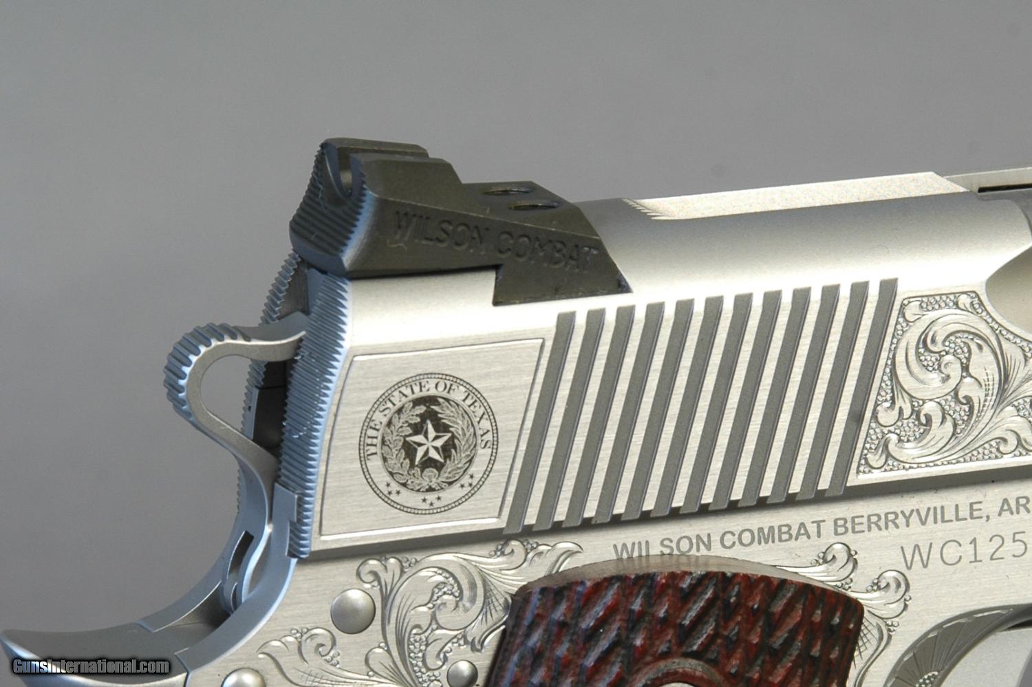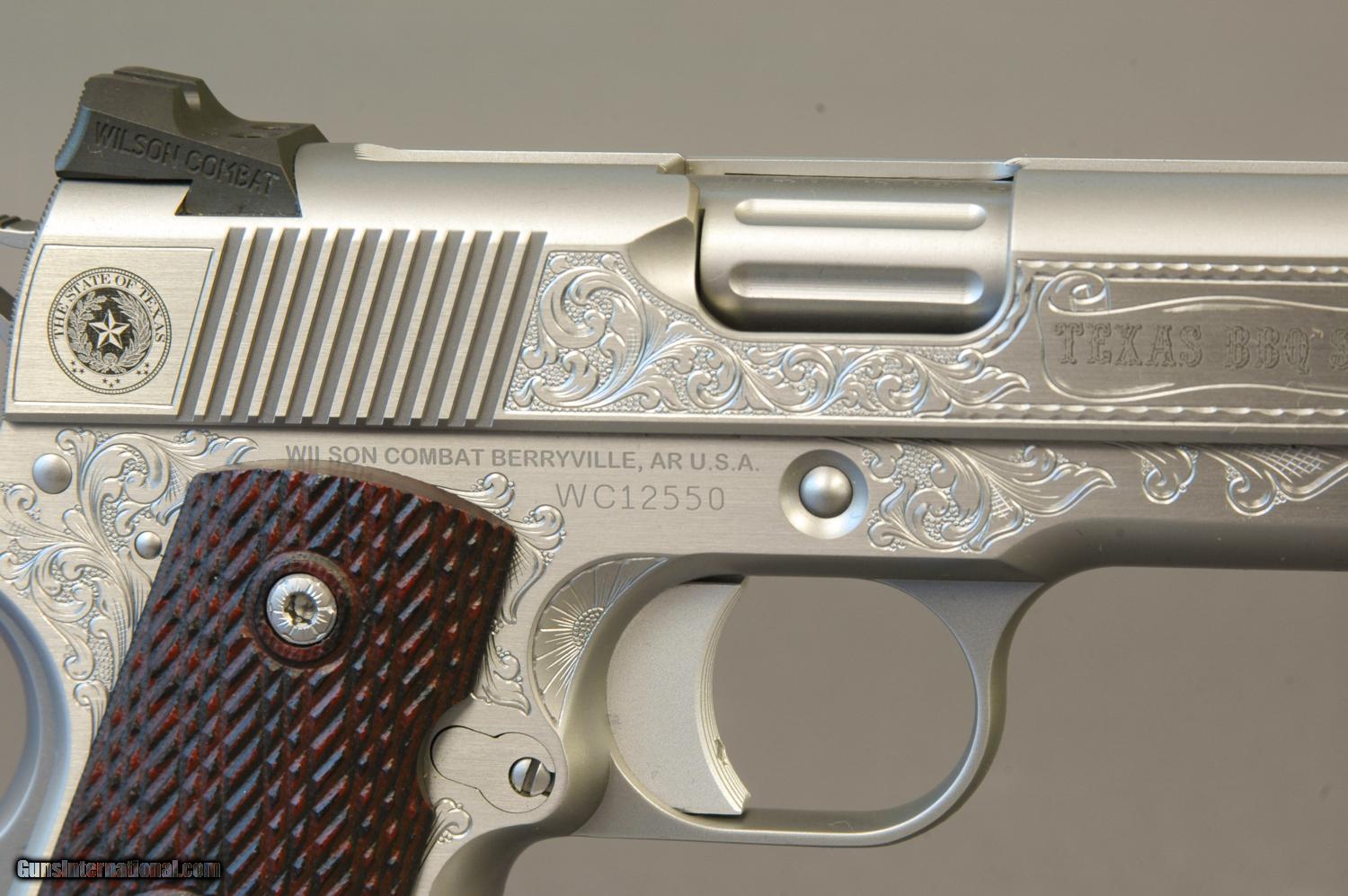 Description: Wilson Combat Texas BBQ Special 45ACP Serial # WC12550 ~ACTUAL FIREARM PICTURED~ **Level III Engraving** A fully dressed-up carry gun that is hand-engraved is almost always some version of a 1911 and is traditionally worn at special get-togethers and barbeques by gunmen across Texas. The Texas BBQ Special starts with Wilson's stainless forged and billet parts. All controls have been selected for everyday carry and hard use. This BBQ Special has Level III special hand-engraving from Master Engraver Wayne D'Angelo. The Wilson Combat Texas BBQ Special will be a special functional heirloom prized by generations for years to come. Not just for Texans, but for the Texan in all of us!!!! Specifications