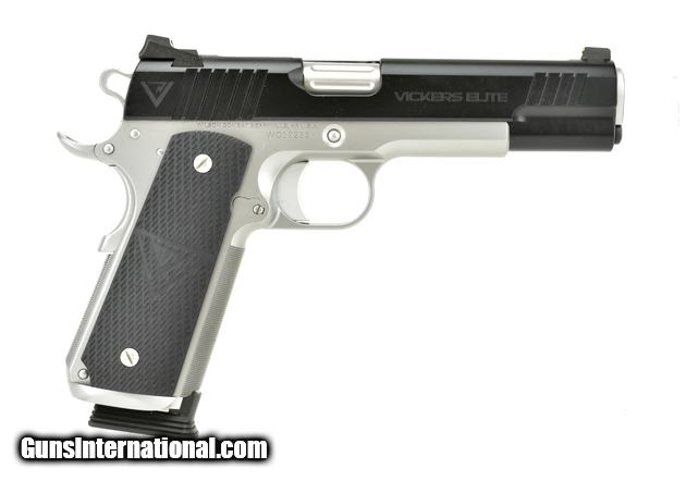 Description: Wilson Combat Vickers Elite 9mm caliber pistol. Two-tone Vicker Elite with black and stainless finish. Excellent condition. Gold bead front sight. Comes with bag and extra magazine.