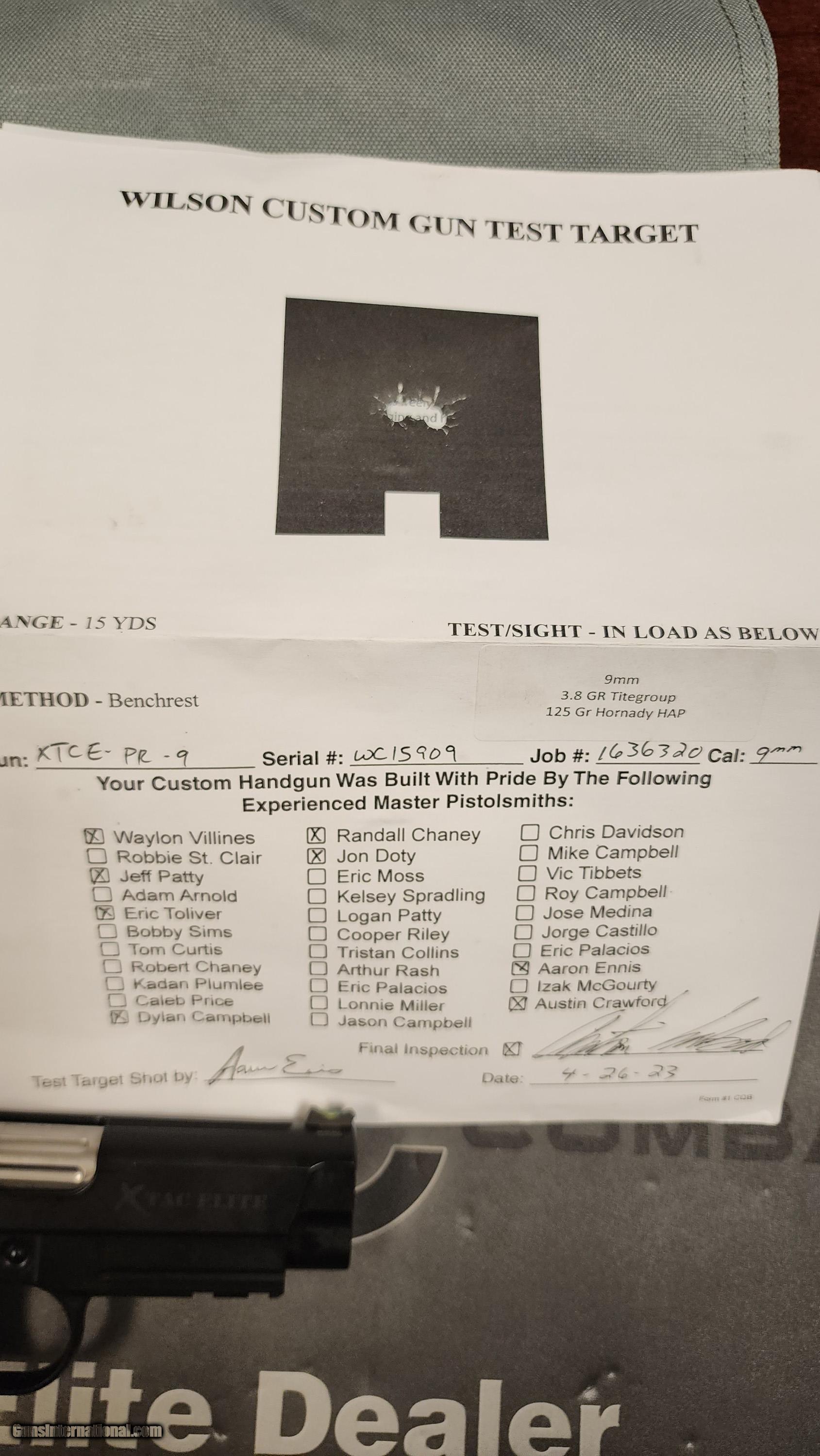 Description: Wilson Combat Xtac Elite Professional in 9mm. Xtac pattern, ArmorTuff finish, flanged barrel, flattened and serrated top of slide and serrated rear of slide. 4 inch Professional length, Lightrail, Magazine well, HiViz front sight, Battlesight rear. Includes 2 magazines, soft case, papers, test target, oil. Free Shipping to lower 48, price reflects 3% cash discount. SOLD Handgun Caliber: 9x19mm Parabellum (9mm Luger, 9x19mm NATO) Manufacturer: Wilson Combat Model: Xtac Elite Proffessional Barrel Length: 4 Condition: NIB |