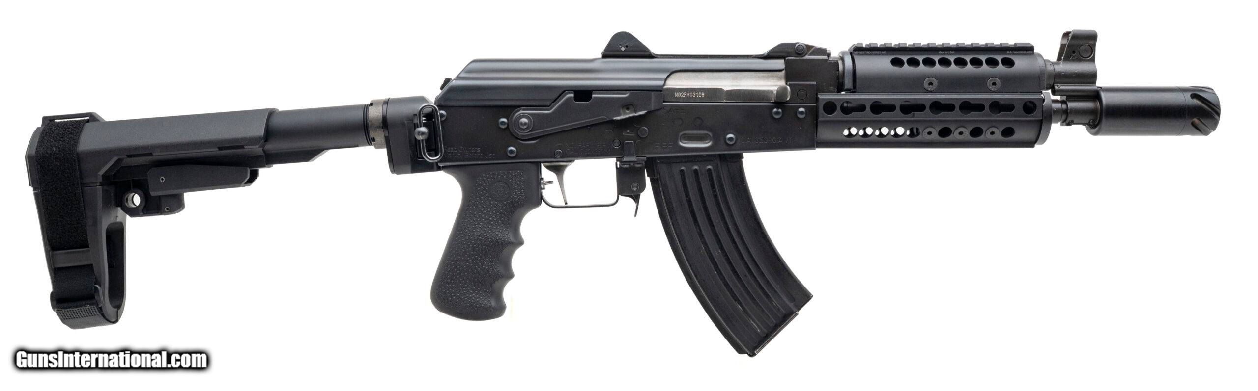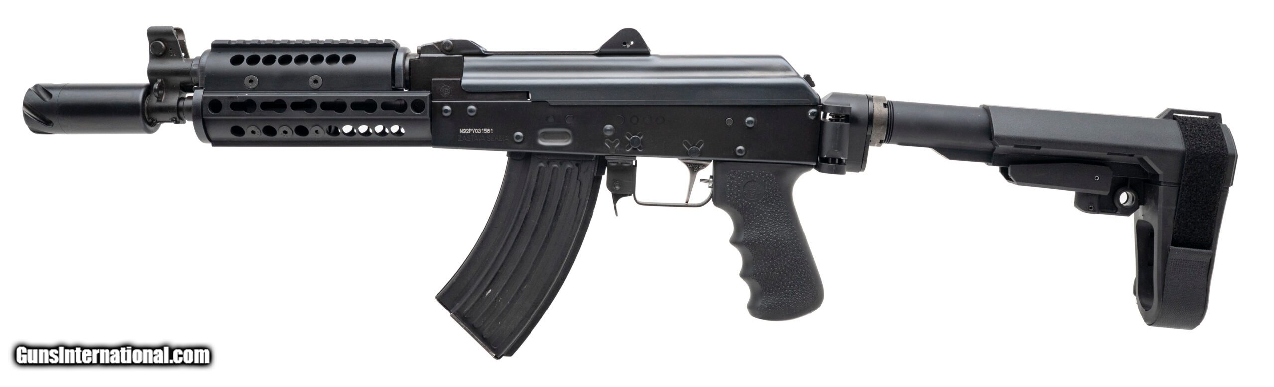 Description: "SN: M92PV031581. Modern production, 7.62x39mm with a 10"" barrel w/flash hider. Bore is very good. Serbian made tactical AK pistol with an Midwest Industries keymod handguard w/picattiny optic rail, SB Tactical collapsible brace w/Doublestar Ace folding adapter, Hogue rubber pistol grip, and blued finish. Finish shows minor handling marks throughout. Overall condition is very good. SOLD |