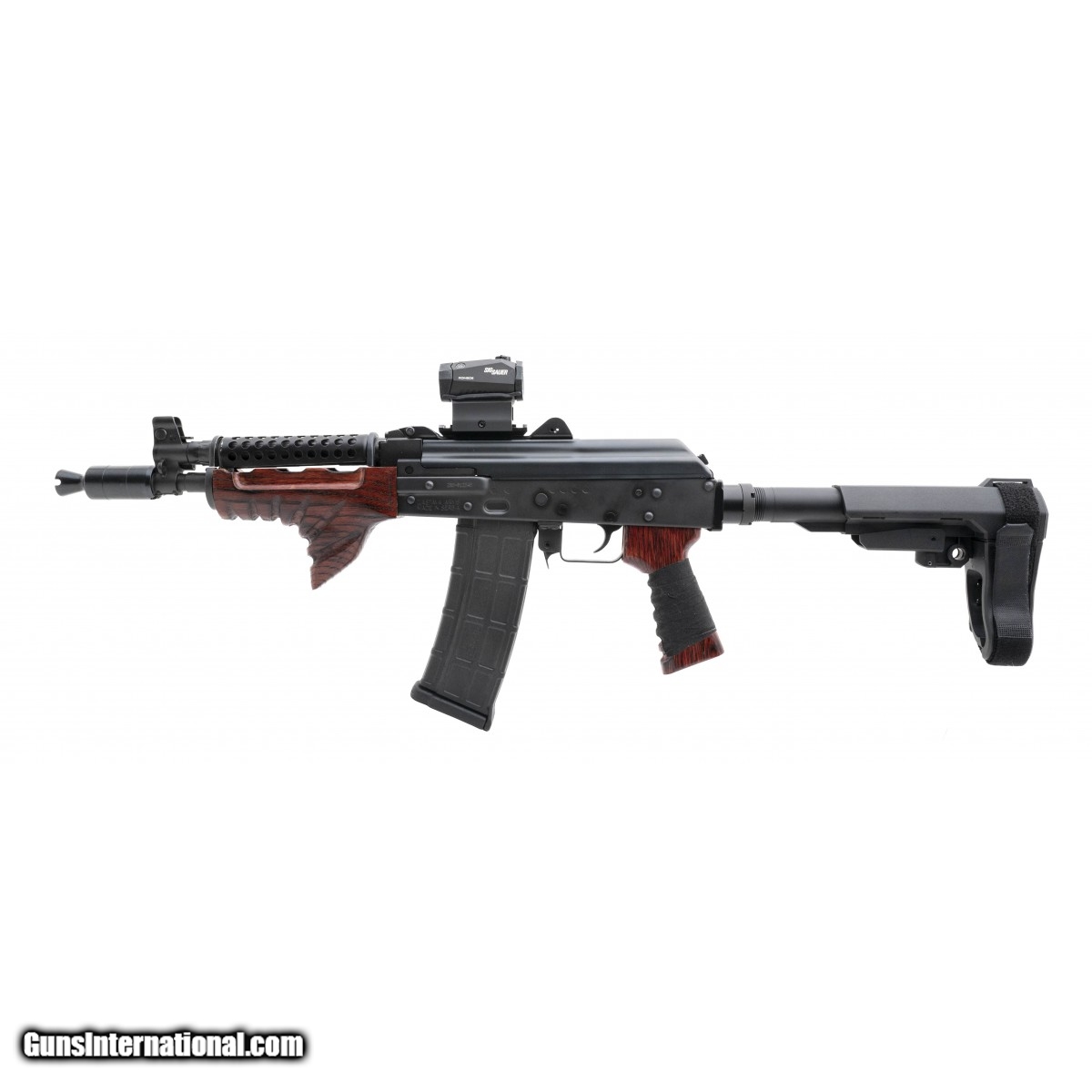 SN: Z85-012345. Serbian AK-style pistol. Has a 10-inch cold hammer forged chrome lined barrel and bulged front trunnion. Comes with a Kalashnicarver Red Shark fin lower handguard and Kalashnicarver pistol grip. Has a cheese grater upper handguard, an SB Tactical SBA3 brace, and Sig Sauer Romeo 5 optic. Overall very good condition.