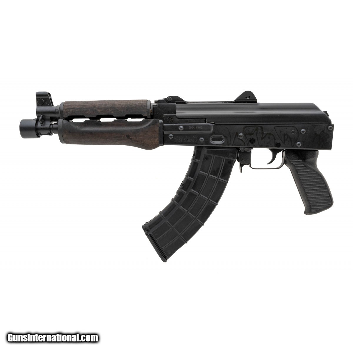 10"" chrome lined AK pistol in a blued finish with a black wooden handguard, bulged trunnion, hinged top cover with a bolt hold open notch on safety selector. NEW. UPC:685757098182