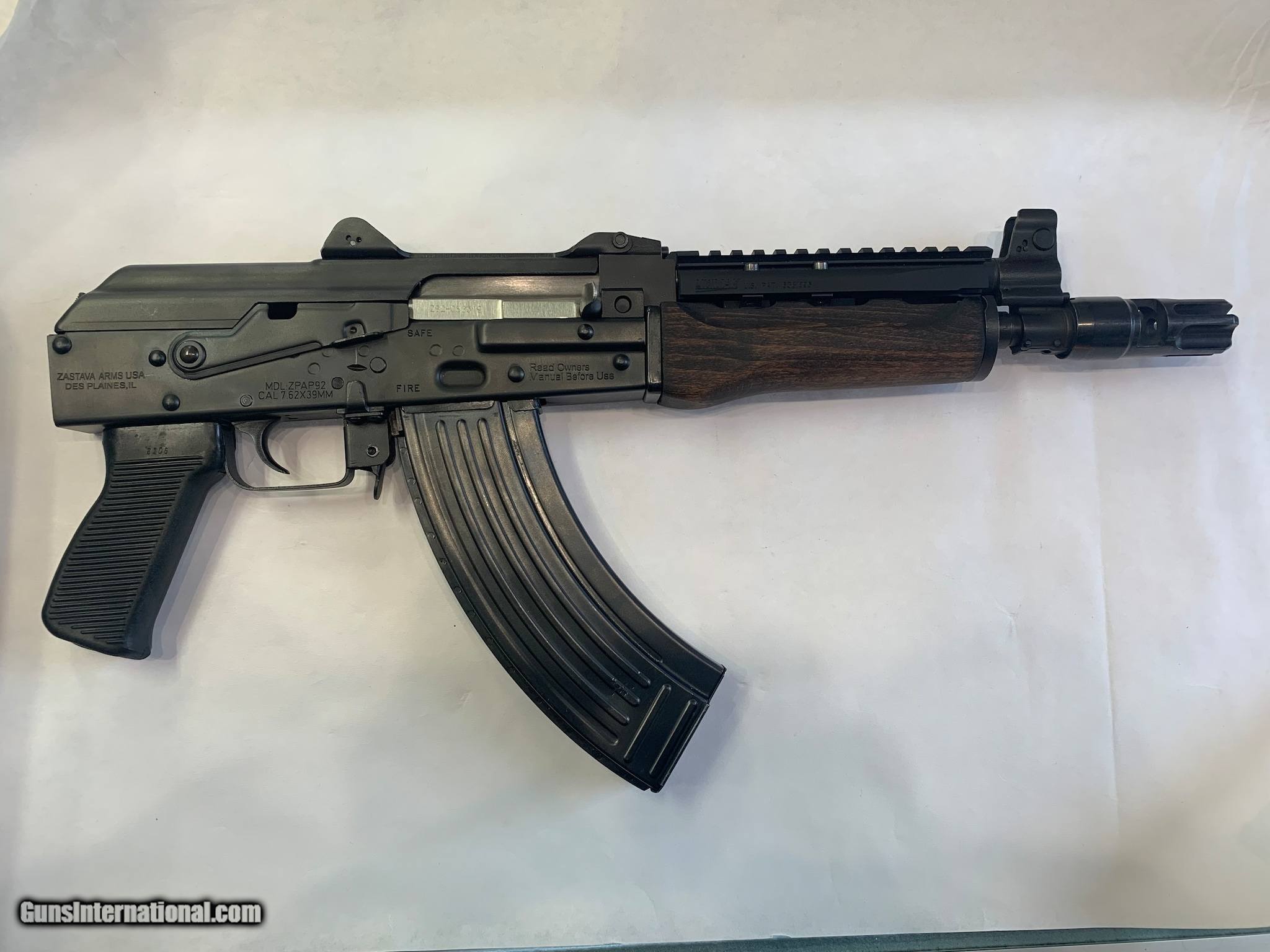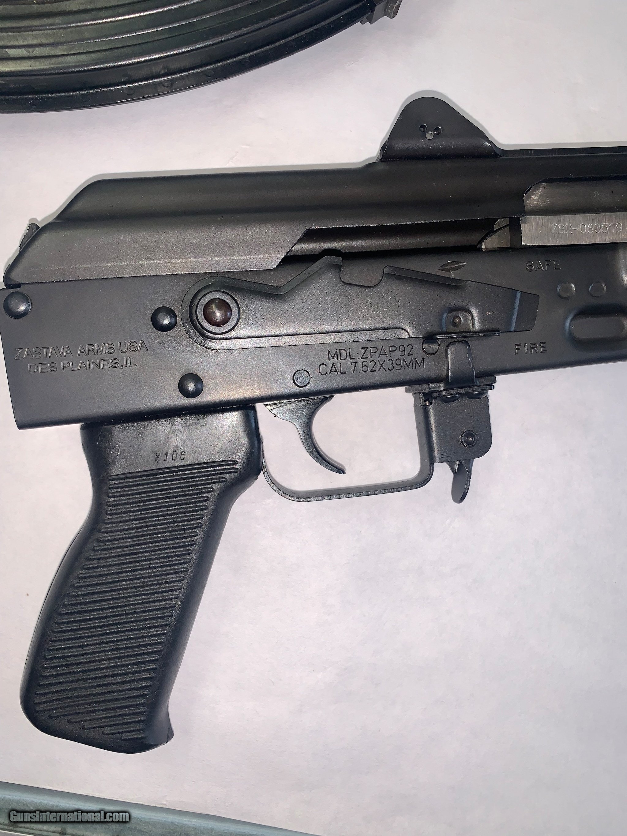 Description: Guns Listing ID: 1121947 This Zastava Arms pistol is chambered in 7.62x39mm with a 30 round magazine. SOLD Manufacturer: ZASTAVA ARMS Model: ZPAP92 AK47 Caliber Info: 7.62X39MM Condition: Used - Non-Certified Barrels: 10 BARREL Finish: BLACK AND WOOD |