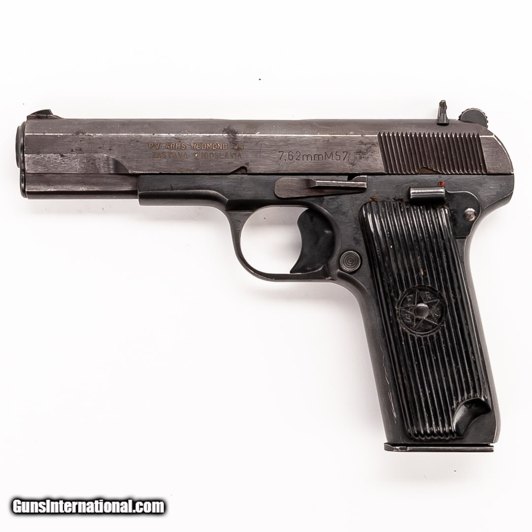 Description: Guns Listing ID: 373065 The Zastava M57 is a Yugoslavian copy of the Soviet Tokarev TT Pistol. It has a slightly longer grip to accommodate a larger magazine, but otherwise, it is essentially the same. This handgun was the standard issue sidearm of the Yugoslavian Army for decades and has always been known for its dependable and rugged nature. This M57 is in very good condition and comes with one 9-round magazine. SOLD Manufacturer: ZASTAVA Model: M57 Caliber Info: 7.62X25MM TOKAREV Condition: Used - Certified Barrels: 4.5 BARREL Finish: BLUE |