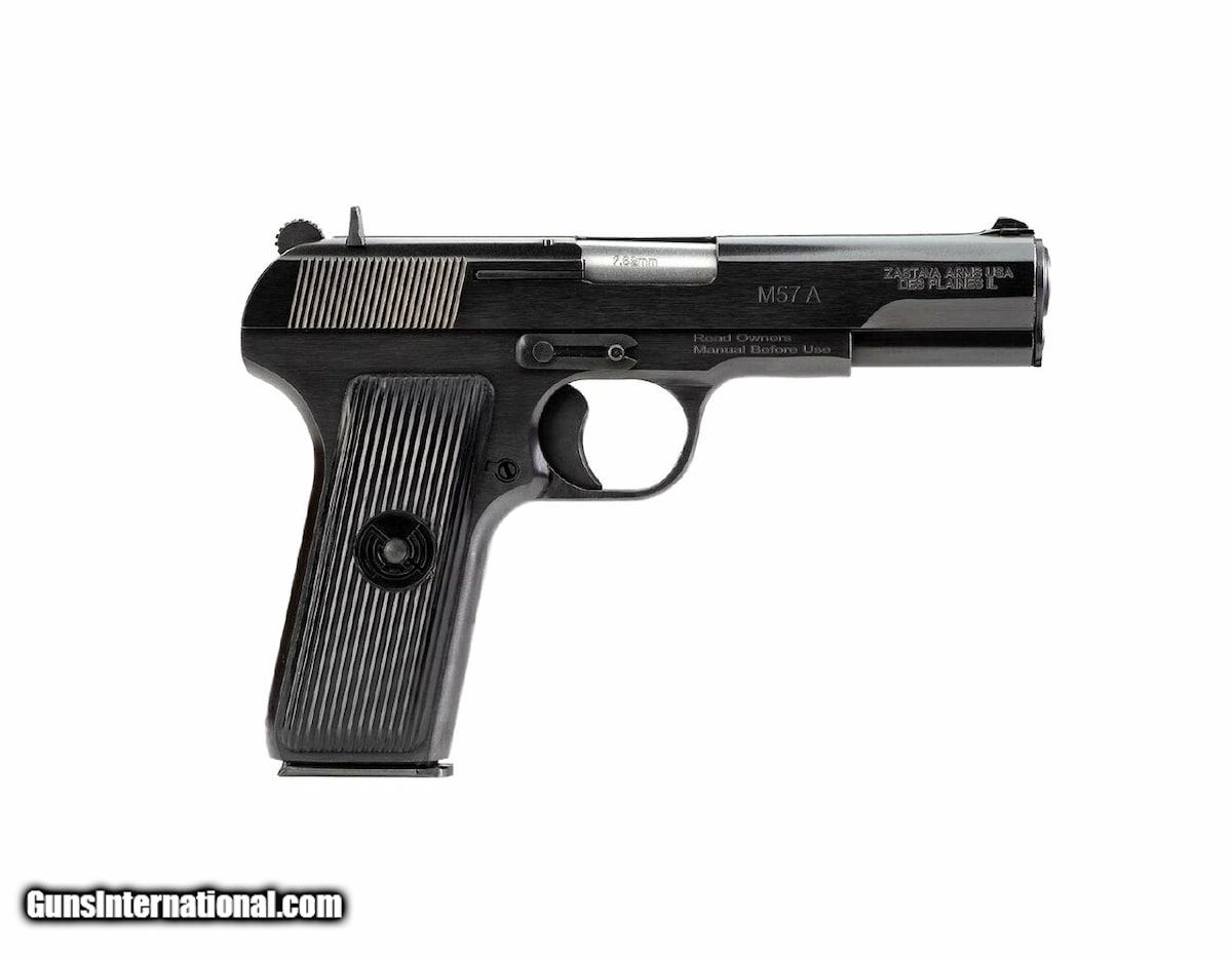 Description: Guns Listing ID: 492866 The M57A is an upgrade of the basic M57 model. Similar to the design of the Soviet TT pistol, it has been popular for decades due to its proven high quality. This classic single action weapon is known for reliability and precision. It has an external safety and ergonomic improvements in the polymer hand grip covers. - CALIBER 7.62X25MM TOKAREV - MAGAZINE (1) with 9rd capacity SOLD Manufacturer: ZASTAVA Model: M57A 7.62 TOKAREV Caliber Info: 7.62X25MM TOKAREV Condition: new Barrels: 4.5" BARREL Finish: BLUED |