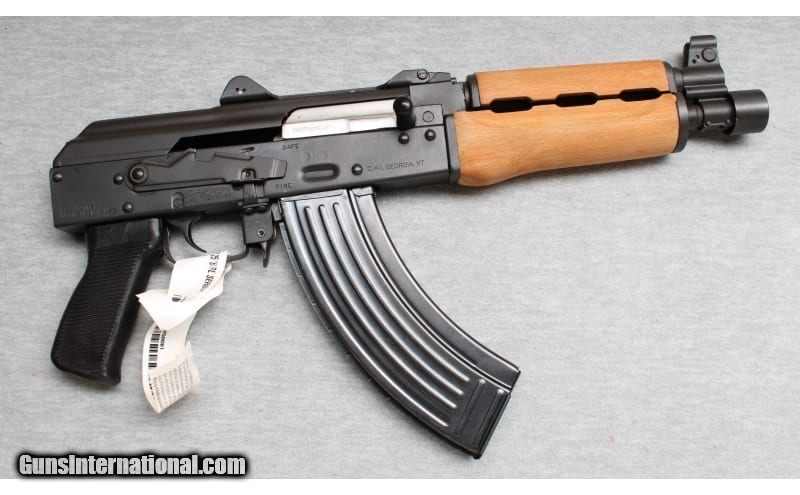 Description: Appears as new, comes with one mag. Semi auto, AK style pistol with matte finish metal, 8" barrel, adjustable iron sights, factory pistol grip and wood forend. 7.62x39mm SOLD Chambers: Semi auto Metal Condition: As new Wood Condition: As new Bore Condition: Bright Barrels: 8" barrel Triggers: "Factory, AK style trigger Fore End: Wood hand guard Butt Pad: Factory grip Sights: Iron sights Item Location: La Vista, NE |