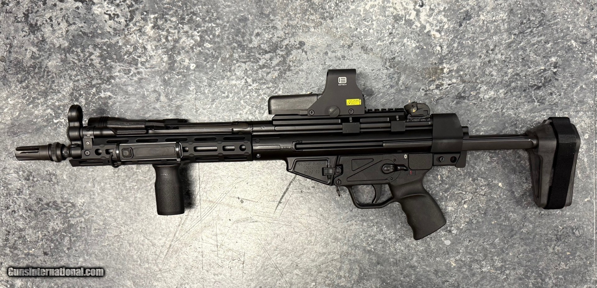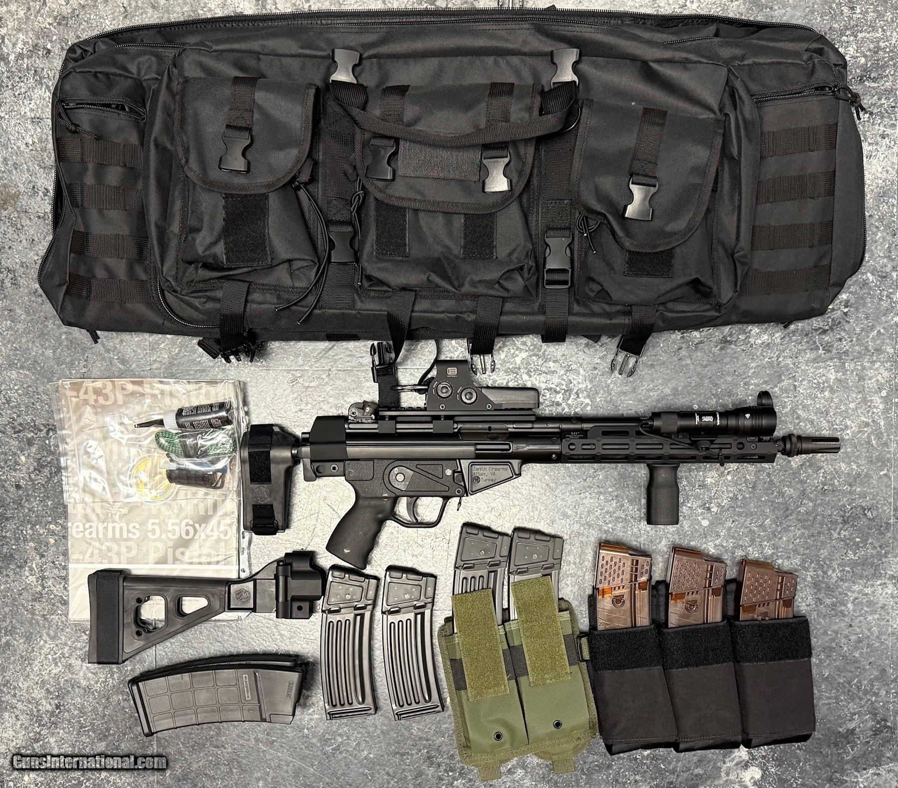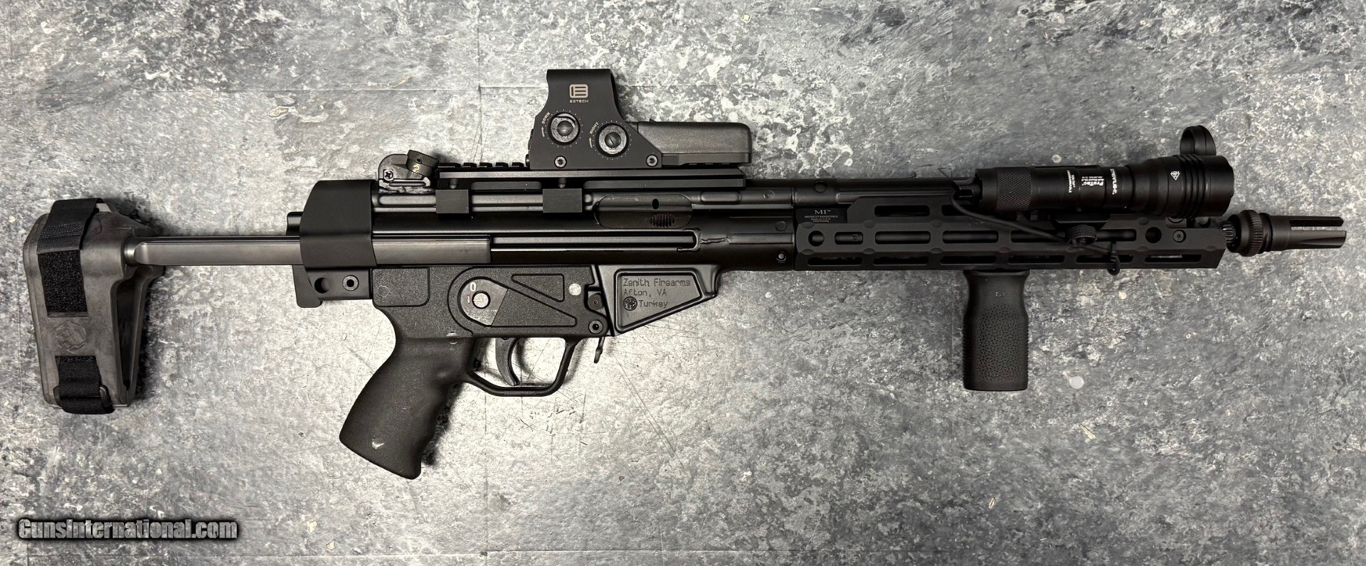 Description: Guns Listing ID: 533419 PRE-OWNED ZENITH Z43P 12\" 5.56 ROLLER DELAYED PISTOL WITH LOTS OF EXTRAS. CONDITION: EXCELLENT, THIS PISTOL IS FUNCTIONALLY FLAWLESS AND HAS NO NOTEWORTHY BLEMISHES. THIS PISTOL WILL SHIP WITH THE Z43P PISTOL WITH AN INSTALLED OPTIC MOUNT, EOTECH 512, MIDWEST INDUSTRIES MLOK HANDGUARD, STREAMLIGHT HL-X 1000 LUMEN WEAPON MOUNTED LIGHT, AAC 51T FLASH HIDER, AND MAGPUL FORWARD GRIP. THIS PISTOL WILL ALSO SHIP WITH THE ORIGINAL OWNERS MANUAL, CLEANING KIT, TWO BANDOLEERS, A SB FOLDING BRACE, FOUR (4) GERMAN MADE METAL MAGAZINES, THREE (3) HK CLEAR MAGAZINES, THREE (3) POLYMER MAGAZINES, AND A TWO CARBINE CASE. THIS PISTOL WILL NOT SHIP WITH IT‚‚S ORIGINAL BOX, ORIGINAL HANDGUARD, OR ORIGINAL MUZZLE DEVICE. SOLD Manufacturer: ZENITH FIREARMS Model: Z43P Caliber Info: 5.56X45MM NATO Condition: Used - Non-Certified Barrels: 12 BARREL Action: SEMI AUTOMATIC Finish: black |