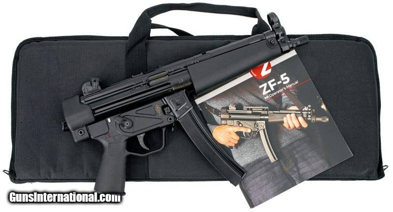 Description: Guns Listing ID: 330083 The ZF-5 is an American-made MP5-style close-quarters pistol. The ZF-5 features all of the popular features of the venerable MP5 system such as the roller-delayed blowback action and side charging handle that allows users to perform the famous \"HK Slap\" technique. Additional iconic features include the rotary drum rear sight and hooded front sight to complete the MP5 clone look. This model features an all-black finish. One 30-round magazine and a soft carry case is included. The barrel features a 3-lug thread protector. SOLD Manufacturer: ZENITH Model: ZF-5 [BLK] Caliber Info: 9MM LUGER (9X19 PARA) Condition: new Barrels: 8.9" BARREL Action: BLOWBACK Finish: BLACK Weight: 5.5 LBS. |