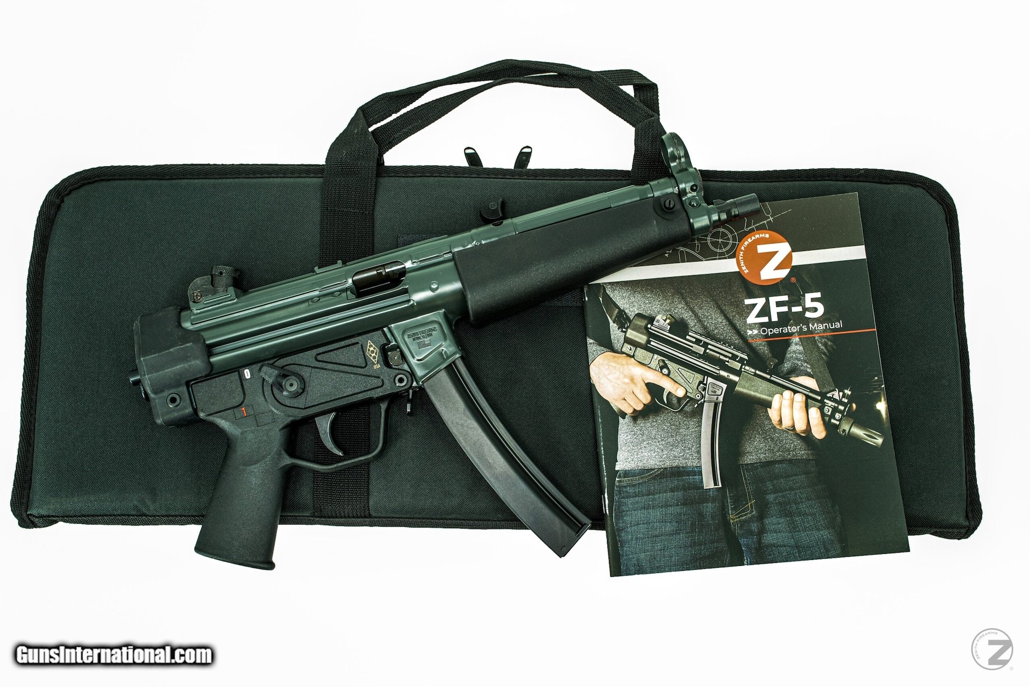Description: Guns Listing ID: prod303104 The ZF-5 is an American-made MP5-style close-quarters pistol. The ZF-5 features all of the popular features of the venerable MP5 system such as the roller-delayed blowback action and side charging handle that allows users to perform the famous \"HK Slap\" technique. Additional iconic features include the rotary drum rear sight and hooded front sight to complete the MP5 clone look. This model features a gray receiver finish. One 30-round magazine and a soft carry case is included. The barrel is threaded and features a 3-lug thread protector. SOLD Manufacturer: ZENITH Model: ZF-5 [GRY] Caliber Info: 9MM LUGER (9X19 PARA) Condition: new Barrels: 8.9 BARREL Finish: GRAY |