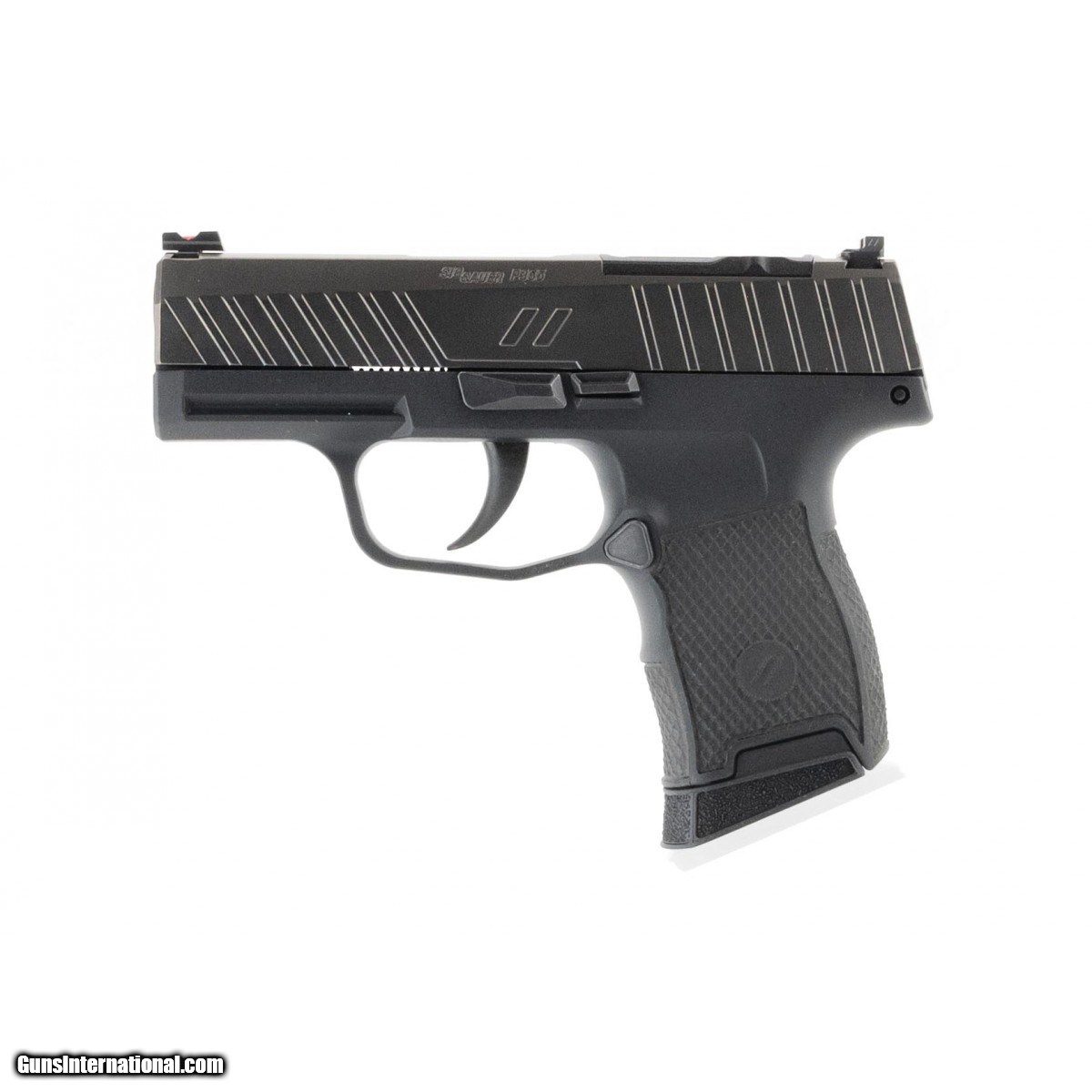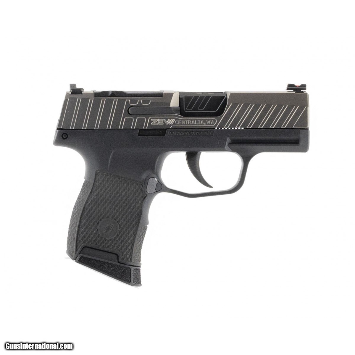 Zev Technologies custom Sig P365 with Zev Octane slide cut for optic. Grip has diamond pattern stippling. Fiber optic front sight. Comes with a 10 round magazine. New.