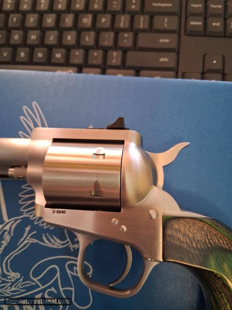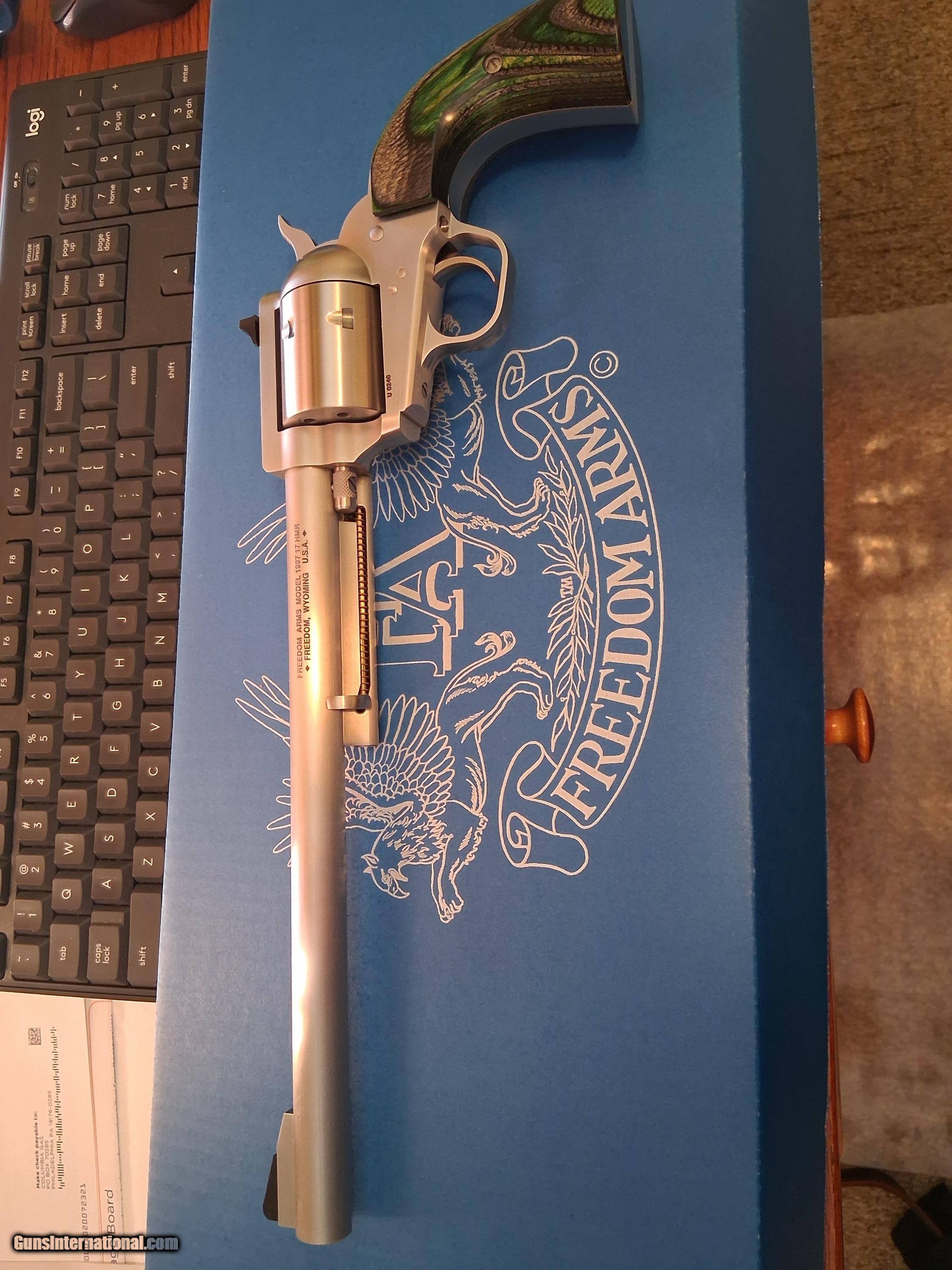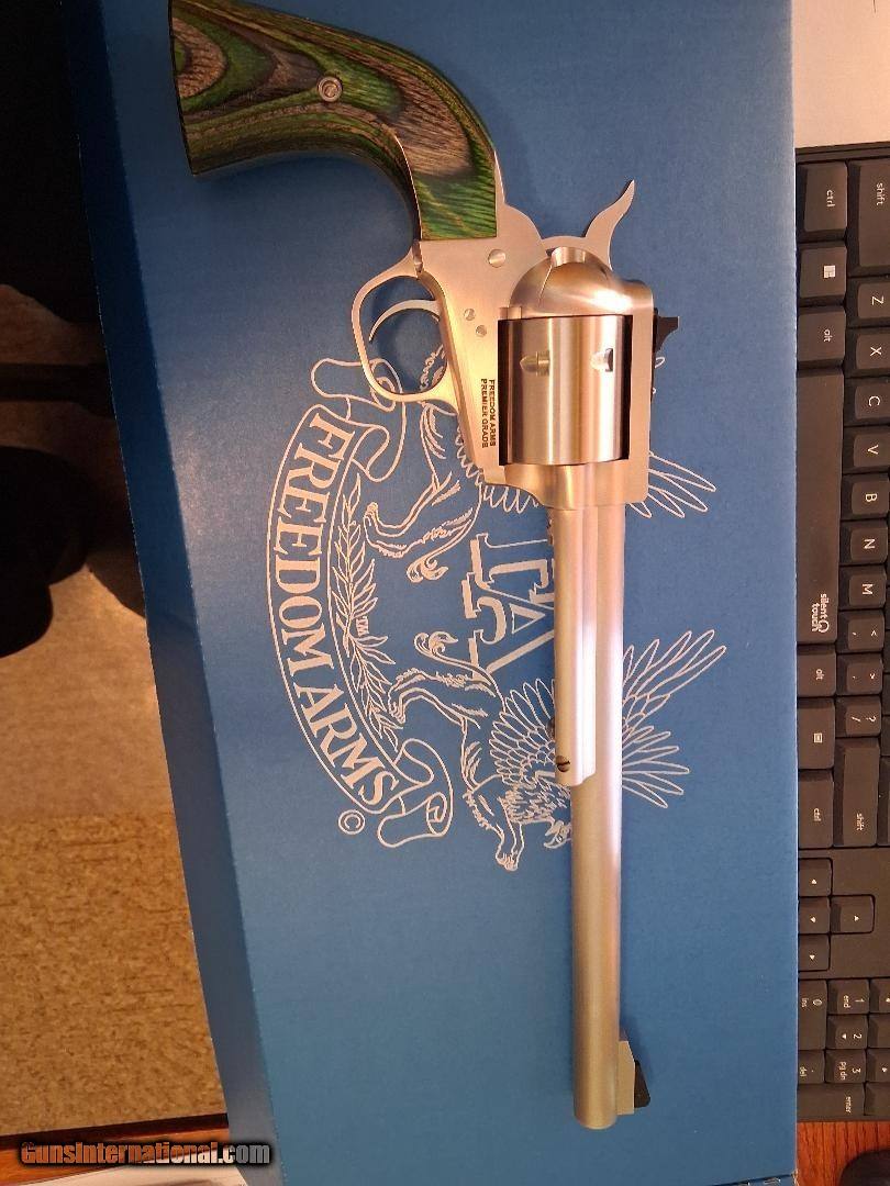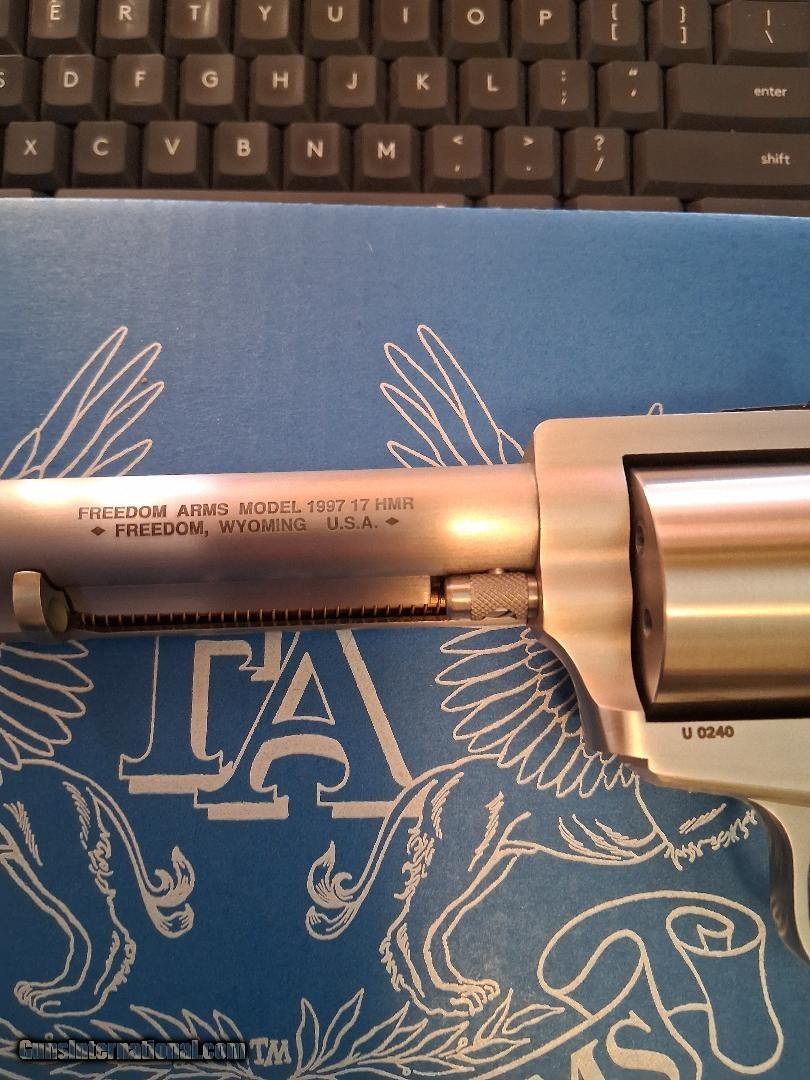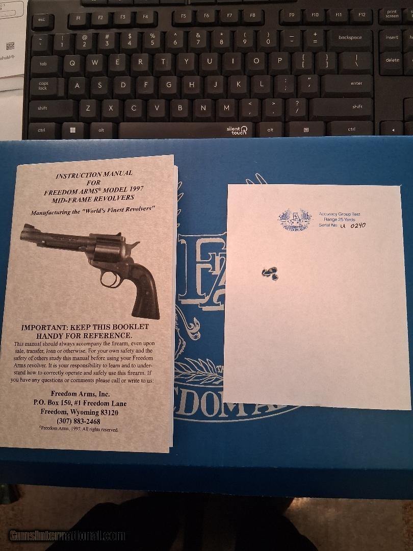 Description: I am looking to sell my Freedom Arms Model 97 in 17hmr caliber. This revolver has a 10" barrel and comes with the factory adjustable rear sight. Excellent condition, except for a minor wear line on portion of cylinder (can be seen in picture). Has the evergreen (green/black) laminated factory grips. Comes with box, instruction manual and test target. Shoots fantastic, looking to sell to fund an AR project. Contact me with offers. A new one is about $3000 and new orders are an approximate 18 month wait. Item will ship from my FFL to your FFL within the continental United States only please. Shipping is a flat $50. Handgun Caliber: .17 HMR Price: $2,500.00 Contact Seller |
