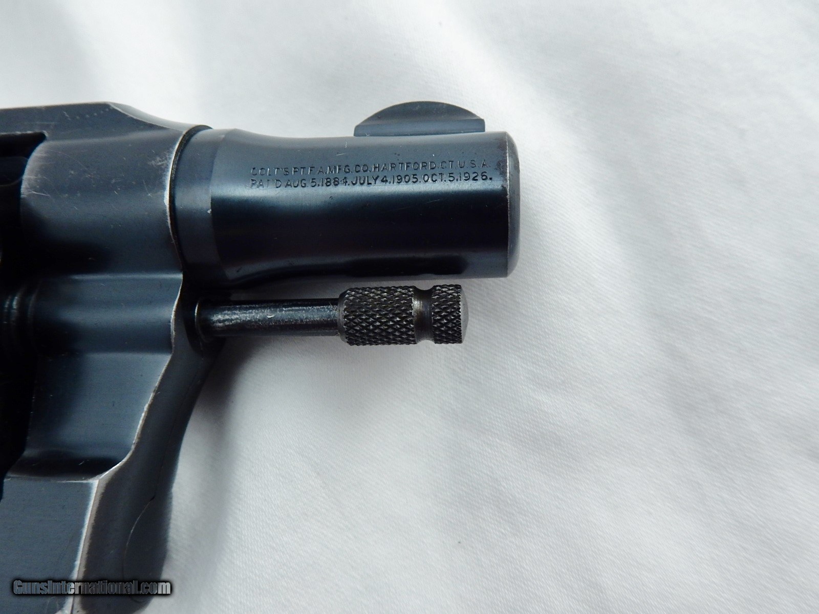 Description: This is a Colt bankers special 22 with a 2 inch barrel. This gun is 85% with honest wear. Serial # is 368xxx. Buyer pays 45.00 shipping. Thank you. 45-1-8 SOLD |