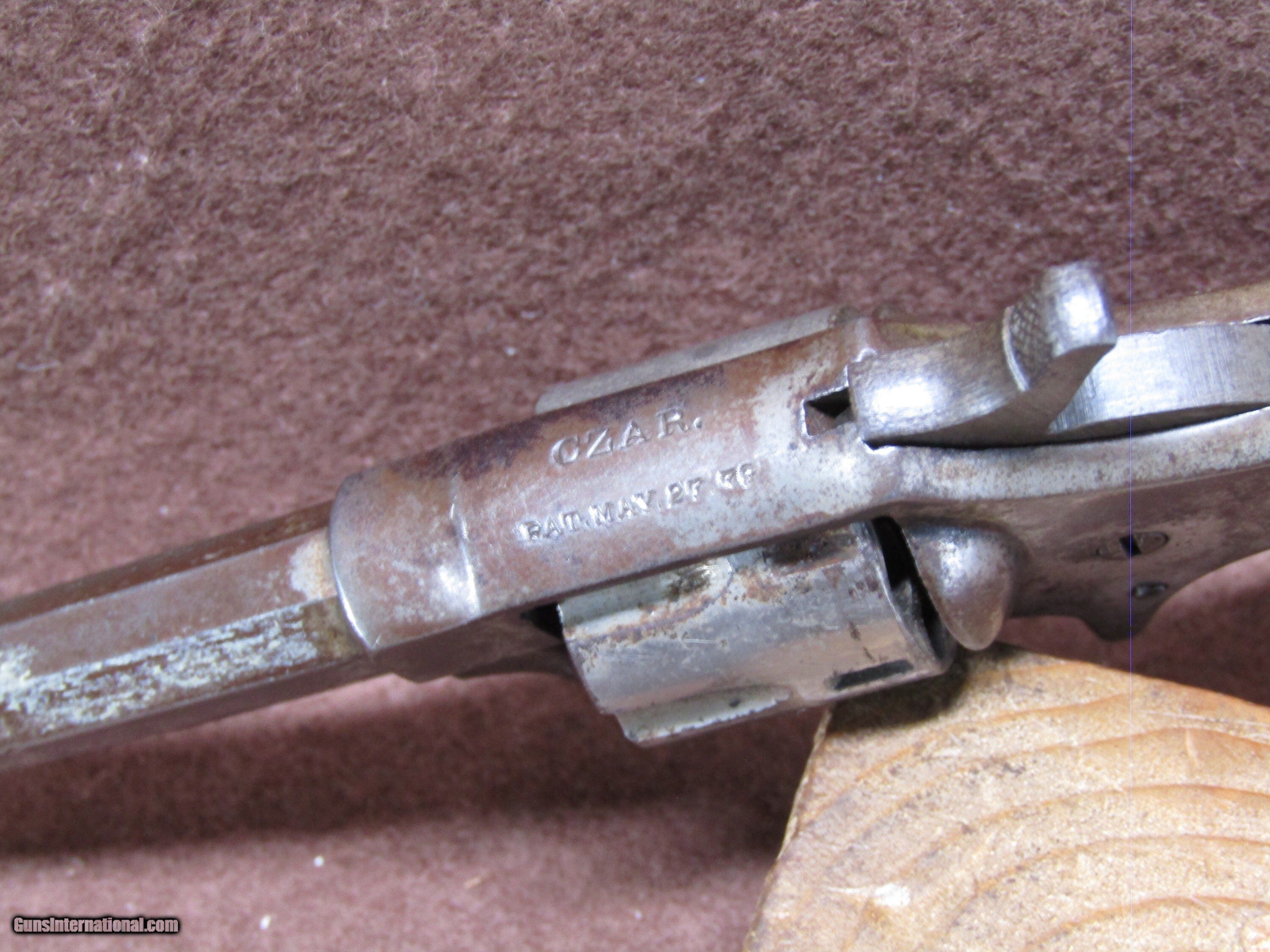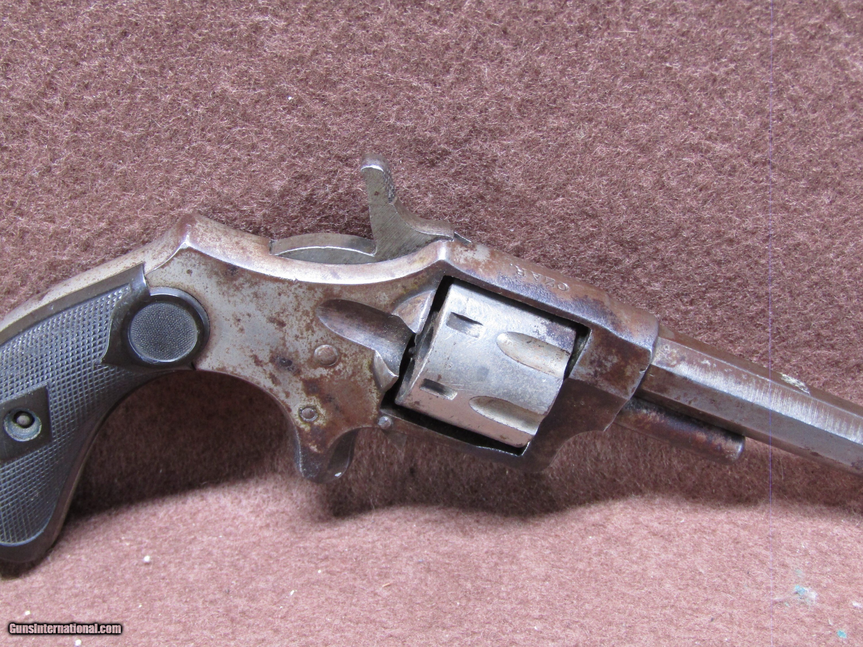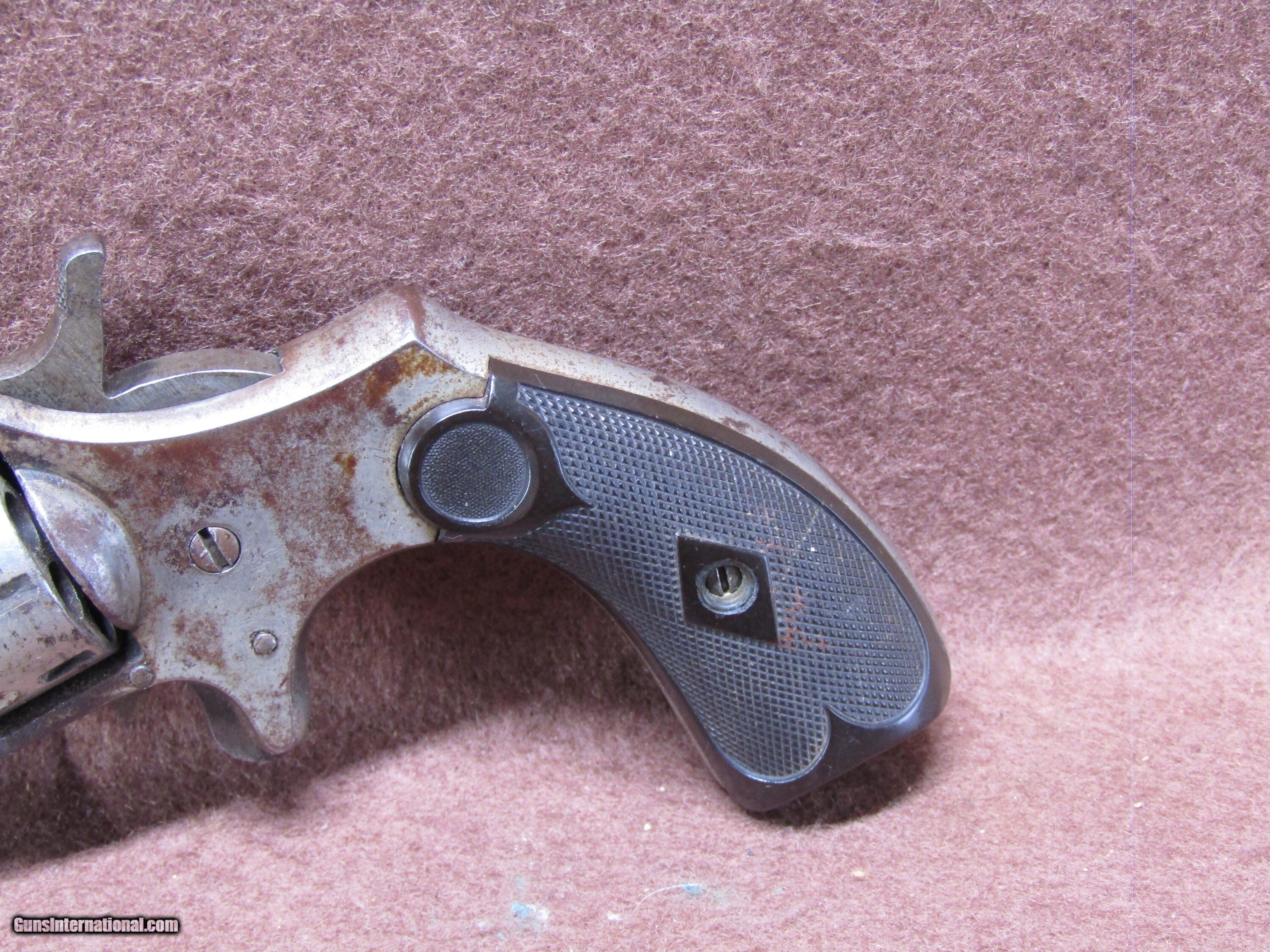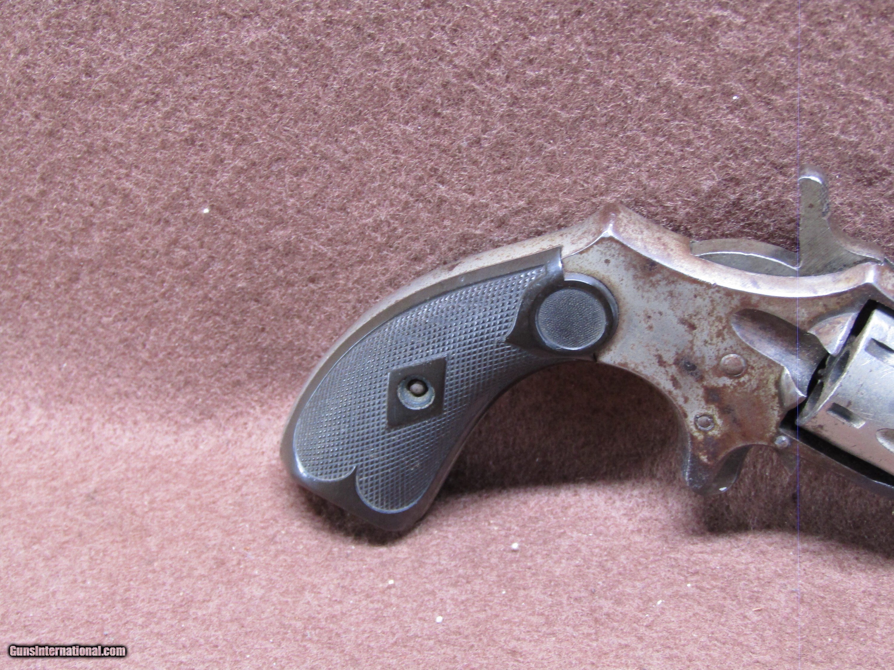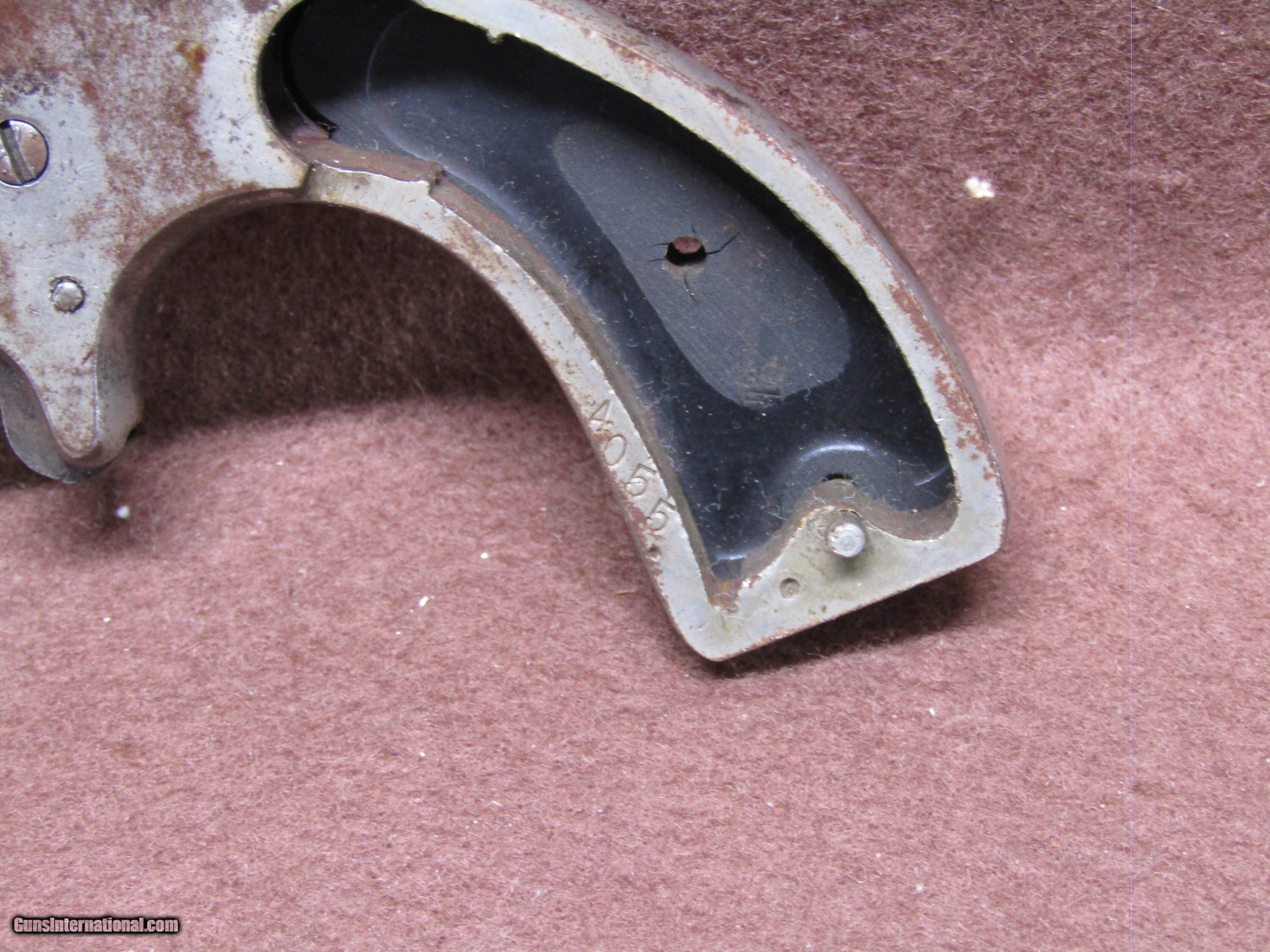 Description: Antique Hopkin & Allen Czar 22 Short 7 Shot Spur Trigger Single Action Revolver with a 3.5" Octagon Barrel and a Missing Front Sight. The Nickel Finish has turned to a Brown Patina. The Black Checkered Hard Rubber Grips are in Surprisingly Good Condition. The Action Doesn't Work at all. The Bore is Dark due to Age. The Serial Number is 4055. Handgun Caliber: .22 Short Manufacturer: Hopkins & Allen Model: Czar Serial Number: 4055 Barrel Length: 3.5" Octagon Chambers: 7 Condition: Fair Metal Condition: Fair Bore Condition: Dark due to Age Price: $120.00 Shipping: $32.88 Contact Seller |