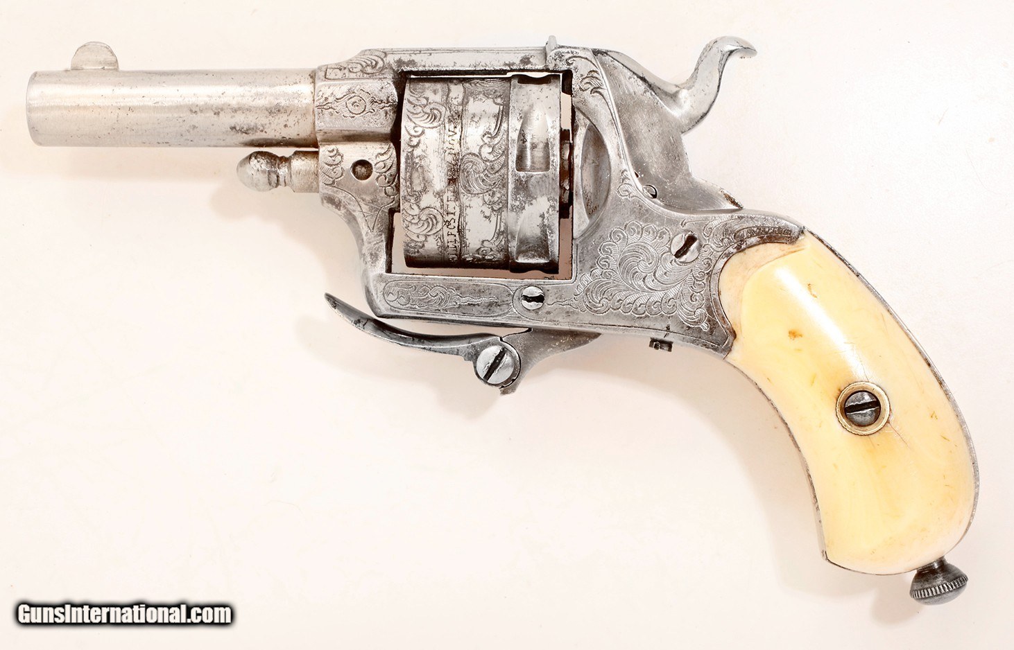 Description: I'm selling my collection. Here is an Antique Finely Engraved .22 Short Double Action Pocket Folding Trigger Revolver in a good condition. FFL is not required. It’s chambered in .22 RimFire (short). It was manufactured circa pre-1898, this precious factory engraved double action revolver comes with its ivory grips, its ejecting rod is clerverly screwed in the butt alike a laynyard ring would be on a larger revolver. This small pocket revolver concealable in the palm of your hand or in a vest, belly belt & boots were in high demand., 1.7/8" round barrel with a good shinny bore with sharp rifling. Cylinder with 6 round clean chambers. Action function well with good timing. Original nickel finish rates 85% with minor oxidation spots. All around the cylinder surrounded by engraving is marked: "RimFire Pistol Lily's Cart LifCs Feb27.Nov1873". I described it to the best of my knowledge. The old ammunitions showed on one of those pictures are not for sale. Please don't ask for extra pictures. I will ship the gun to the 48 contiguous states. $395 + $35 insured shipping to your door if you are over 21, payable by cashier check, P.M.O or credit card. Please have look on my other s. Thank you SOLD Antique: Yes Handgun Caliber: .22 Short |