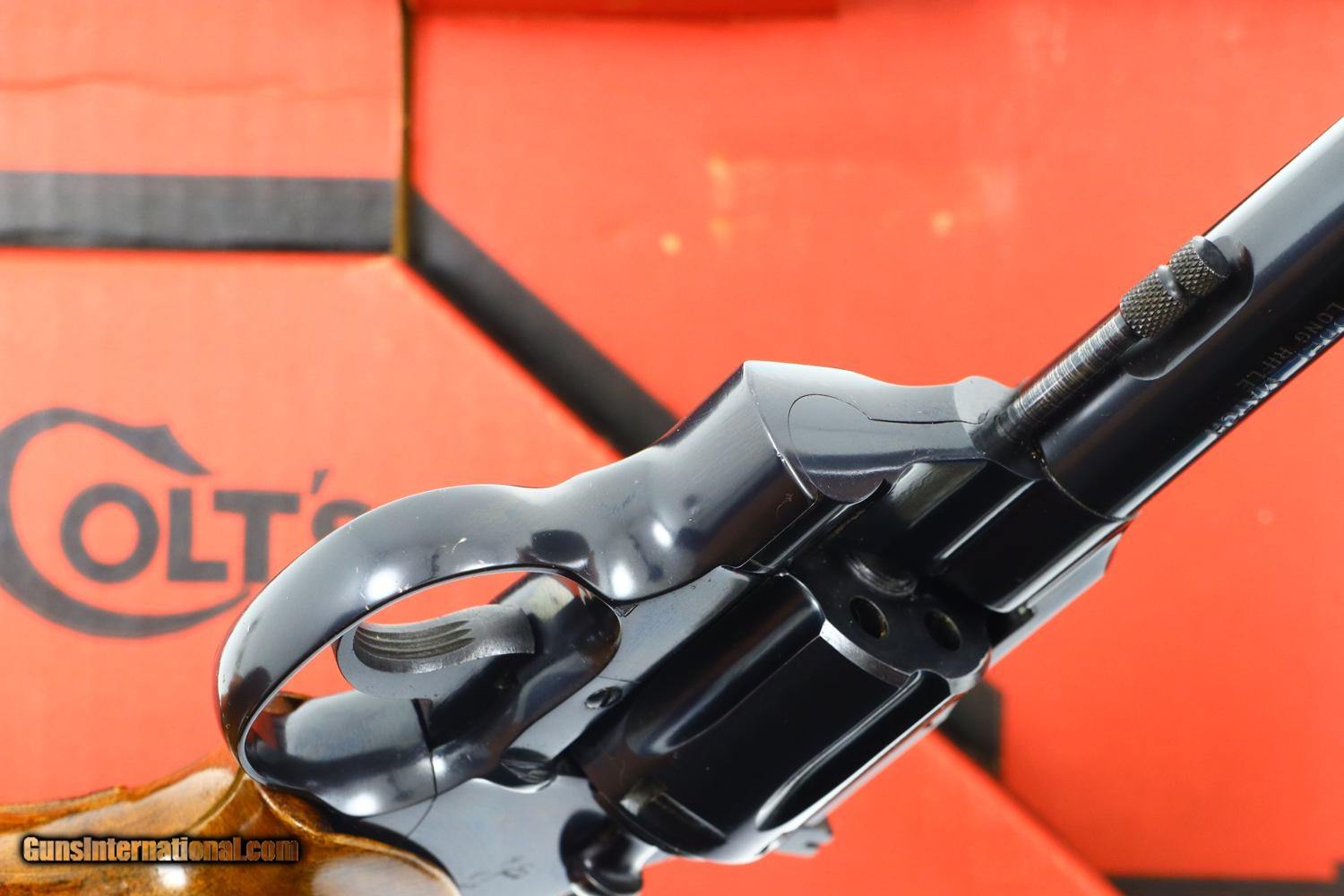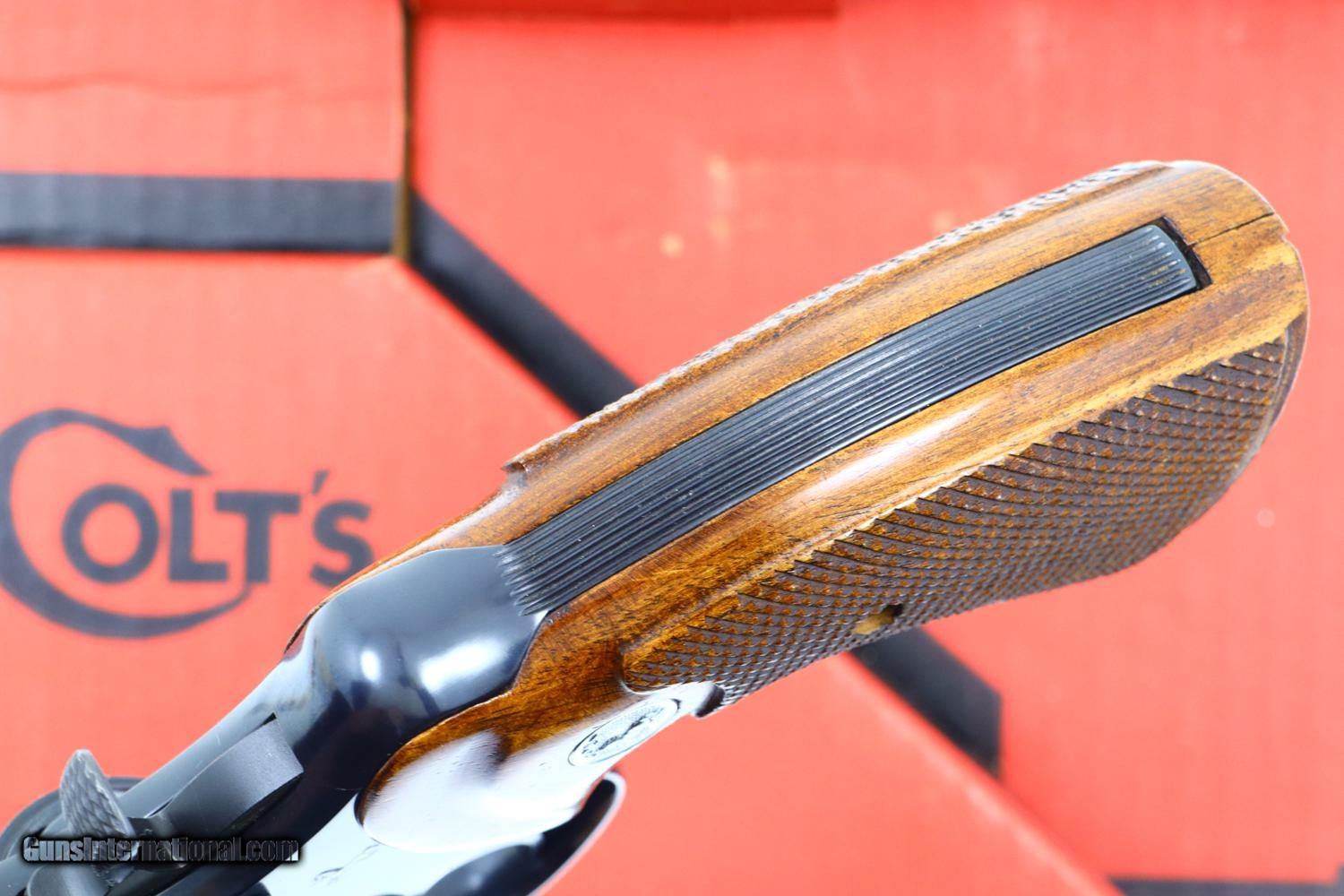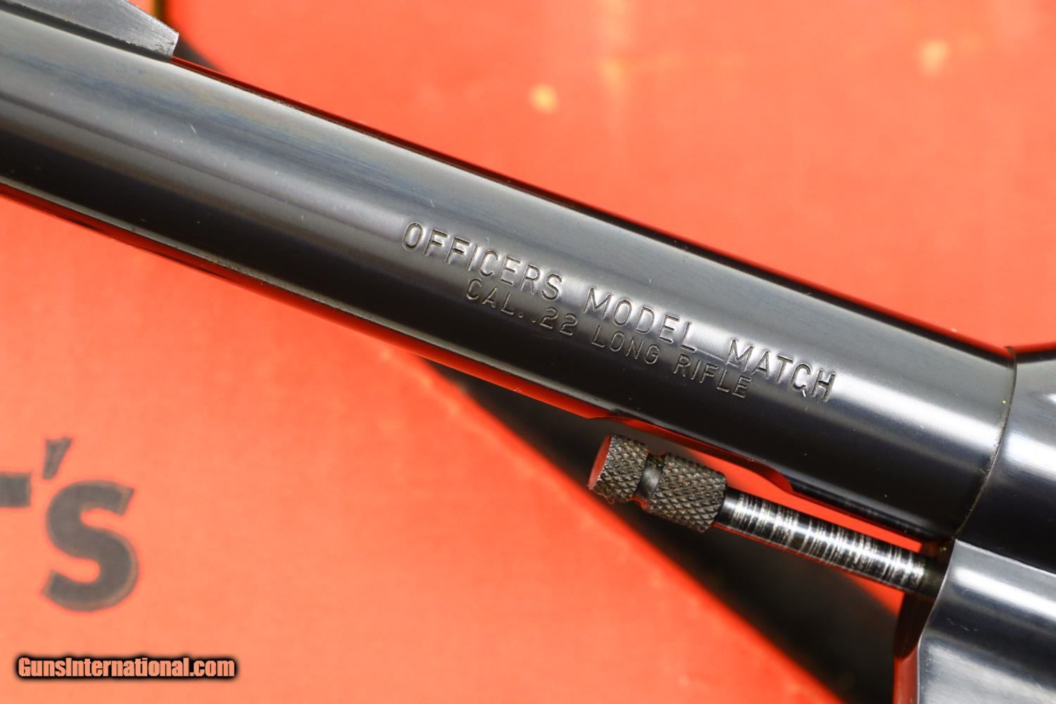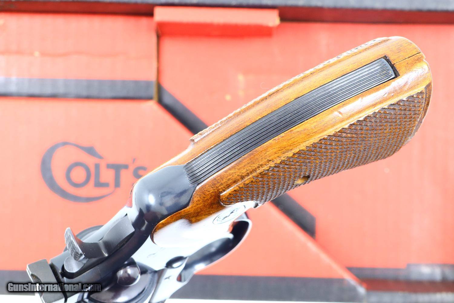 Description: Synopsis: Beautiful Colt, Officers Model Match, .22 LR Revolver, Boxed, 88778, FB00995 Description: Classic Colt Officers Model Match .22 LR Revolver, 6 shot, with 6” barrel having ramped patridge front sight and fully adjustable rear sight. Usual model and caliber marking on left side of barrel. Rampant Colt on sideplate. Colt address on right side of barrel. Matching SN on crane and frame. Semi beavertail hammer, grooved trigger, and full target grip with silvered Colt medallions. Complete in two piece woodgrain box with gold Colt name on top. End label has been removed. White wax penciled “936812” on bottom. No literature. Condition: Exc with crisp original salt blue. Sides of hammer nicely polished without oxidation. Grip with scattered light handling marks. Mirror bore. Perfect manual mechanics. VG box missing label with base wax penciled to a different revolver. No Literature. ~~Insured shipping fee of $55; most packages shipped using FedEx 2nd Day.~~ SOLD Manufacturer: Colt Serial Number: 88778 Caliber Info: 0.22 |