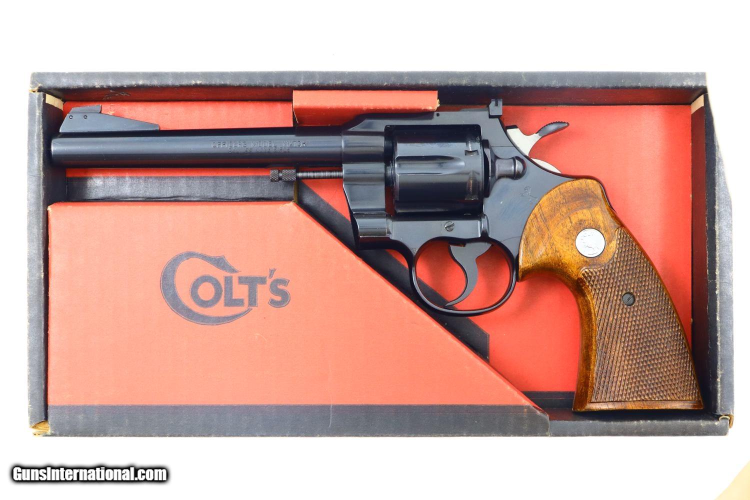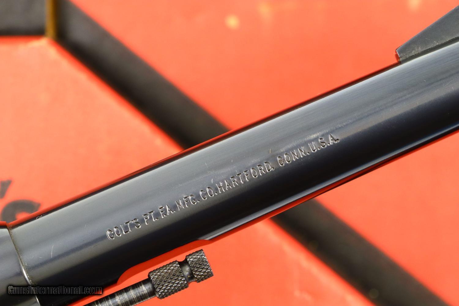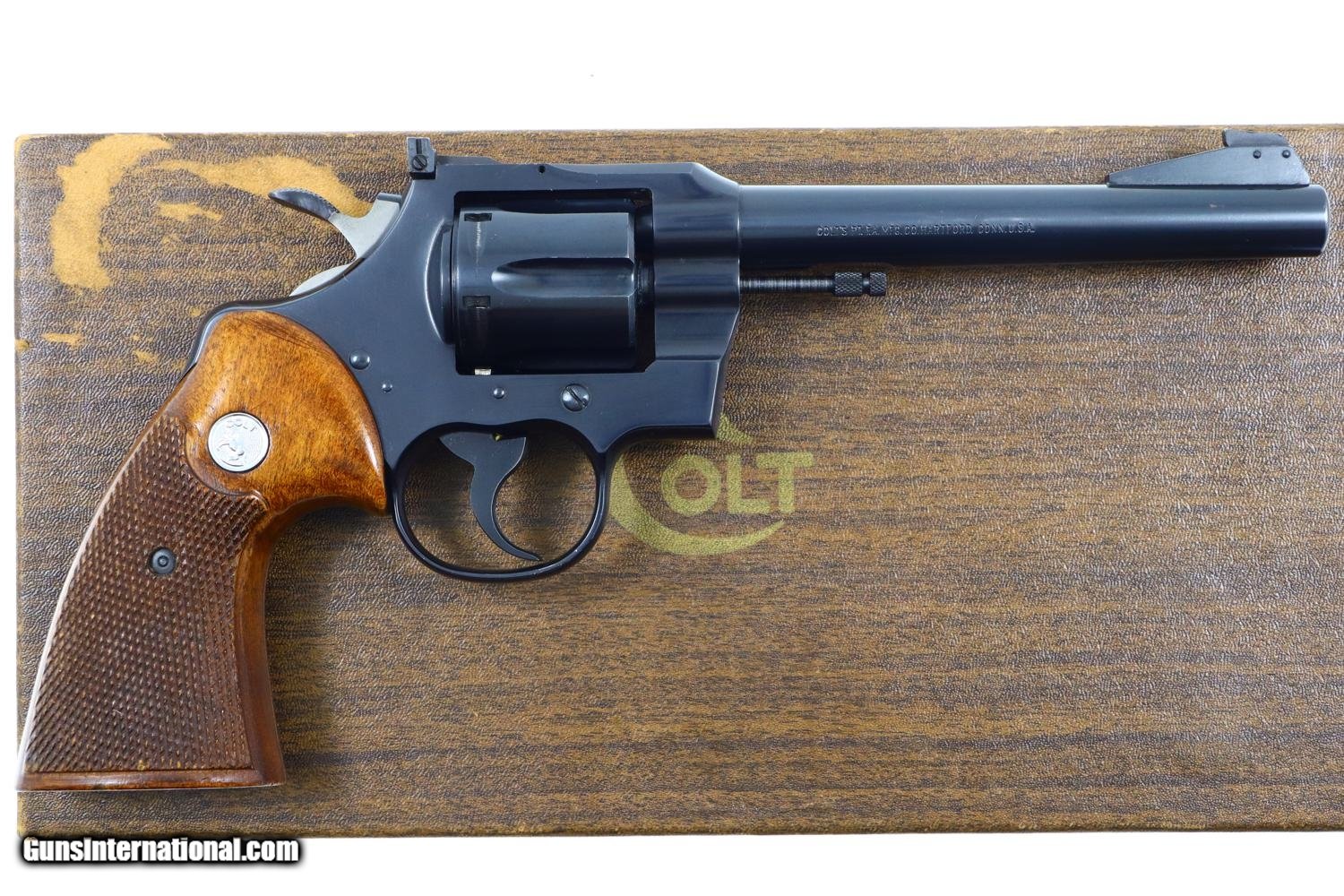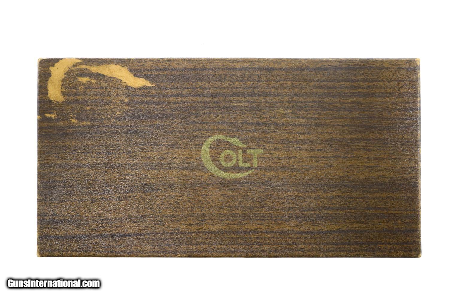 Description: Synopsis: Beautiful Colt, Officers Model Match, .22 LR Revolver, Boxed, 88778, FB00995 Description: Classic Colt Officers Model Match .22 LR Revolver, 6 shot, with 6” barrel having ramped patridge front sight and fully adjustable rear sight. Usual model and caliber marking on left side of barrel. Rampant Colt on sideplate. Colt address on right side of barrel. Matching SN on crane and frame. Semi beavertail hammer, grooved trigger, and full target grip with silvered Colt medallions. Complete in two piece woodgrain box with gold Colt name on top. End label has been removed. White wax penciled “936812” on bottom. No literature. Condition: Exc with crisp original salt blue. Sides of hammer nicely polished without oxidation. Grip with scattered light handling marks. Mirror bore. Perfect manual mechanics. VG box missing label with base wax penciled to a different revolver. No Literature. ~~Insured shipping fee of $55; most packages shipped using FedEx 2nd Day.~~ SOLD Manufacturer: Colt Serial Number: 88778 Caliber Info: 0.22 |