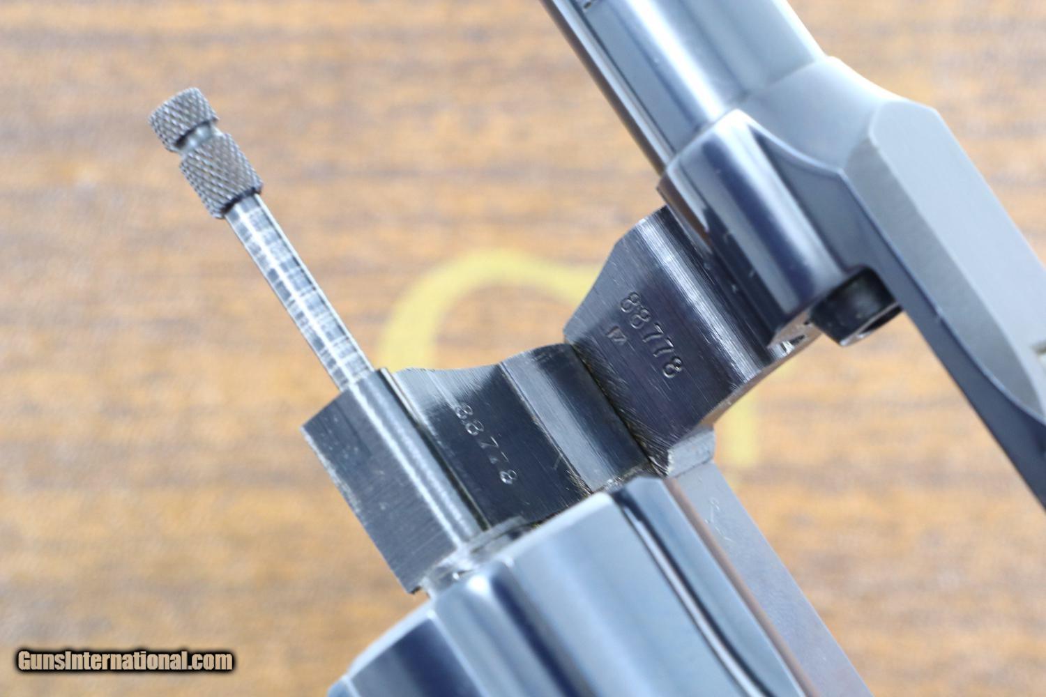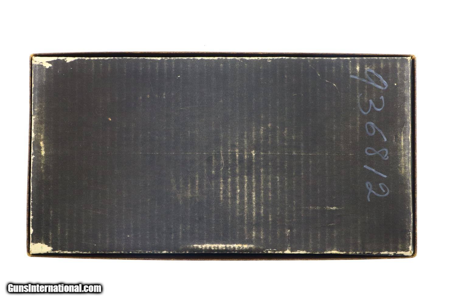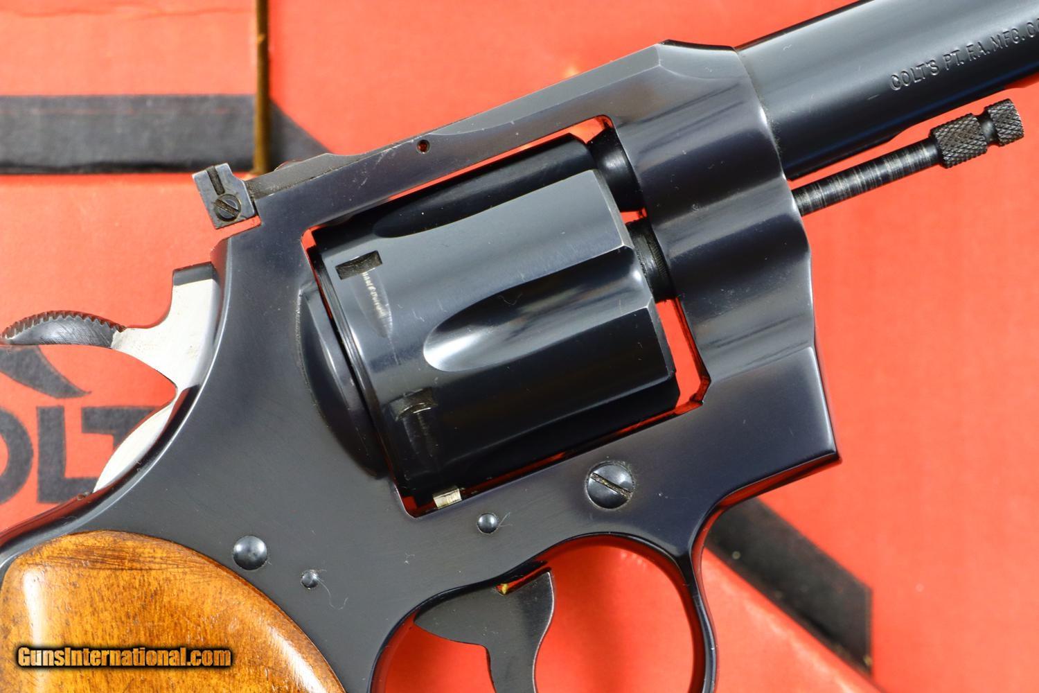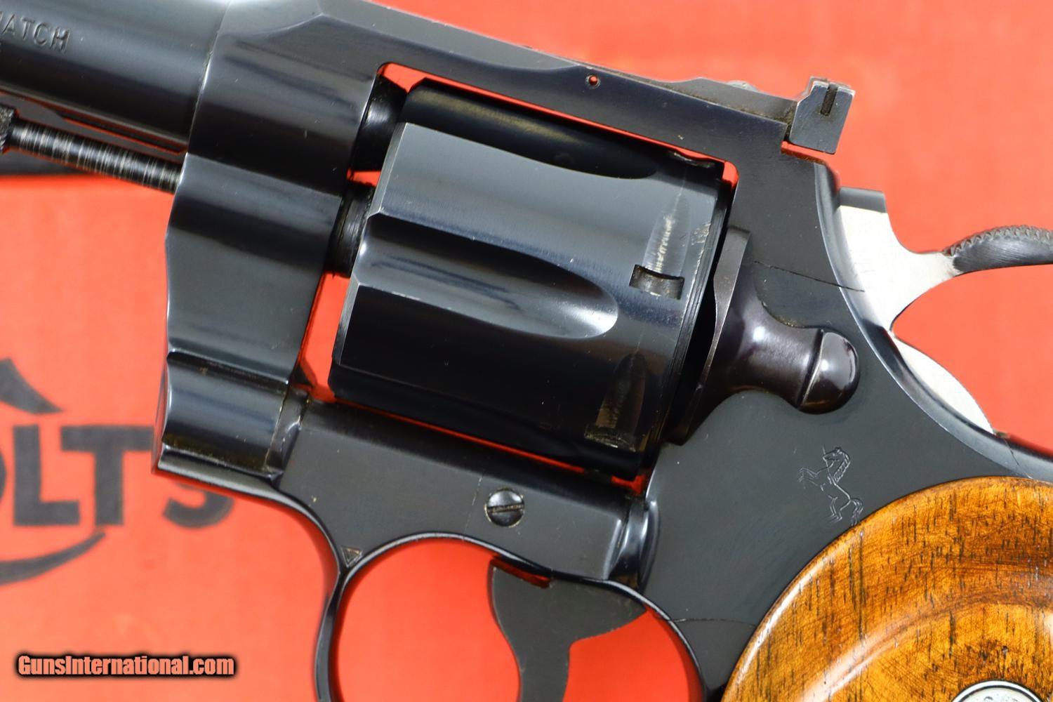 Description: Synopsis: Beautiful Colt, Officers Model Match, .22 LR Revolver, Boxed, 88778, FB00995 Description: Classic Colt Officers Model Match .22 LR Revolver, 6 shot, with 6” barrel having ramped patridge front sight and fully adjustable rear sight. Usual model and caliber marking on left side of barrel. Rampant Colt on sideplate. Colt address on right side of barrel. Matching SN on crane and frame. Semi beavertail hammer, grooved trigger, and full target grip with silvered Colt medallions. Complete in two piece woodgrain box with gold Colt name on top. End label has been removed. White wax penciled “936812” on bottom. No literature. Condition: Exc with crisp original salt blue. Sides of hammer nicely polished without oxidation. Grip with scattered light handling marks. Mirror bore. Perfect manual mechanics. VG box missing label with base wax penciled to a different revolver. No Literature. ~~Insured shipping fee of $55; most packages shipped using FedEx 2nd Day.~~ SOLD Manufacturer: Colt Serial Number: 88778 Caliber Info: 0.22 |