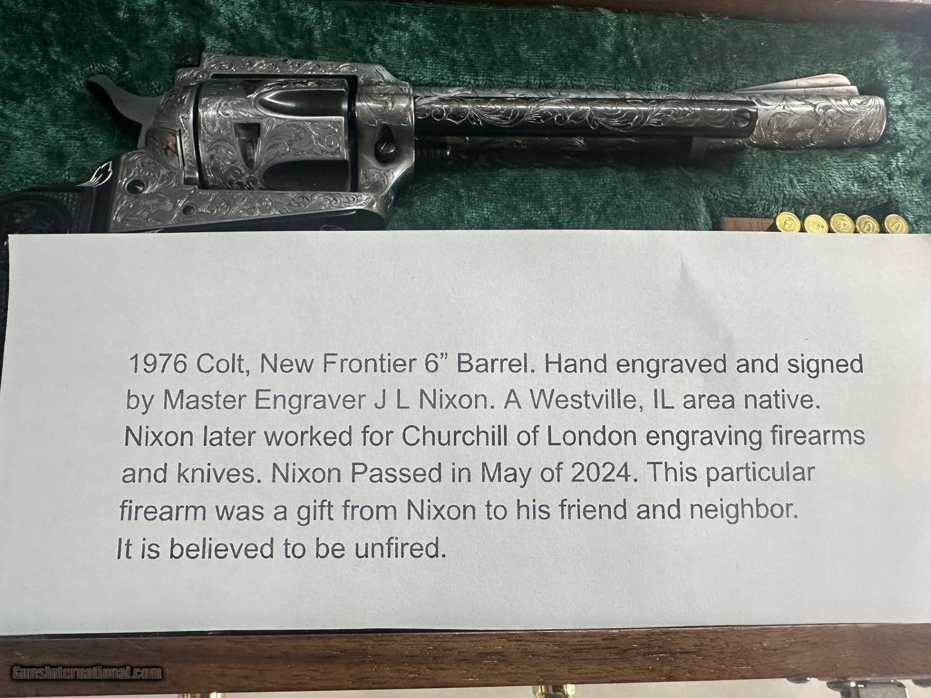 Description: 1976 Colt New Frontier Revolver with a wood Display Case With both .22 Long Rifle and .22 Magnum Cyl's engraved. 1976 Colt, New Frontier 6” Barrel. Hand engraved and signed by Master Engraver J L Nixon. A Westville, IL area native. Nixon later worked for Churchill of London engraving firearms and knives. Nixon Passed in May of 2024. This particular firearm was a gift from Nixon to his friend and neighbor John Harrier. It is believed to be unfired. Please call or email for additional pictures or questions on this and other fine firearms in stock at WRM Sales and Service. Or check us out at wrmsalesandservice Shipping is FFL to FFL insured. Please add $65 for shipping to your FFL Handgun Caliber: .22 WMR (.22 Magnum) Manufacturer: Colt Model: New Frontier Serial Number: G181810 Barrel Length: 6 Bore Info: Excellent Like New Condition: Excellent Metal Condition: Excellent Wood Condition: Excellent Bore Condition: Excellent Price: $2,100.00 Shipping: $65.00 Contact Seller |