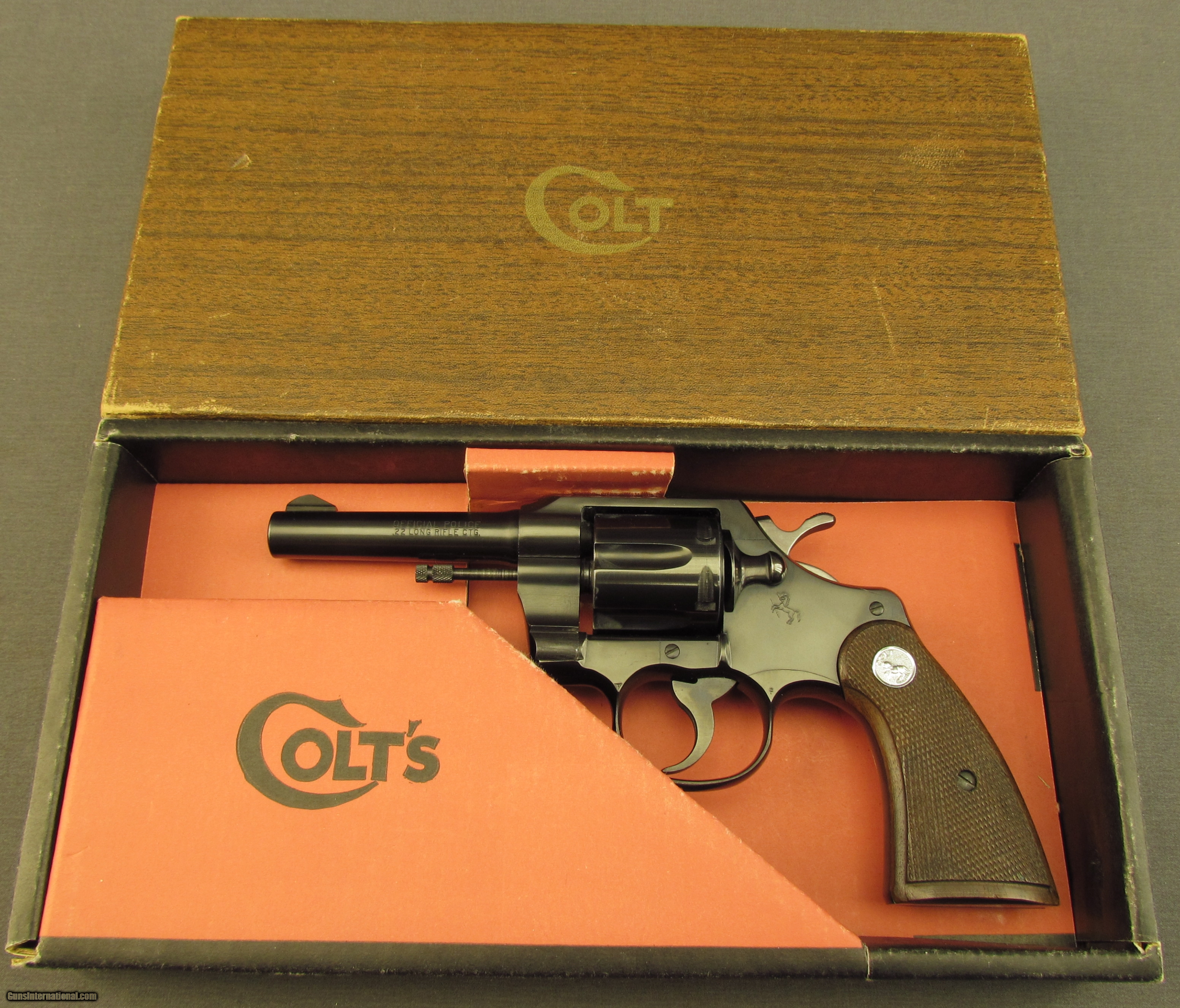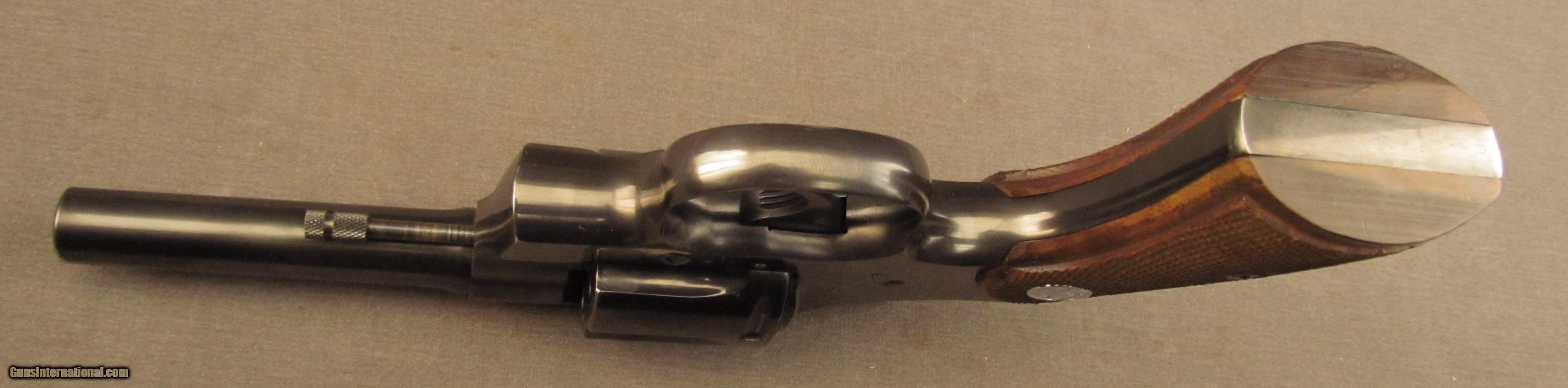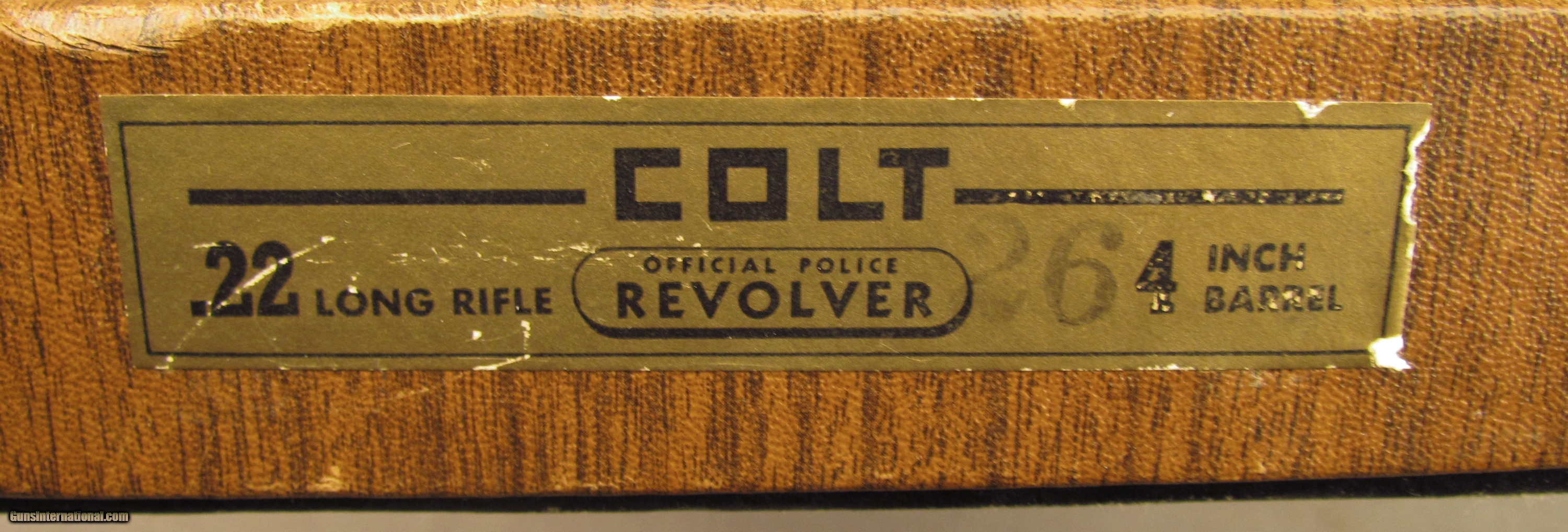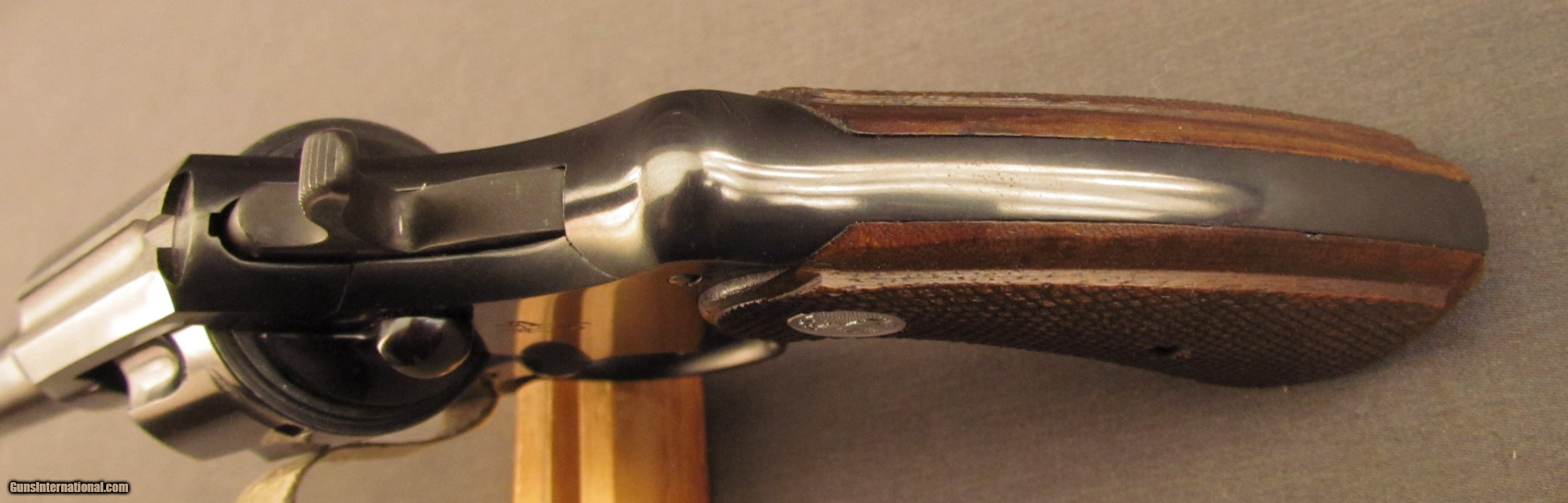 Description: Serial #46866, .22 LR, 4” barrel with an excellent, bright bore. This is a 1966 manufactured revolver that has retained 95-97% of the original blue finish with some mild silvering at the muzzle, some extremely minor freckling along the backstrap, and a very light turn-ring on the cylinder. The checkered walnut, Colt medallion grips are in excellent condition and exhibit only traces of mild flattening to the points and scattered light handling marks and small surface blemishes. The lock-up is tight, the action functions flawlessly, and the gun is housed in its original, two-piece Colt woodgrain cardboard box along with the original bore brush and an older Colt handgun shooting booklet. This is a fine-excellent example of a .22 Official Police overall. FFL or C&R SOLD Curio/Relic: Yes Manufacturer: Colt Model: Official Police Serial Number: 46866 Caliber Info: .22LR Gauge Info: .22LR |