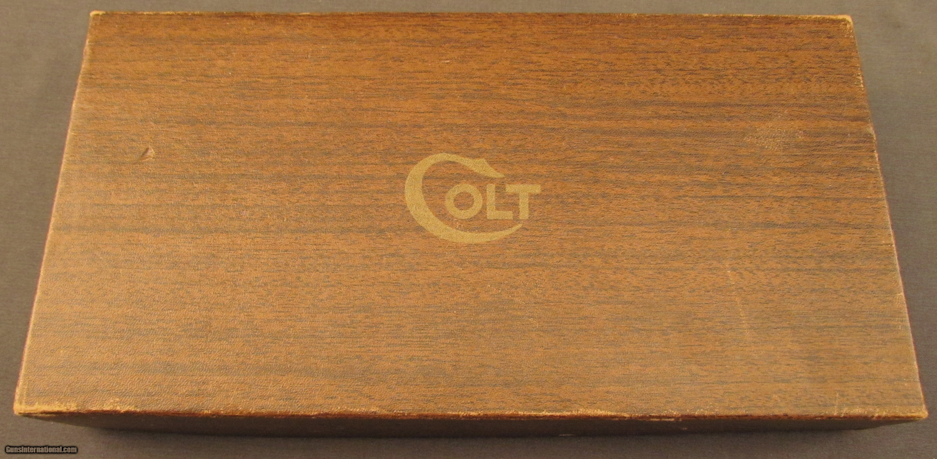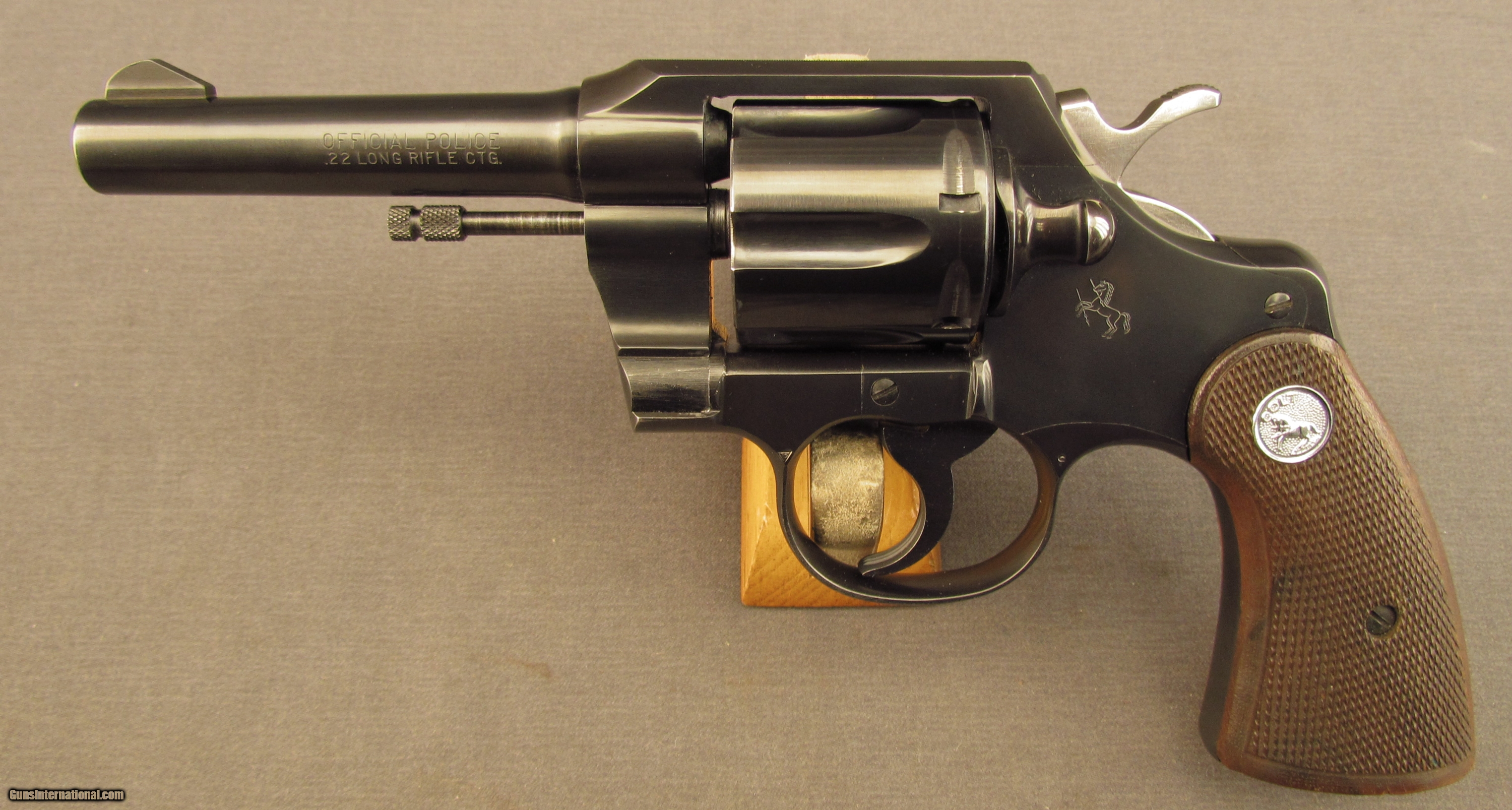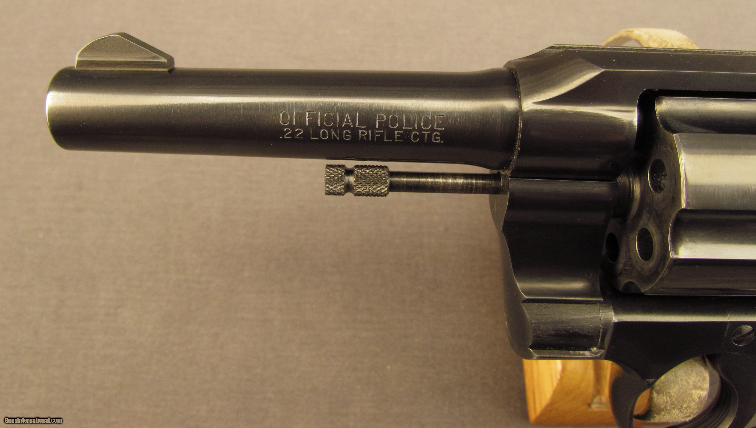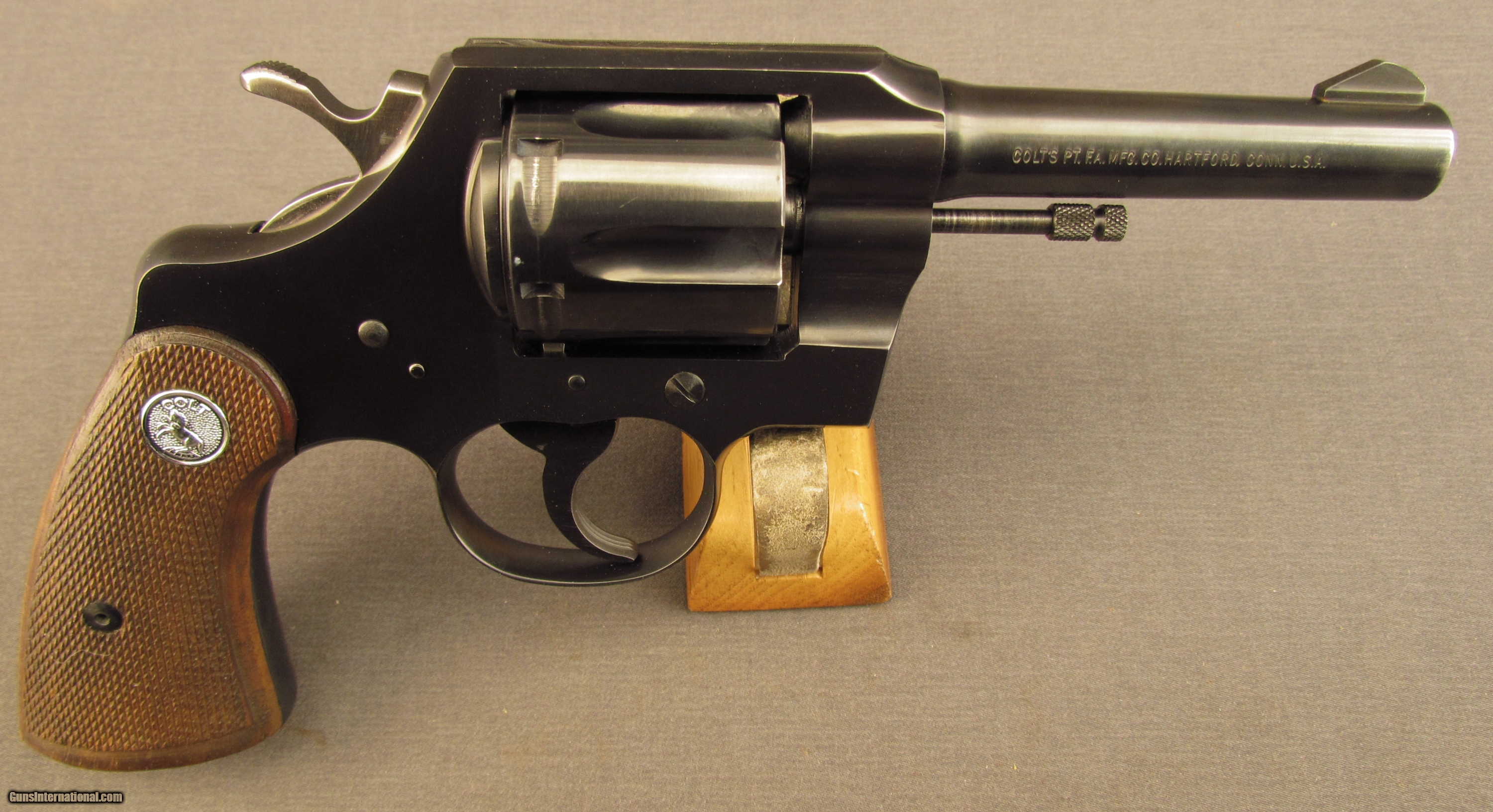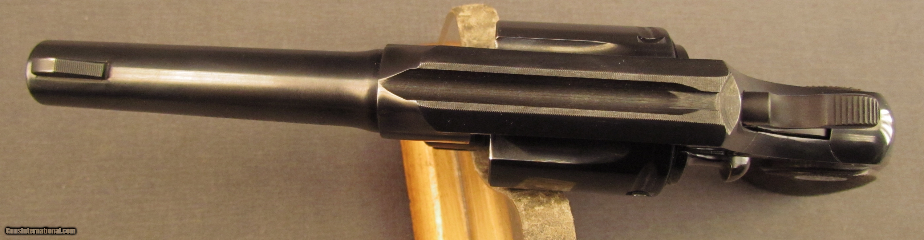 Description: Serial #46866, .22 LR, 4” barrel with an excellent, bright bore. This is a 1966 manufactured revolver that has retained 95-97% of the original blue finish with some mild silvering at the muzzle, some extremely minor freckling along the backstrap, and a very light turn-ring on the cylinder. The checkered walnut, Colt medallion grips are in excellent condition and exhibit only traces of mild flattening to the points and scattered light handling marks and small surface blemishes. The lock-up is tight, the action functions flawlessly, and the gun is housed in its original, two-piece Colt woodgrain cardboard box along with the original bore brush and an older Colt handgun shooting booklet. This is a fine-excellent example of a .22 Official Police overall. FFL or C&R SOLD Curio/Relic: Yes Manufacturer: Colt Model: Official Police Serial Number: 46866 Caliber Info: .22LR Gauge Info: .22LR |