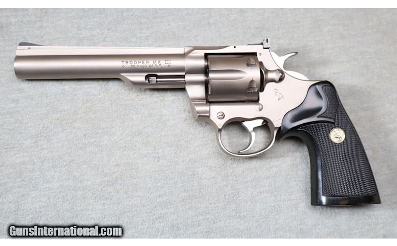 Description: The Colt Trooper is a medium frame, double-action revolver featuring a six-round cylinder. Designed as a less expensive alternative to the upscale Colt .357 and the later Colt Python and Colt King Cobra, it was marketed to law enforcement agencies as well as civilians. The MK III series debuted in 1969. The MK IIIs used a new 'J' frame and had no parts interchangeability with older models. This example comes with the original box and is still in great shape. .22 MAG Metal Condition: very good Bore Condition: bright Barrels: 6" barrel Triggers: SA/DA Weight: 3 lb 2 oz Sights: factory sights Item Location: La Vista, NE Price: $999.99 Contact Seller |