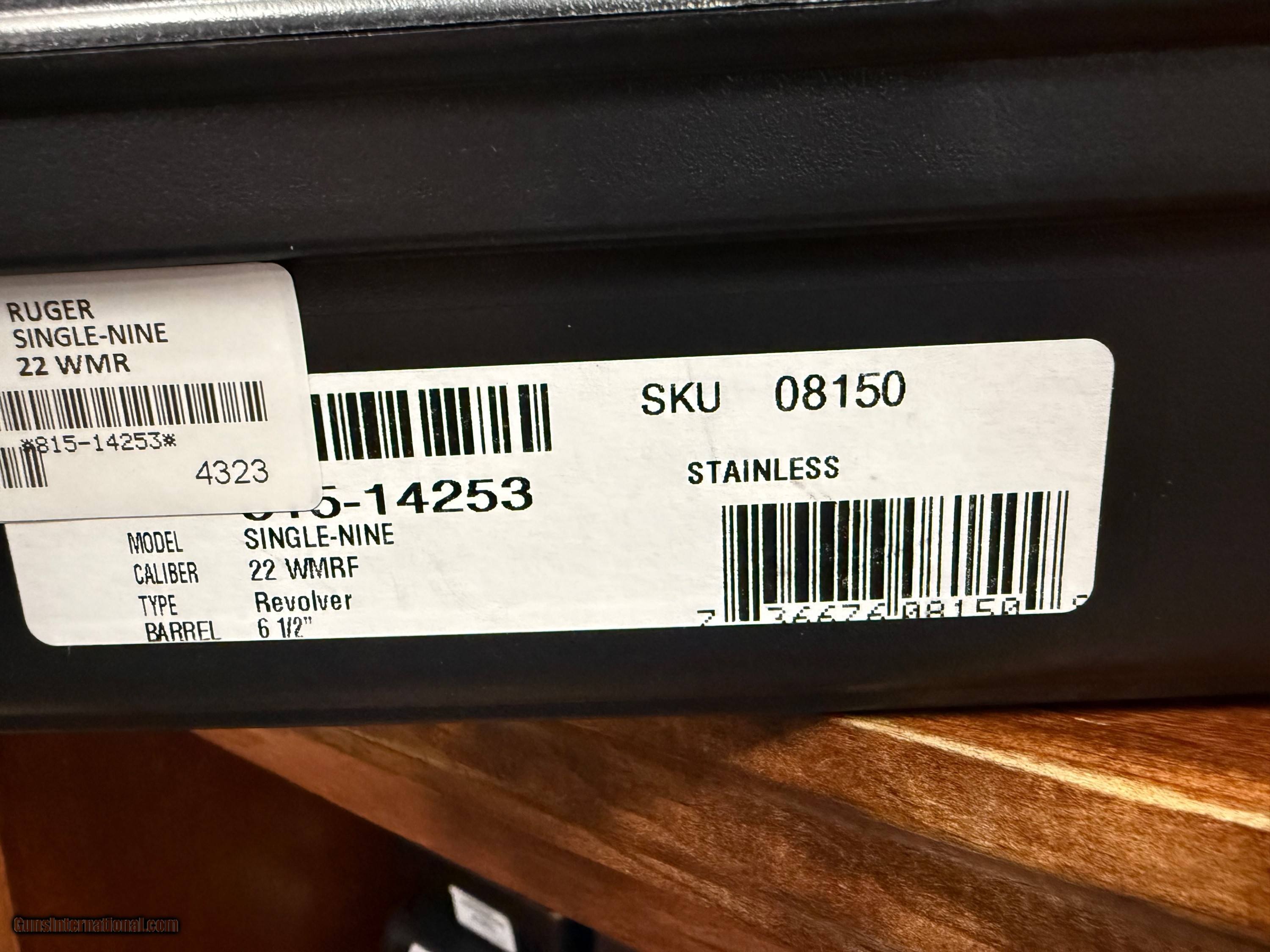 Description: Ruger Single Nine 22 WMR 7.5" barrel new in the box. Shipping is $40.00. Only FSFA aka The Gun Shop. Handgun Caliber: .22 WMR (.22 Magnum) Manufacturer: Ruger Model: Single Nine Barrel Length: 6.5” Condition: New Price: $650.00 Shipping: $40.00 Contact Seller |