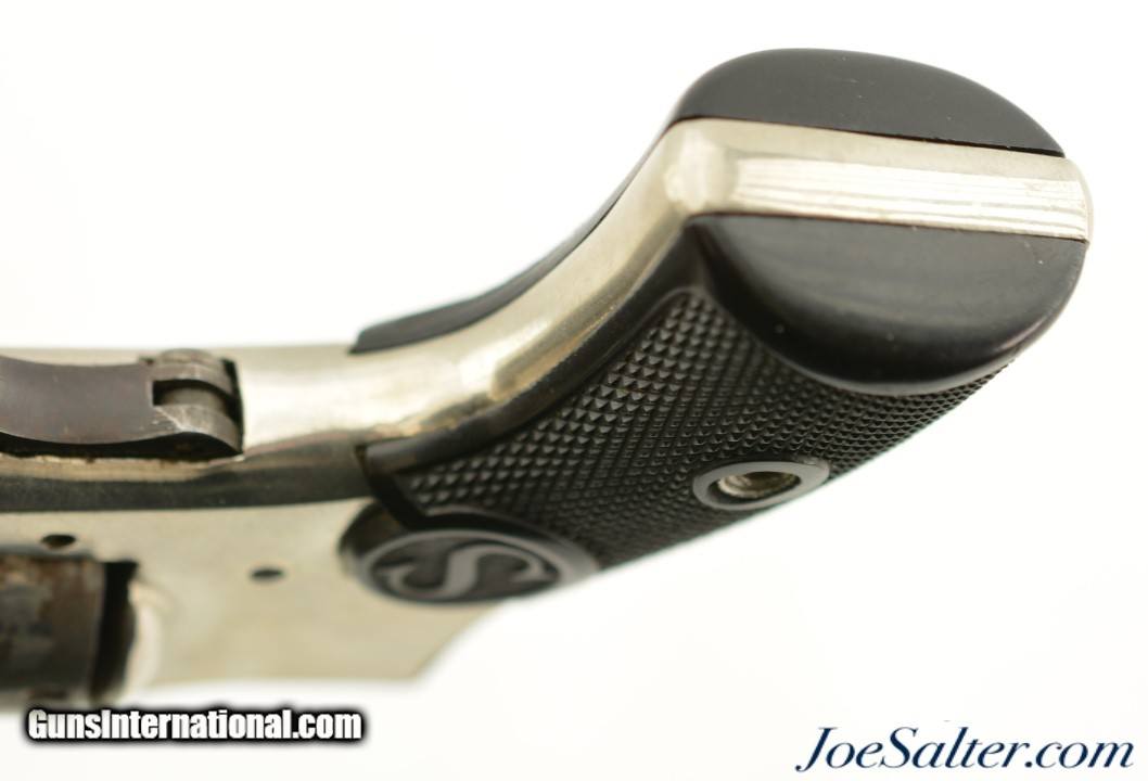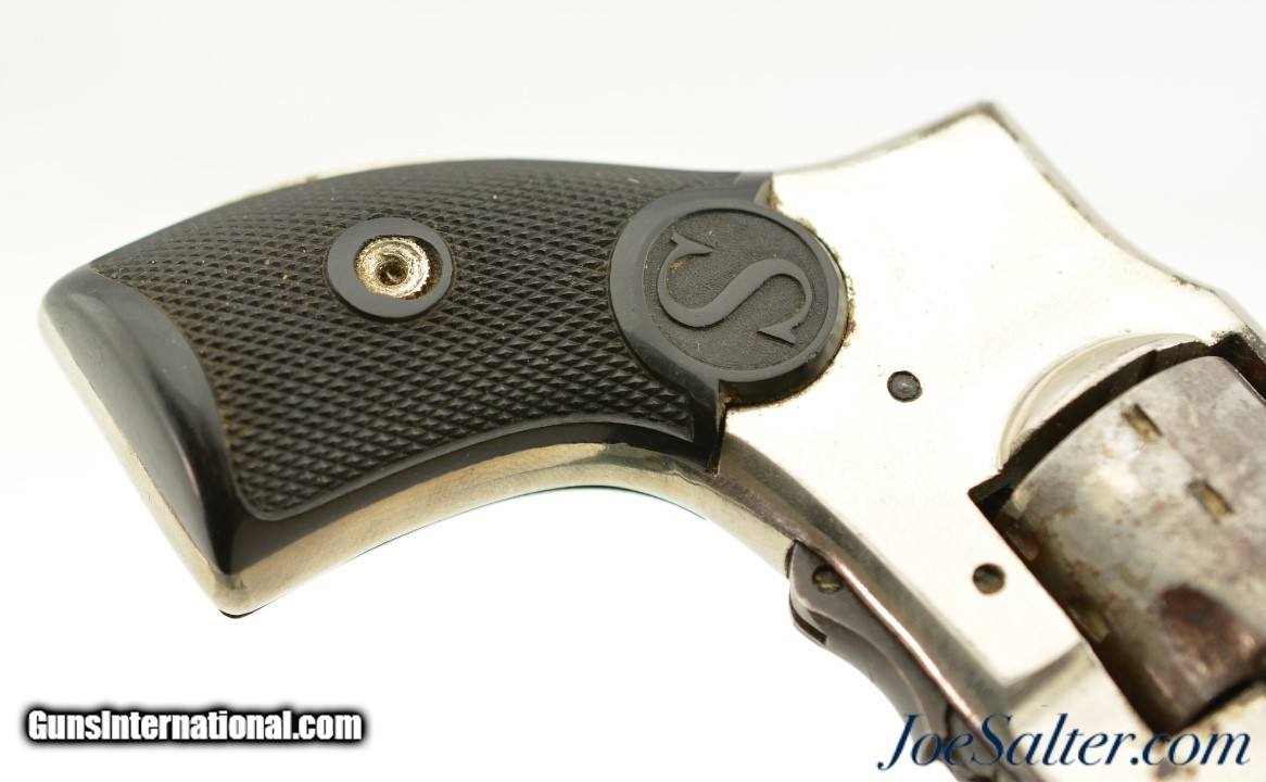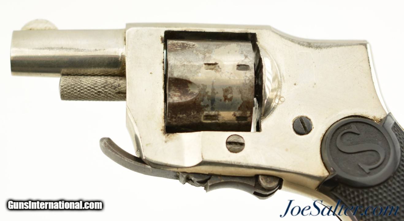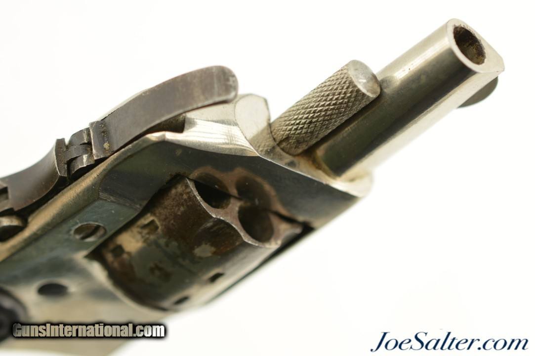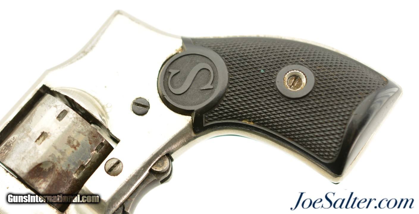 Description: Serial #735, .22 Short, 1 3/8 inch barrel with a good bore with light roughness. This is the Model 1922 "Baby Hammerless" revolver with the transitional pull release mechanism for the cylinder manufactured by R.F. Sedgley Inc. in Philadelphia. In near excellent condition the frame shows virtually all, 96-98% of the original bright nickel finish with the cylinder having perhaps 20-25% with the balance flaked to gray-brown. The original hard rubber "S" logo grips rate about excellent. Mechanically it functions properly with the trigger folding out of the way and holding correctly in the locked position. A near excellent / very fine example of these neat little pocket revolvers. FFL or C&R Curio/Relic: Yes Price: $495.00 Contact Seller |