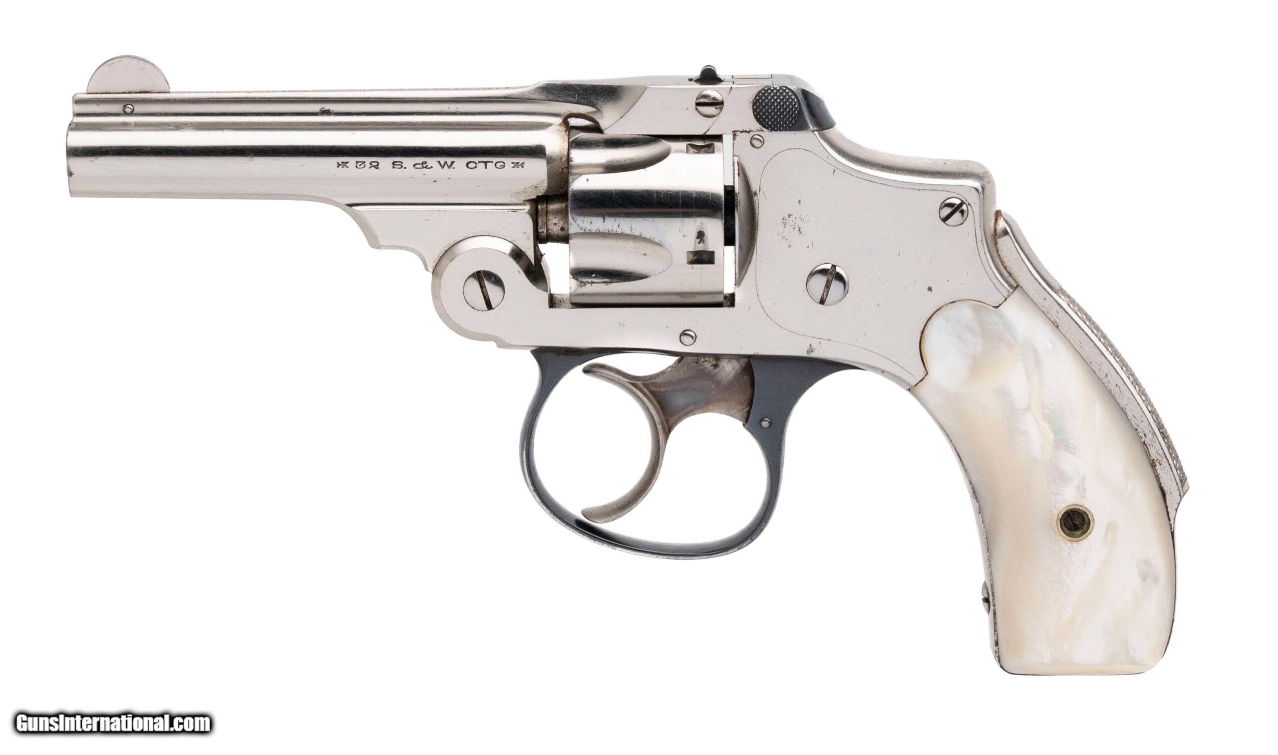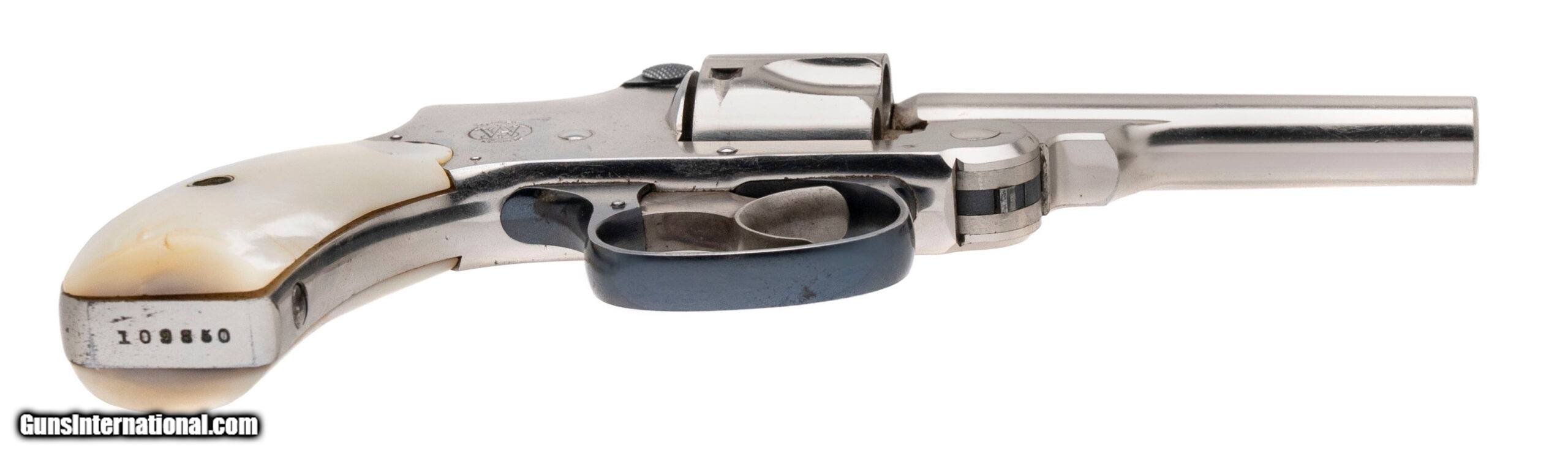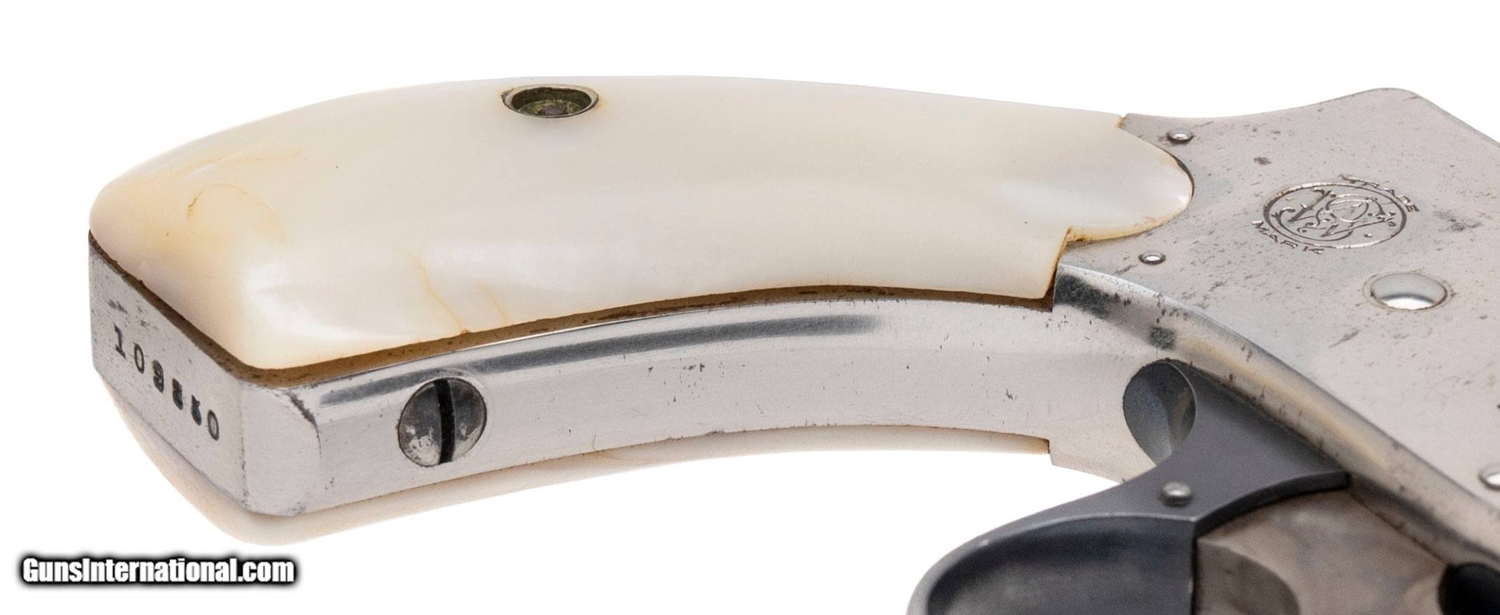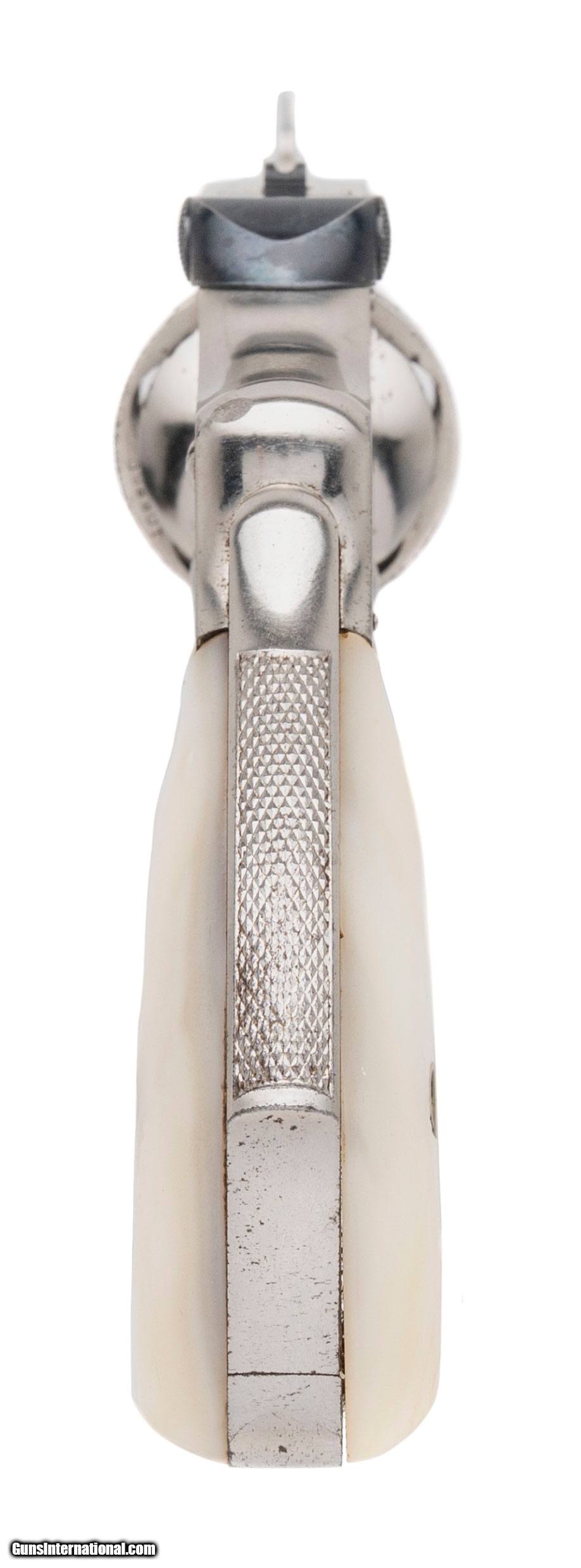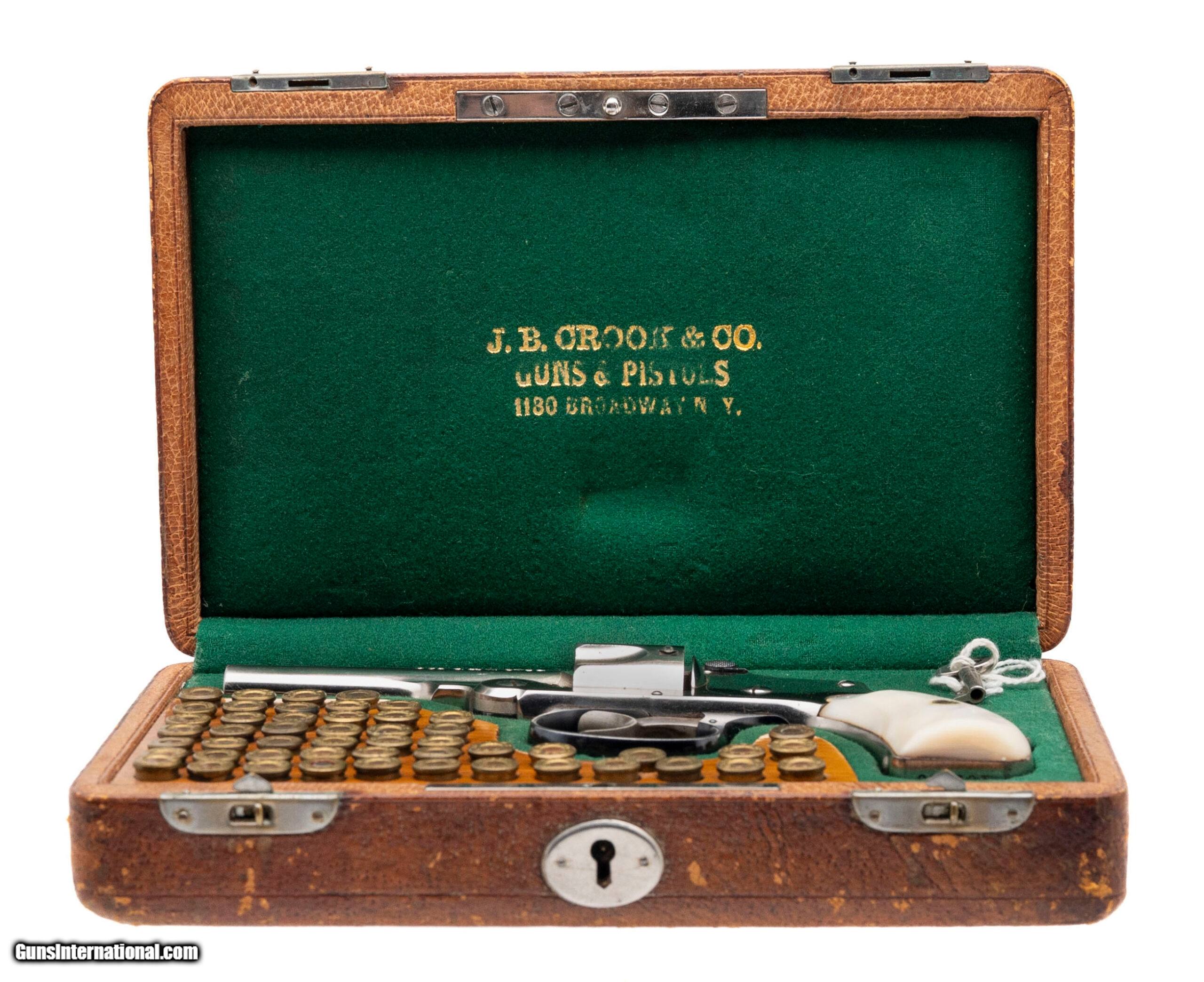 Description: "Serial number 109850. Made circa 1902-1909. 32 S&W caliber with a 3" barrel. This is a 2nd Model 32 New Departure. It is in excellent condition with 95% of the original nickel finish. The grips are very good sharp two piece pearls. This gun comes in a dealer case marked “J.B. CROOKS & CO/ GUNS & PISTOLS/ 1130 Broadway N. Y." J. B. Crooks and company sold guns, but fishing reels and rods was their main business. Very fine all original gun! Curio/Relic: Yes Price: $1,995.00 Contact Seller |