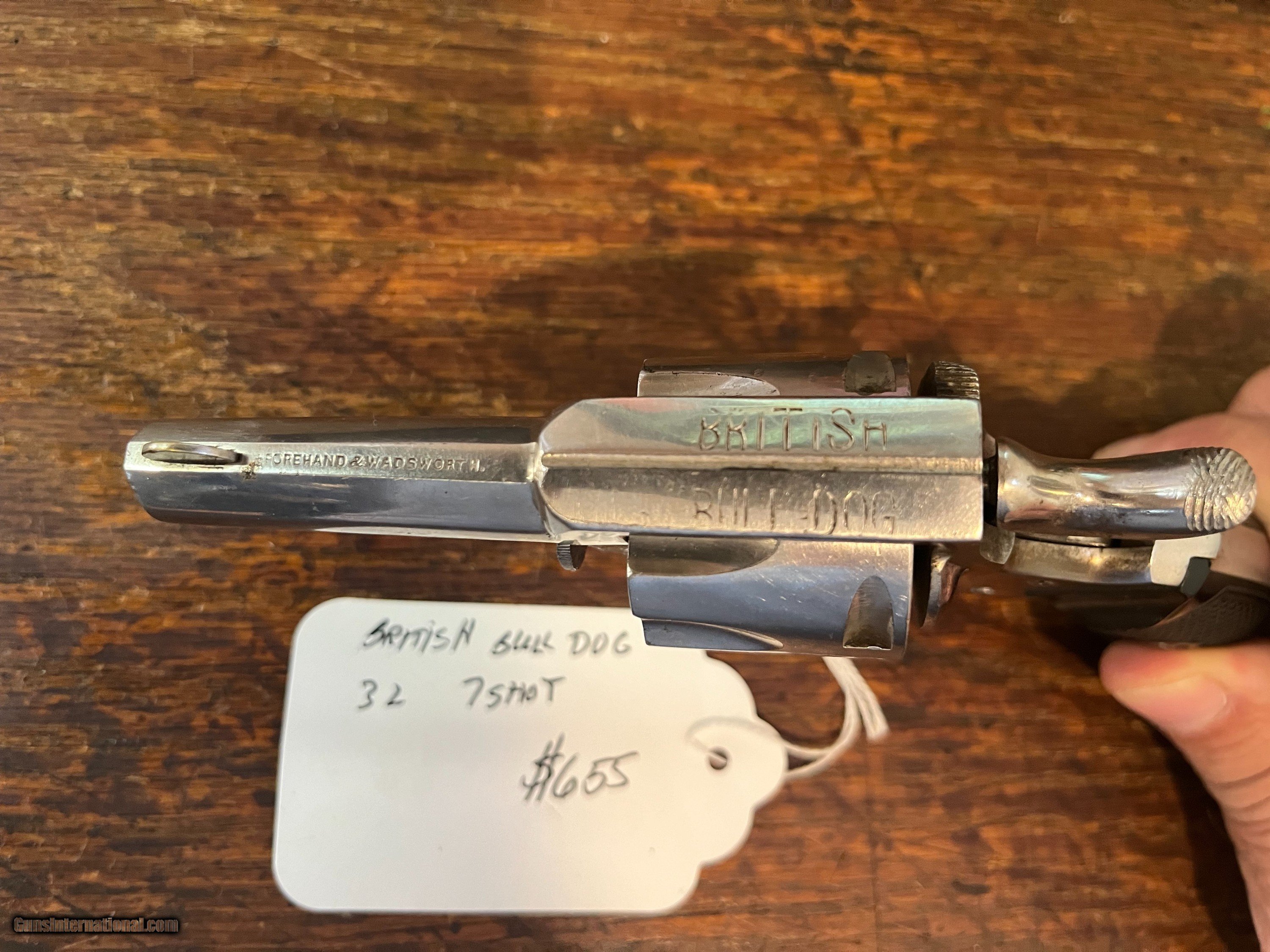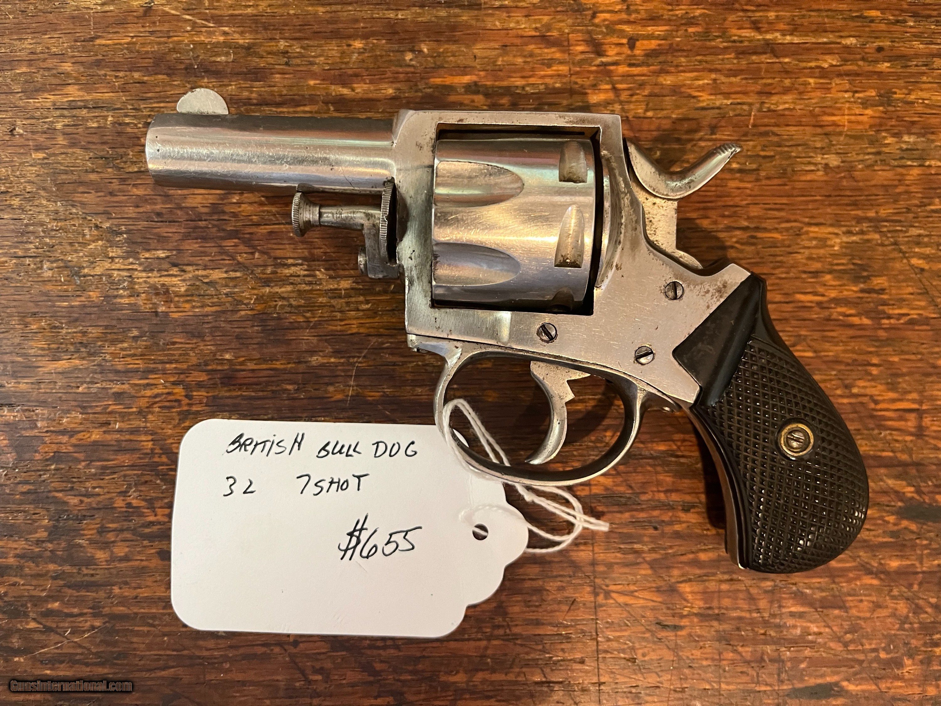 Description: Seven shot 32 caliber double action Bull Dog type revolver. Excellent mechanics,bore, nickel and grips. 2 1/2" barrel. Antique no FFL. Offers considered. SOLD Antique: Yes Handgun Caliber: .32 S&W |
