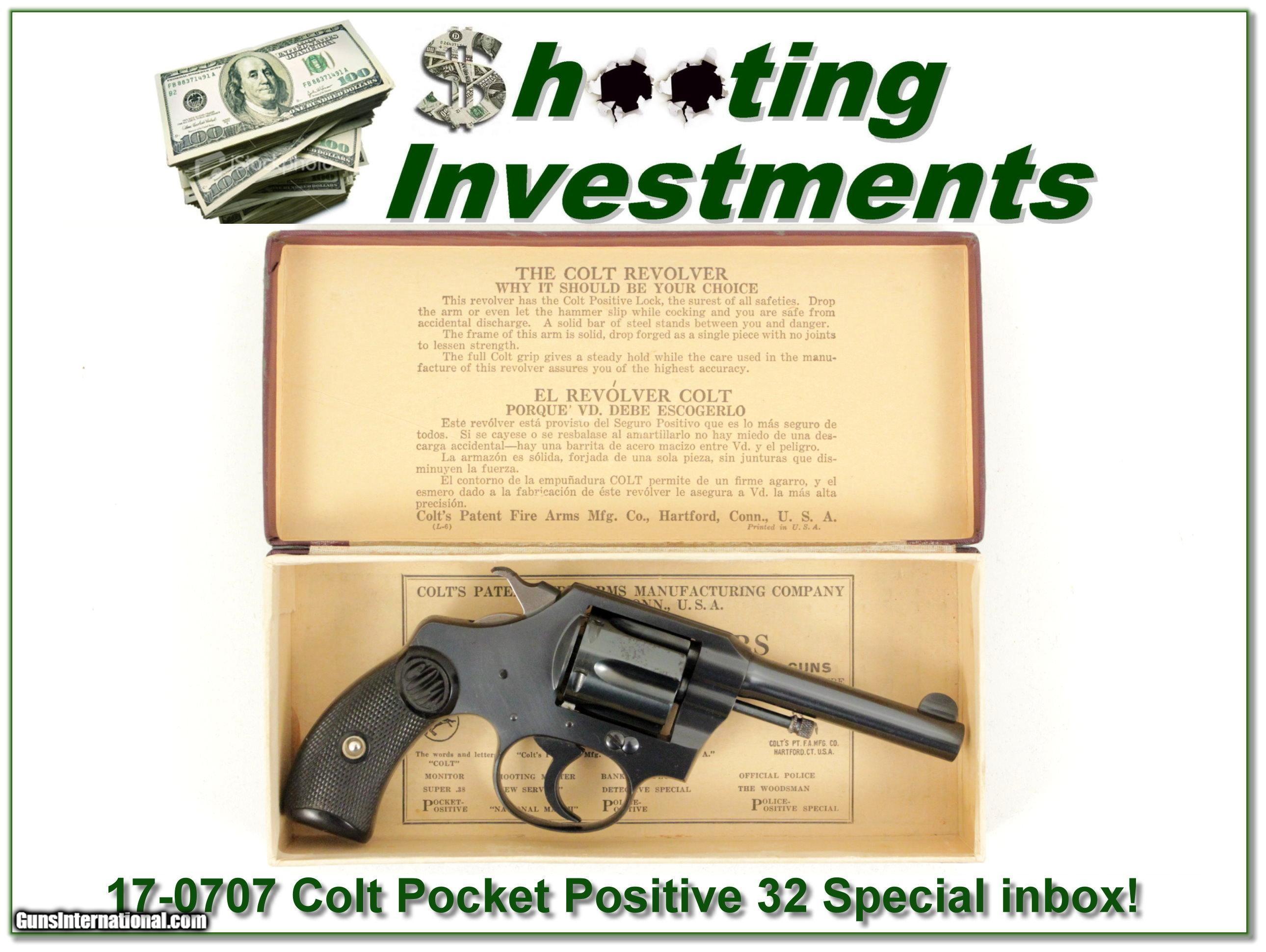 Description: Collectors, this is an excellent example of the Colt Pocket Positive 32. It is in excellent collector condition and comes in original box! I am selling this one on consignment and as such, lay-a-way can’t be used. It does of course have the standard 3-day inspection. Shipping and insurance is $35. Please email me with any questions or larger pictures. (Consign your quality firearms with Shooting Investments for only 10%! Let me know if you have any you would like to sell!) 17-0707 Payment: Payment is by Money Order, Cashiers Check or Personal Check. I can now also accept MasterCard and Visa with a 3% convenience fee. PayPal can be used for some items but never firearms. Please let us know if you would like to pay via PayPal. Shipping: The shipping charge will be listed in each description. It is $35 for most guns. Some heavy guns or those insured for over $2000 will be higher. Shipments to Alaska and Hawaii are higher because air shipment is required. Most firearms are shipped within 5 days of receipt of payment. We prefer shipping at the beginning of the week to avoid firearms in transit over weekends. We package all shipments carefully and insure them for the full purchase price, rounded up to the next $100. In the unlikely event that damage occurs, it is important that you save all packaging material for the claims process. Optics are shipped Priority Mail and most other non-firearm shipments are shipped First Class. Returns: Our return policy is simple. If for any reason you are not pleased with your purchase, you may return your item for a refund. The only exception is ammunition, it cannot be returned. It is important to us that you are happy. Guns cannot be fired or dissembled before returning them and must be returned in the same condition as received. Notification of a return must occur with-in 3 days of receipt at your dealer. Shipping, convenience and dealer fees are not refundable and are the responsibility of the buyer. Lay-a-way: If needed, we offer a 60 day lay-a-way option on most firearms. It is 1/3 now, 1/3 in 30 days and 1/3 in 60 days. Lay-a-way firearm sales are final. Consigning your firearms with Shooting Investments: We will help you get top dollar for your firearms. While most local guns shops charge 20% or more, our fee is only 10% with a minimum of $50. At your local gun shop it might take months to sell. Selling on-line provides instant access to thousands of interested buyers. You won’t find any other on-line dealer willing to sell your firearms for only 10% or listing every gun on 4 separate s. Selling through an House typically costs the seller 15% and the buyer an addition 15% (so 30%) and you have to wait several months to sell and longer to receive funds. If properly priced, we will sell your firearms in a week or two. Send us an email or give us a call and we’ll explain how easy it is for you to get top dollar. Trading: We collect guns and usually just trade for guns we want to add to our collections. We often sell guns for others wanting to purchase one of ours. We find this the most fair to both of us. Our Commission is only 10% and we hold the gun you want until yours sells. Please contact us if you want to sell one of yours to buy one of ours. Help for California Buyers: We are happy to ship to California. It is the buyer’s responsibility to make sure any item you buy is legal in your state. We are also happy to help with your purchase of a firearm from someone other than us. If you see a gun you would like to buy but the seller can’t or won’t ship to California we can help. You buy the gun and have it shipped to us. We’ll then ship it to your California dealer. The cost for this service is only $30 + shipping. Let me know if we can help! SOLD |