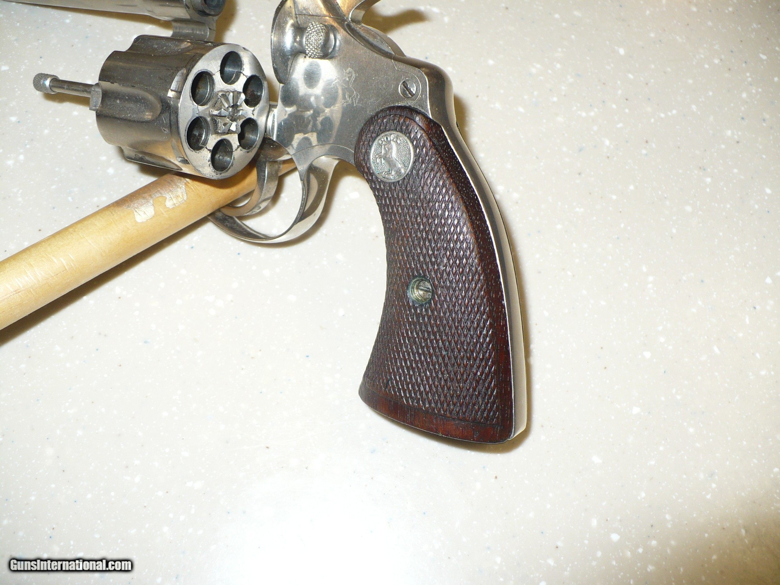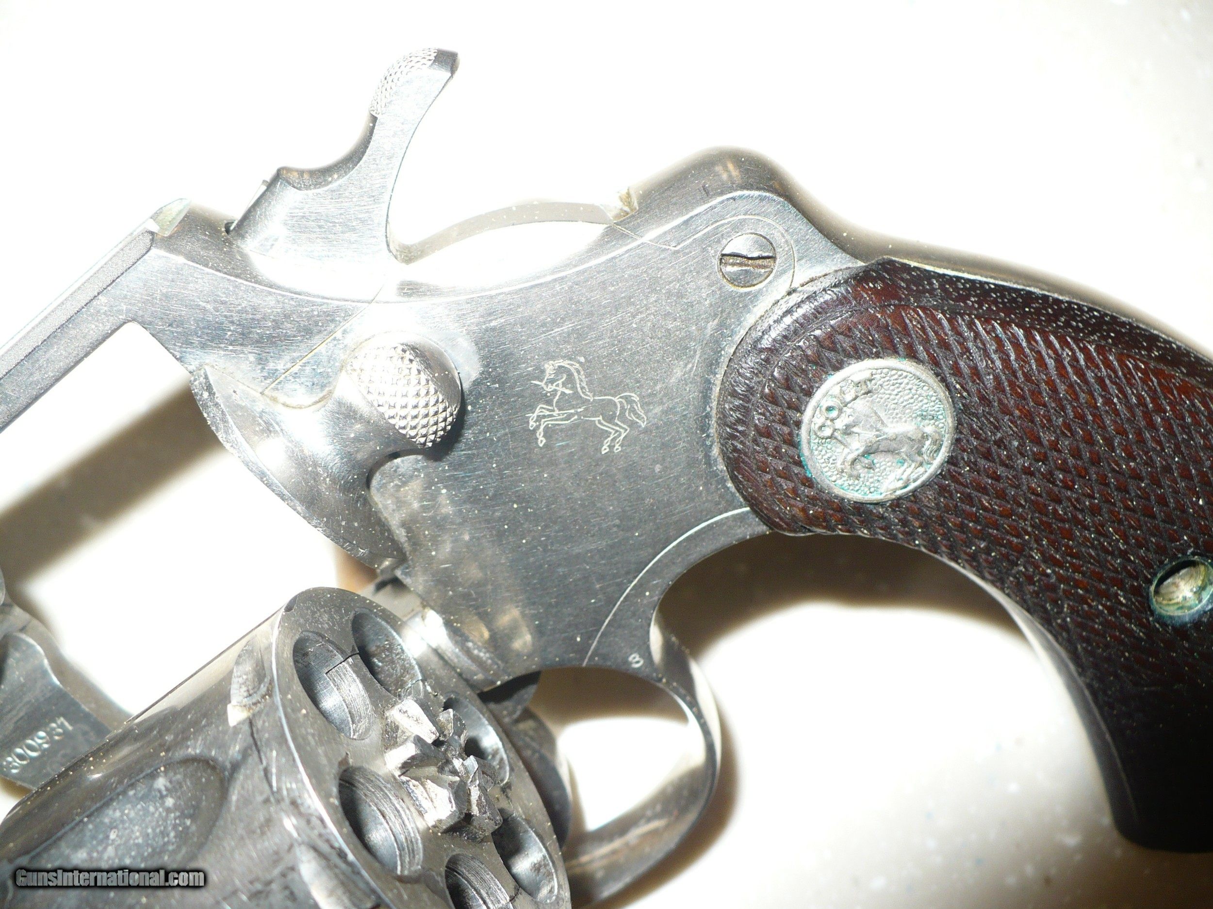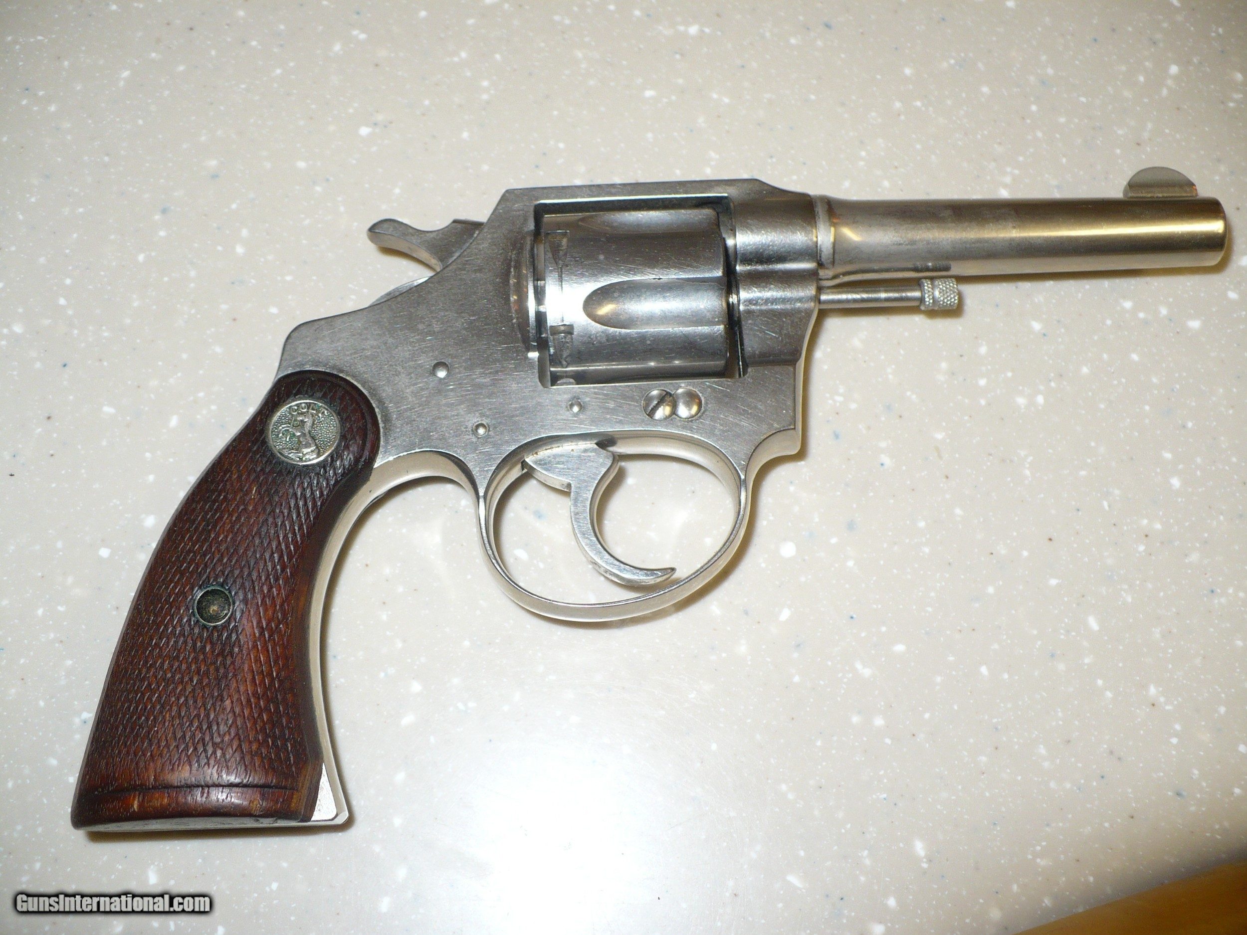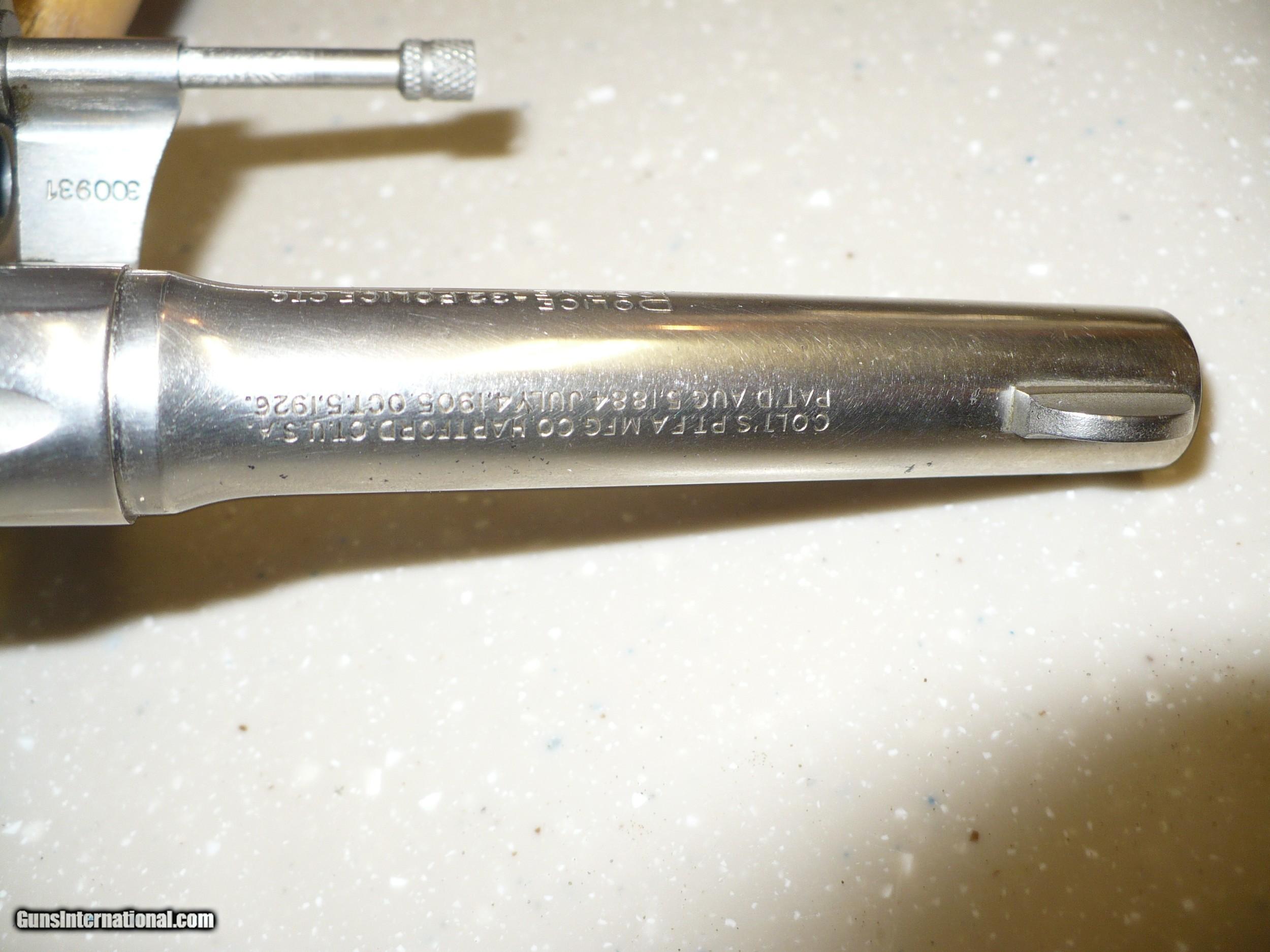 Description: 1929 was the starting year of production for a series of second issue Police Positives. Colt started the new series with serial number 300001 to produce a .32 police positive on the larger frame of a .38 police positive revolver. Presented for sale is a very desirable 4 inch nickel plated .32 on a .38 frame with serial number 300931 making it number 931 in this production run from 1929. The revolver is in excellent condition with the exception of the toe of the right grip. Replacement grips are readably available. The nickel is in above average condition, bright and shiny. There is a light drag line on the cylinder. All markings are crisp. Over all a very nice and desirable second issue nickel .32 Police Positive Revolver. I offer a three-day non-firing inspection period and always want the buyer to be satisfied with their purchase. The gun will be packed correctly and shipped via FedEx with insurance to your FFL dealer in the continental United States for $55. This gun requires a FFL license for transfer. I ship the following day after the payment arrives and provide tracking information. Price is $455 plus $55 shipping. Payment: Personal check, usps money order, certified check. SOLD Manufacturer: Colt Model: Police Positive Serial Number: 300931 Barrel Length: 4 Bore: .32 Condition: Very good Metal Condition: very good Wood Condition: average Bore Condition: very good Finish: nickel Sights: fixed Manufacture Date: 1929 Item Location: Farmington, NM |