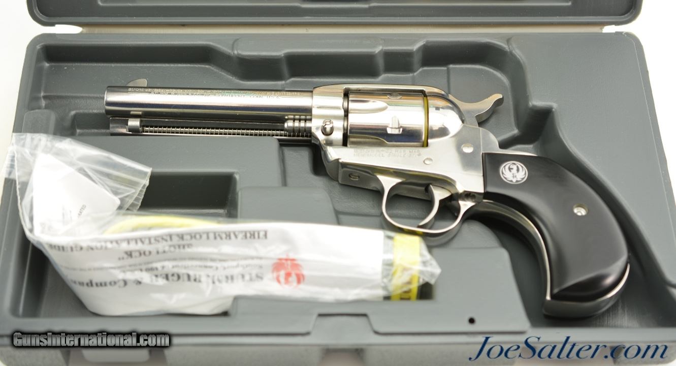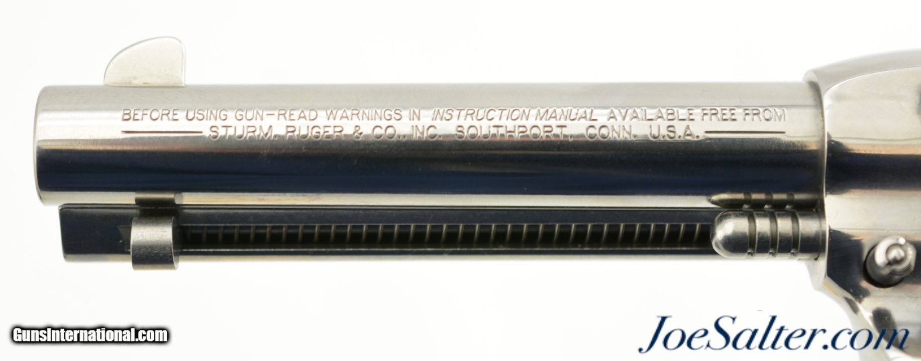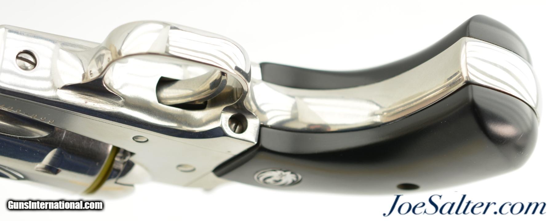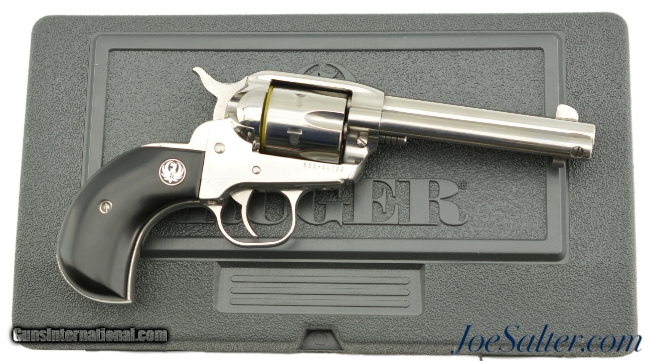 Description: Serial #650-50724, .32 H&R Magnum, 4 5/8 inch barrel with a bright, excellent bore manufactured in 2002. Catalog No. KSSMBH-4F. This is the New Model Single Six 32 H&R Mag revolver featuring a bright stainless finish, bird's head grip with black Micarta grips. In excellent, like new condition, the single action shows only a hint of handling marks with virtually all, 99% plus, of the original bright stainless finish with a very light drag line on the cylinder. The grips are likewise excellent. It comes in the original hard plastic Ruger case numbered to the gun with manual, lock, paperwork, plastic bag and factory fired casing. These saw limited production and favored use among the Cowboy Action shooters and are not often found in excellent virtually new condition. FFL SOLD |