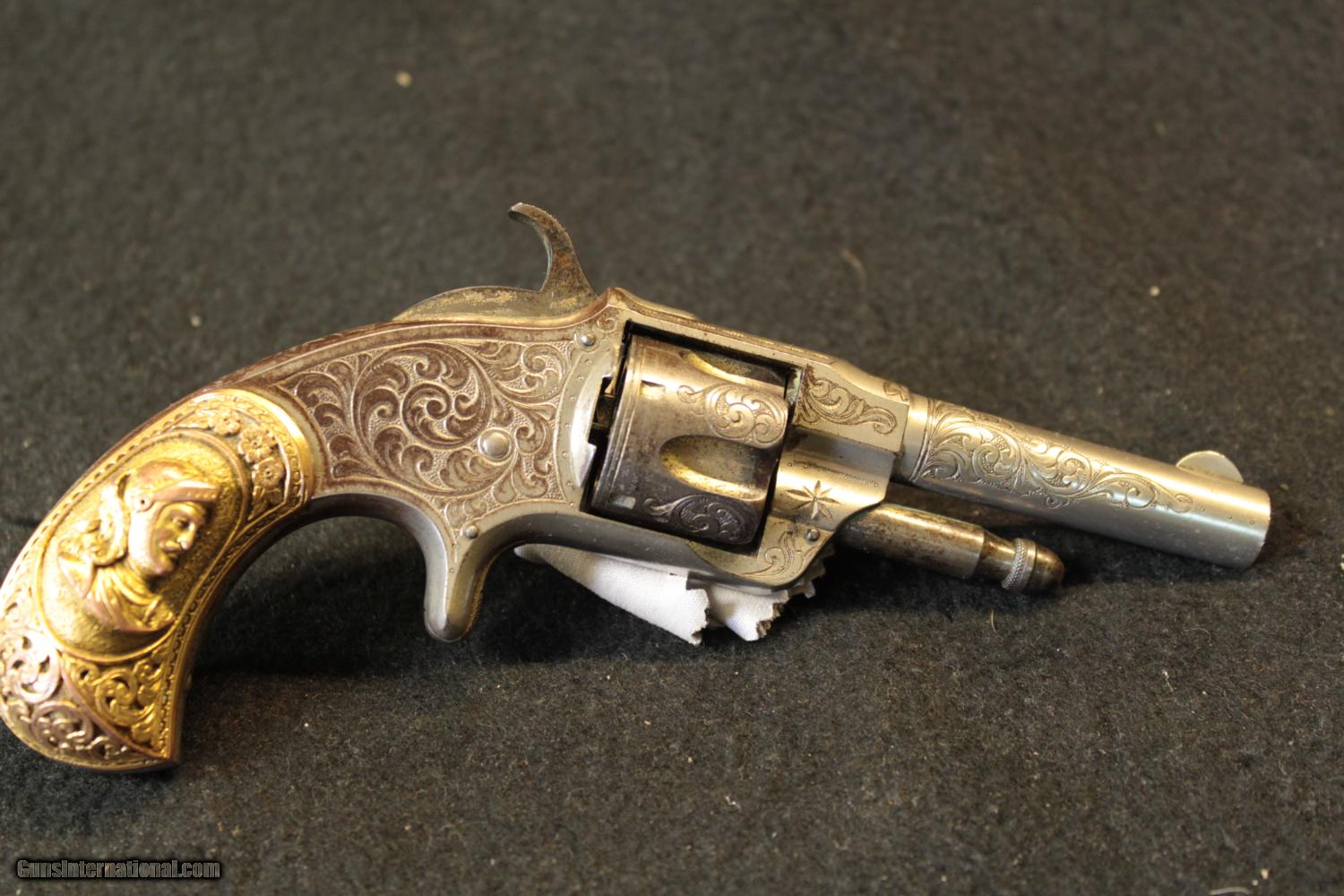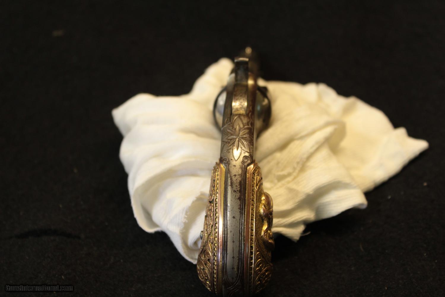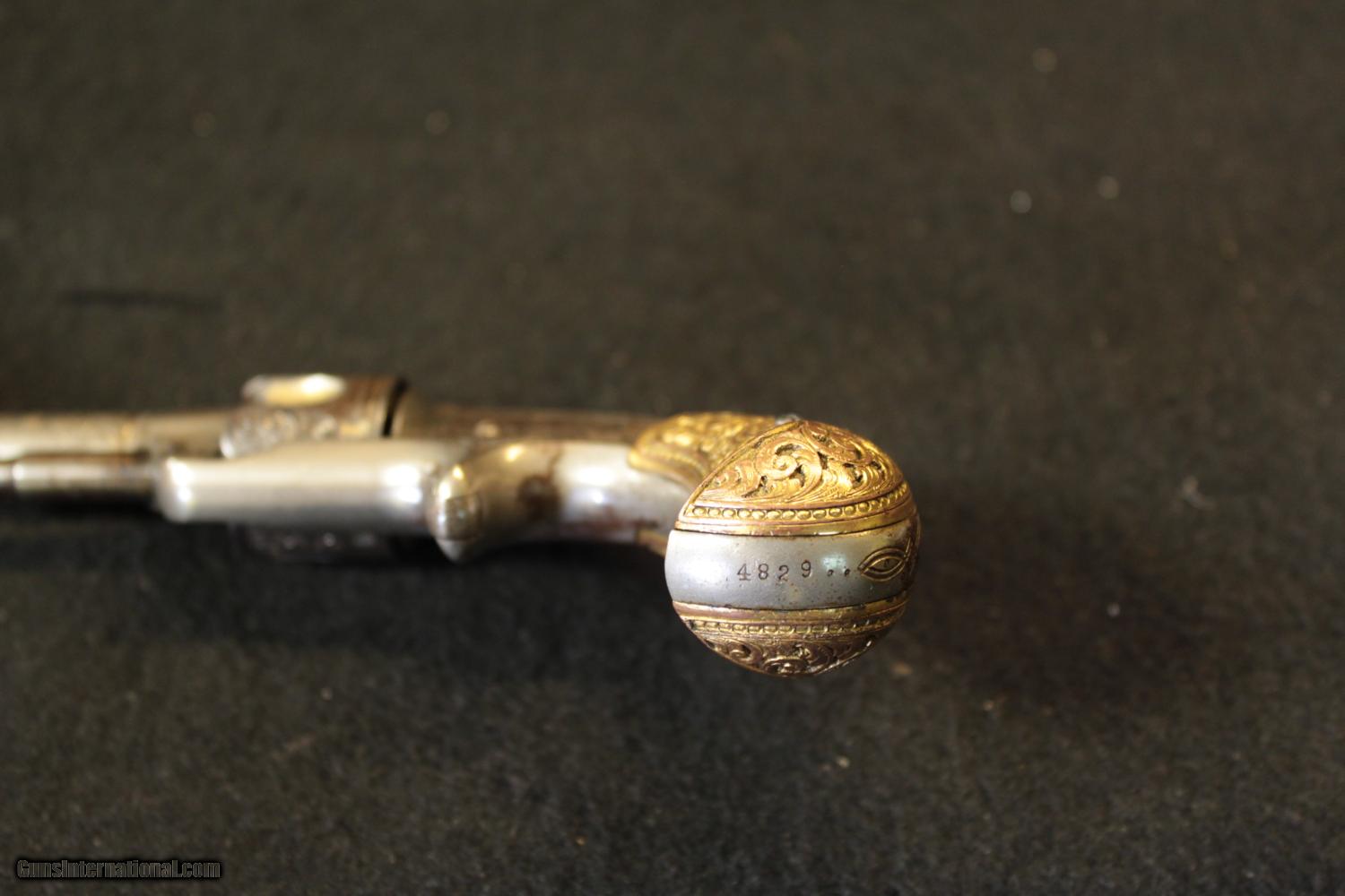 Description: Otis Smith April 11, 1873 Patent .32 cal. revolver. Factory New York engraved with gold washed hammer, presentation grips, and cylinder. Grips have rose scroll with an image of a Conquistador on the right side. The engraving is consistent with work from the shop of L.D. Nimschke but I haven’t found any initials to date. Nickle has been replaced by patina on the main frame in places and gold traces remain in the cylinder flutes and engraving. This was clearly done as an exhibition or presentation piece SOLD |