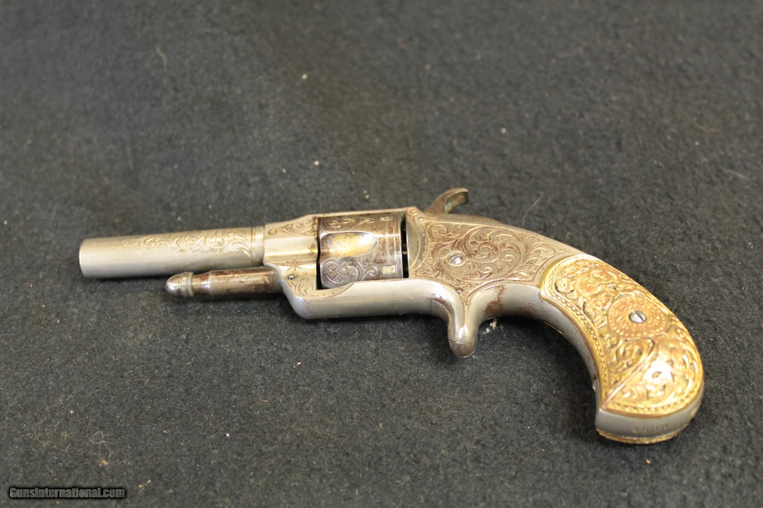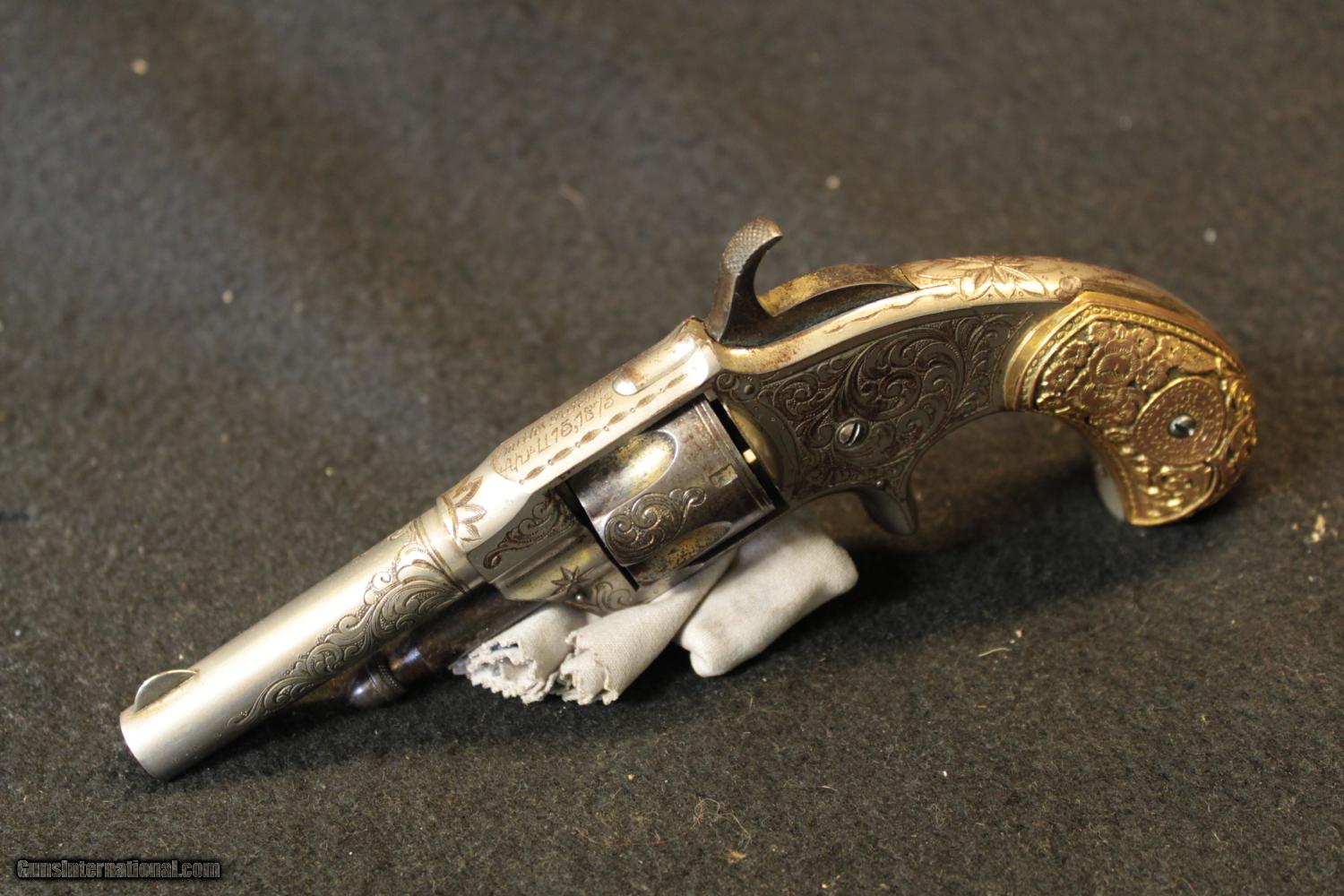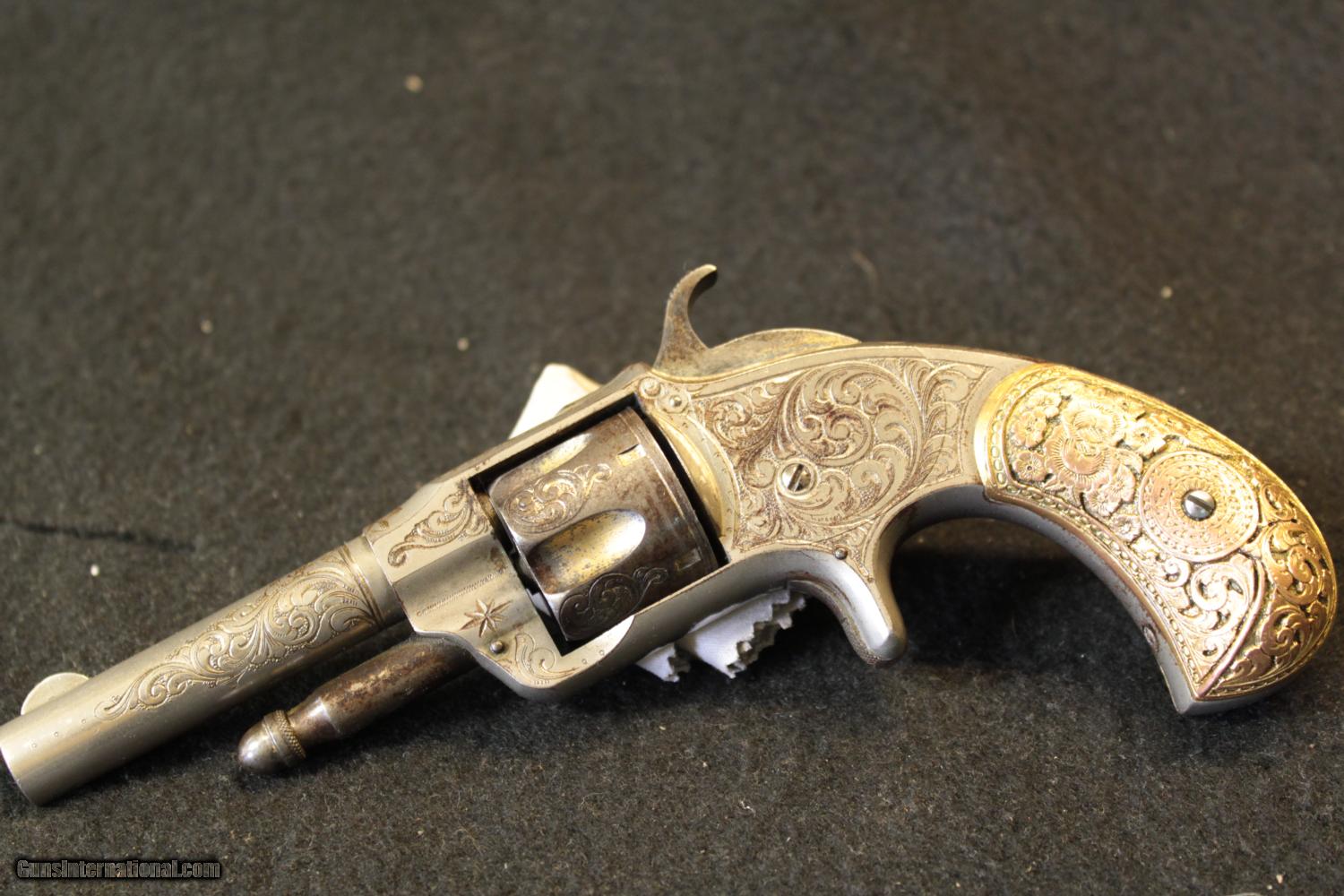 Description: Otis Smith April 11, 1873 Patent .32 cal. revolver. Factory New York engraved with gold washed hammer, presentation grips, and cylinder. Grips have rose scroll with an image of a Conquistador on the right side. The engraving is consistent with work from the shop of L.D. Nimschke but I haven’t found any initials to date. Nickle has been replaced by patina on the main frame in places and gold traces remain in the cylinder flutes and engraving. This was clearly done as an exhibition or presentation piece SOLD |