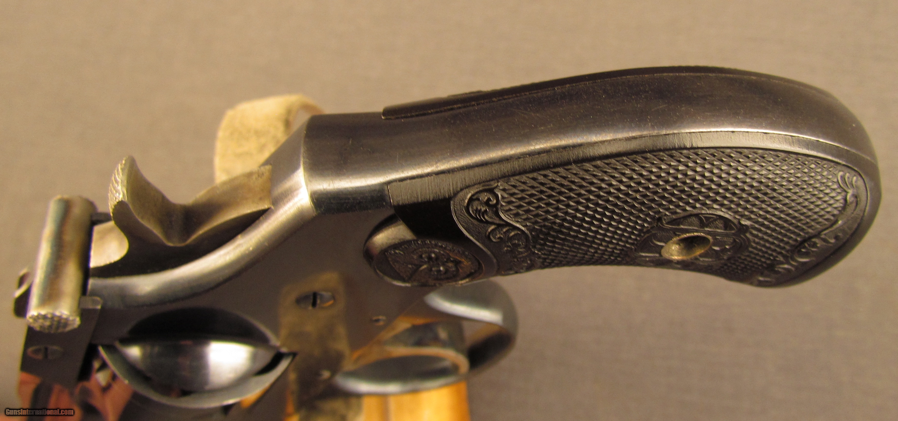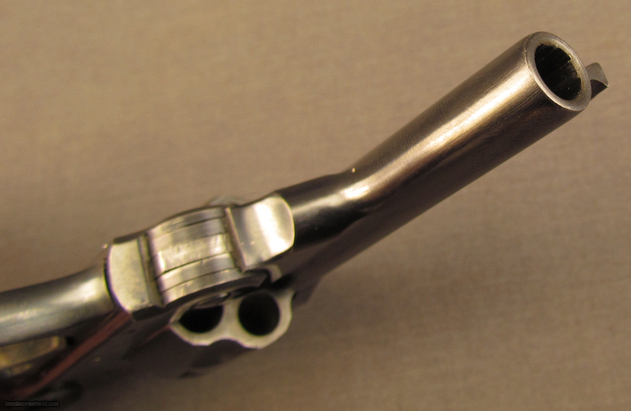 Description: Serial #80491, .32 S&W, 3” barrel with an excellent, bright bore. This is a handsome little revolver that retains 97-98% of the original blue finish with only some very mild silvering at the muzzle and a few of the high edges. Additionally, there is a light turn-ring on the cylinder, and the hammer and trigger have some original color case-hardening remaining. The checkered hard rubber grips are likewise in excellent condition with only traces of wear and very little flattening of the points. The lock-up is solid and the mechanism functions This is a very nice little Iver Johnson in the rarer blued finish, and rates fine condition overall. FFL or C&R SOLD Curio/Relic: Yes Manufacturer: Iver Johnson Model: Top Break Serial Number: 80491 Caliber Info: .32 S&W Gauge Info: .32 S&W |
