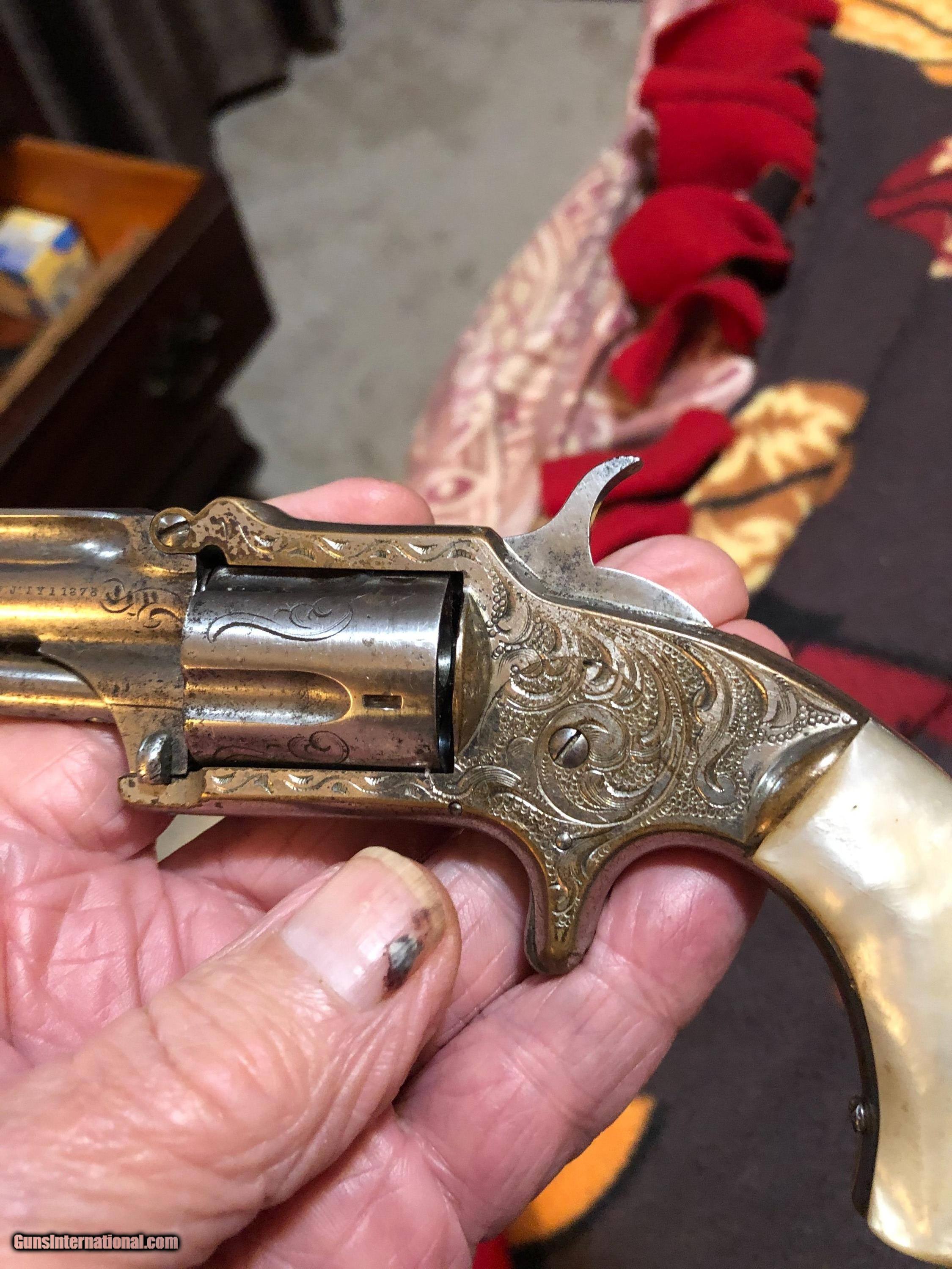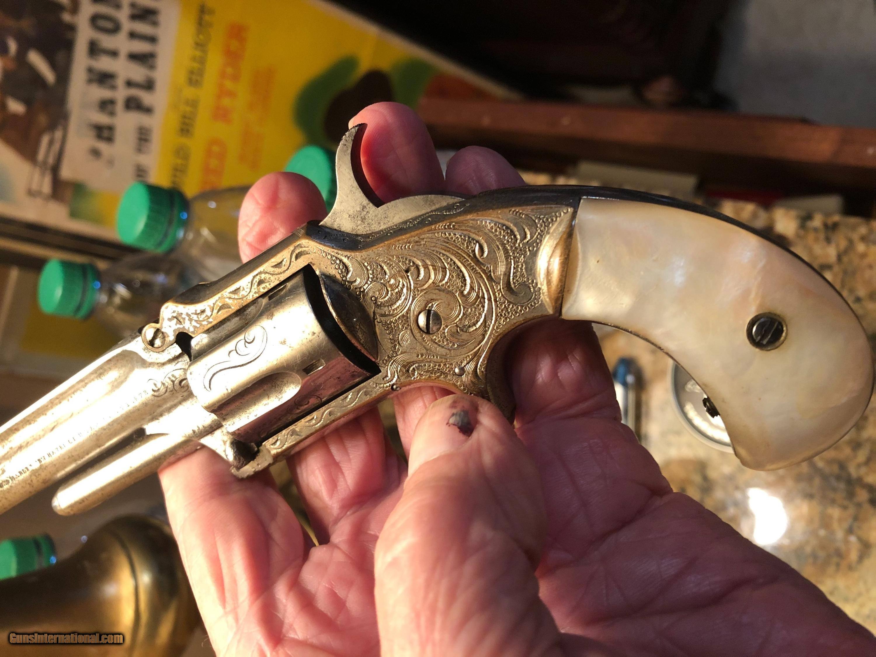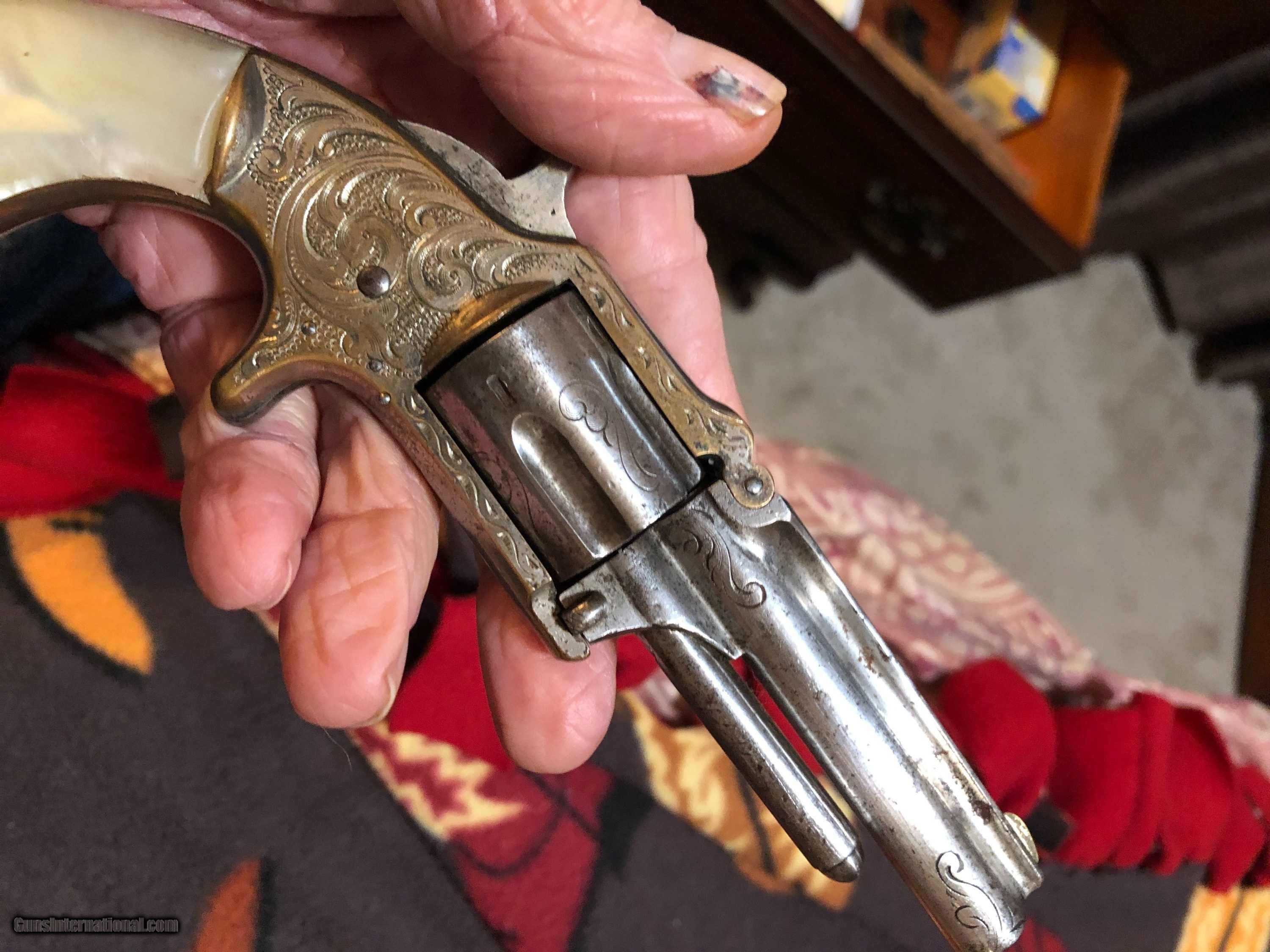 Description: This is a beautiful engraved bottom break revolver comes in 32 cal it has beautiful pearl pistol grips original with no breaks or chips I can see very little wears on engraving with exception of barrel must have been holstered it is very tight and handles as it should bi beleuve it is priced too cheap but am selling for an individual that does not collect guns beleuve it was left to him in a home he inherited and he found it in drawer I Wesson watching tales of Wells Fargo the other night when a lady pulled one out of her purse just like it SOLD Curio/Relic: Yes Antique: Yes Handgun Caliber: .32 S&W Manufacturer: Marlin Model: 1875 Serial Number: 982 Barrel Length: 3 inches Chambers: 5 I think Condition: Very good Metal Condition: Excellent Bore Condition: Good a little rust Action: Maybe single and double Triggers: One Stock: Pearl handle Manufacture Date: 1875 Engraving: All over Item Location: Lagrange ga |
