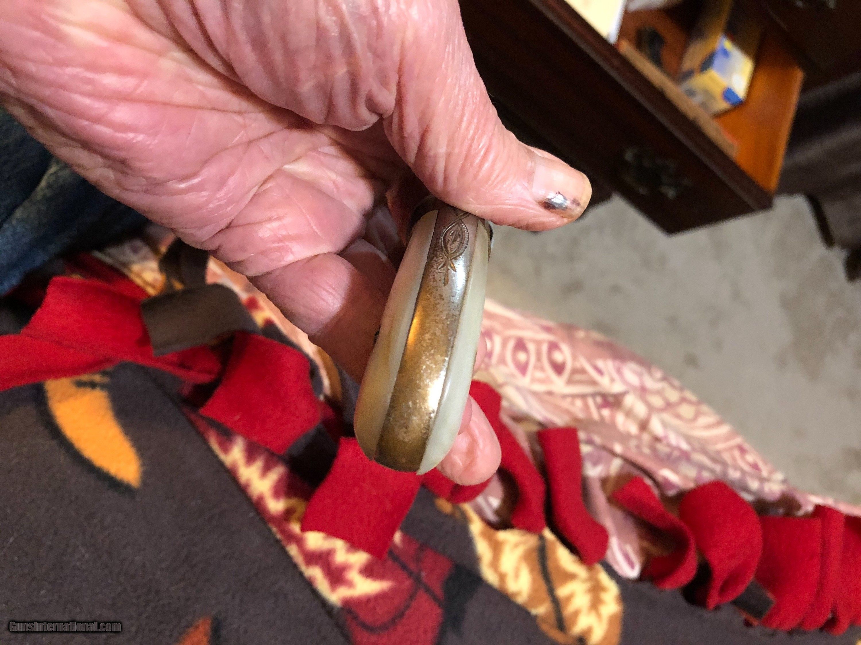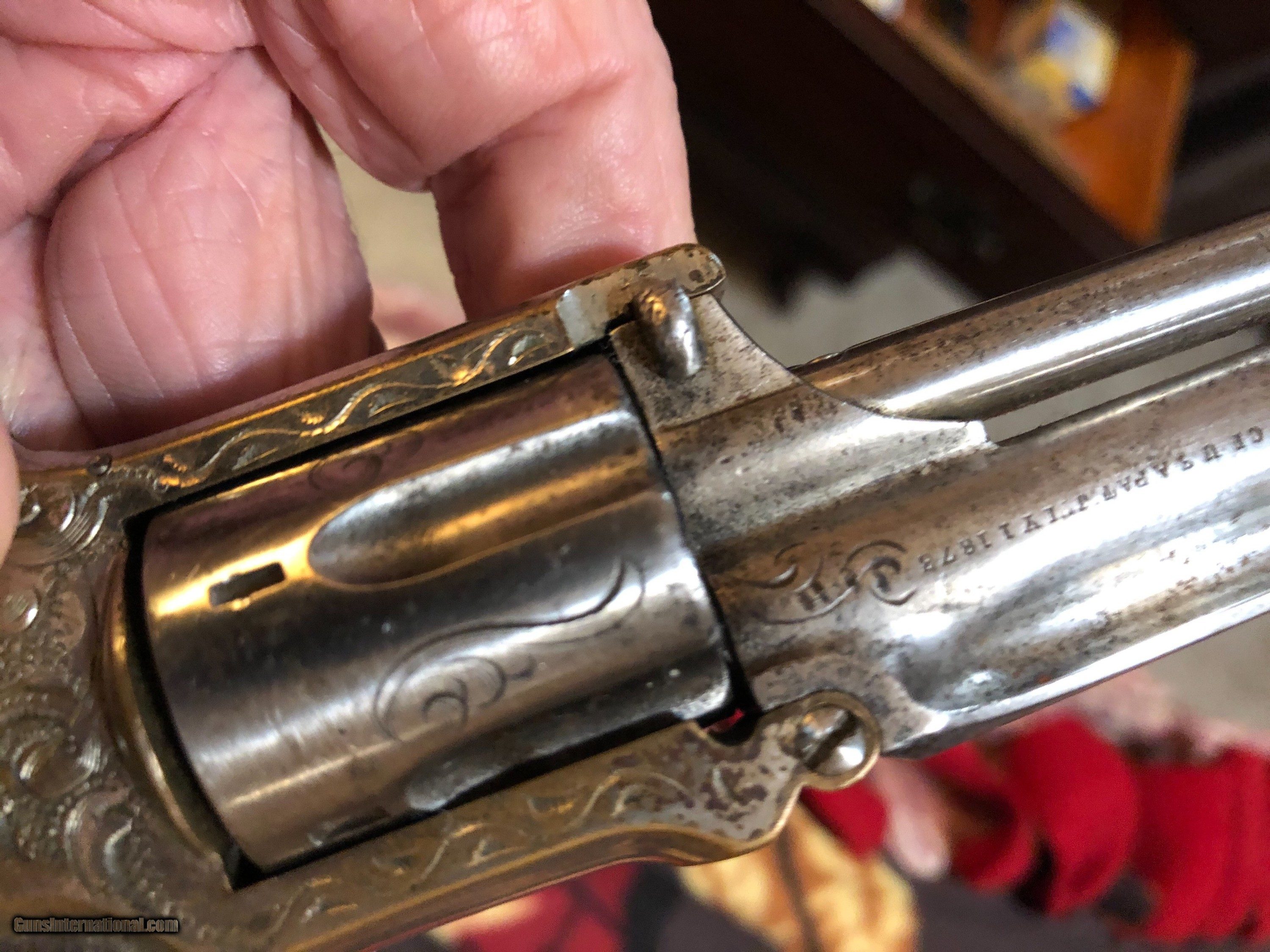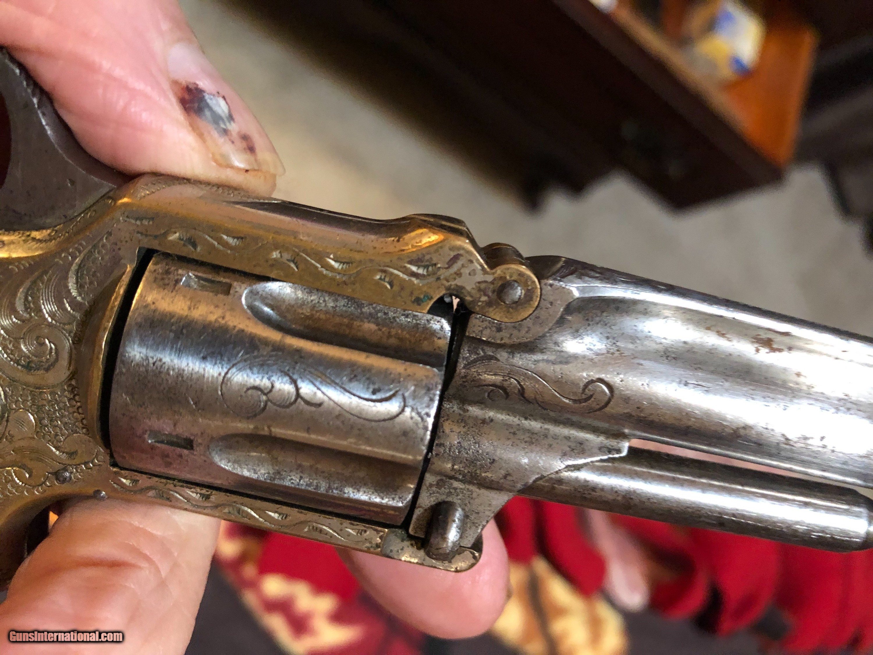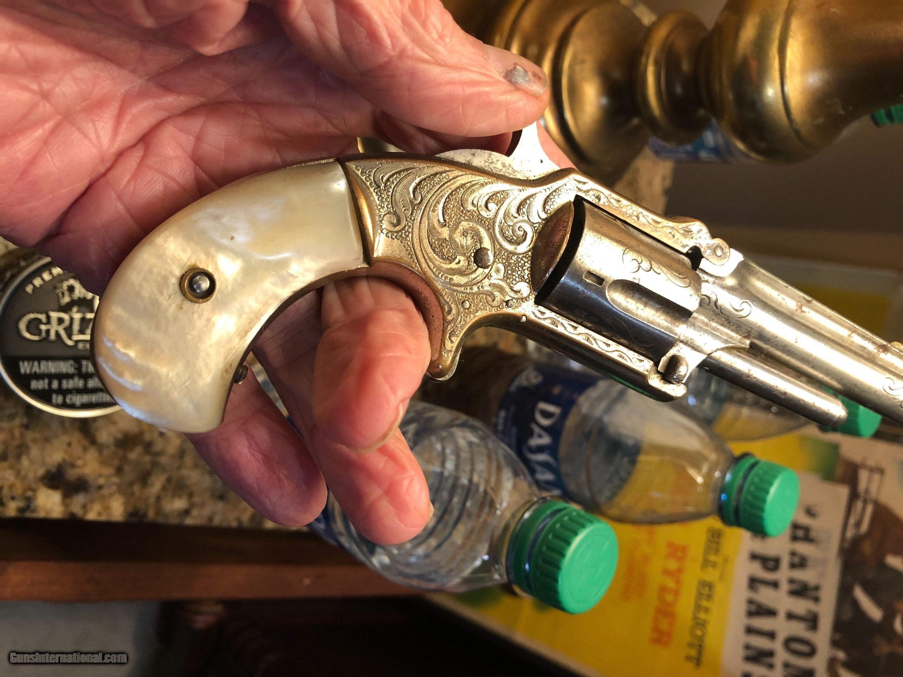 Description: This is a beautiful engraved bottom break revolver comes in 32 cal it has beautiful pearl pistol grips original with no breaks or chips I can see very little wears on engraving with exception of barrel must have been holstered it is very tight and handles as it should bi beleuve it is priced too cheap but am selling for an individual that does not collect guns beleuve it was left to him in a home he inherited and he found it in drawer I Wesson watching tales of Wells Fargo the other night when a lady pulled one out of her purse just like it SOLD Curio/Relic: Yes Antique: Yes Handgun Caliber: .32 S&W Manufacturer: Marlin Model: 1875 Serial Number: 982 Barrel Length: 3 inches Chambers: 5 I think Condition: Very good Metal Condition: Excellent Bore Condition: Good a little rust Action: Maybe single and double Triggers: One Stock: Pearl handle Manufacture Date: 1875 Engraving: All over Item Location: Lagrange ga |